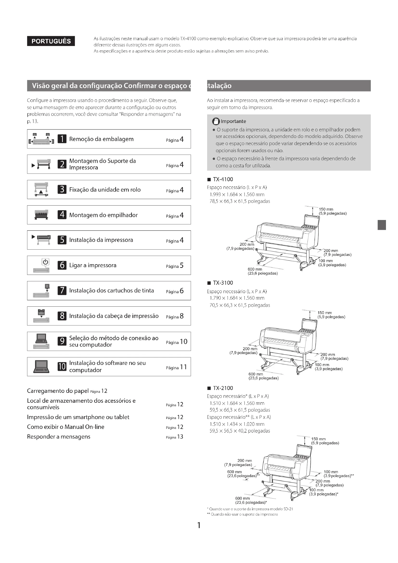 Selecione Ler o Manual On-line (Read Online Manual). ●Realize as operações restantes seguindo as instruções na tela para exibir o Manual On-line. Marcas registradas Windows é uma marca comercial ou marca comercial registrada da Microsoft Corporation nos EUA e/ou em outros países.macOS e App Store são marcas comerciais da Apple Inc. registradas nos EUA e/ou em outros países. IOS é uma marca comercial registrada ou marca comercial registrada da Cisco nos EUA e/ou em outros países e é utilizada sob licença.Android é uma marca comercial ou marca comercial registrada da Google Inc. Google Play e o logotipo do Google Play são marcas comerciais da Google LLC.QR Code é uma marca comercial da DENSO WAVE INCORPORATED no Japão e/ou em outros países.13 Responder a mensagens Mensagens de erro podem aparecer na tela sensível ao toque do painel de controle durante a instalação da impressora. Elas nem sempre indicam um problema com a impressora, e a situação pode ser facilmente resolvida. As mensagens mais comuns e suas causas são listadas aqui com suas respectivas ações corretivas. Para obter detalhes sobre outras mensagens, consulte o Manual On-line. Mensagem Causa Ação corretiva O cartucho de tinta não está instalado. Instale o cartucho de tinta adequadamente. Não há nenhum cartucho de tinta carregado. Instale ou reinstale o cartucho de tinta. (Consulte as etapas 1 a 12 na p. 6 e p 7) O cartucho de tinta não está encaixado completamente. A cabeça de impressão não pode ser reconhecida corretamente. Abra a tampa superior e instale a cabeça de impressão correta. A cabeça de impressão não está instalada. Instalar a cabeça de impressão. (Consulte as etapas 1 a 10 na p. 8 e p 9) Há falha de contato elétrico na cabeça de impressão. Remova a cabeça de impressão, certifique-se de que não há detritos aderidos aos contatos elétricos da cabeça de impressão e do carro e reinstale a cabeça de impressão. Erro de hardware ECxx-xxxx (x representa uma letra ou um número) Ocorreu um erro da impressora. Desligue o dispositivo, aguarde alguns minutos e ligue novamente. O fixador da faixa ou a fita dentro da tampa superior não foi removido. Desligue a impressora, abra a tampa superior e remova a fita e o fixador da faixa; então, ligue a impressora. (Consulte as etapas 1 a 4 na p. 5) Você pode ter encontrado um erro que não pode ser resolvido. Desligue a impressora e aguarde pelo menos 3 segundos antes de restaurar a alimentação. Se a mensagem aparecer novamente, anote o código e a mensagem do erro, desligue a impressora e entre em contato com o seu revendedor Canon para obter ajuda. Erro Ecxxx-xxxx (x representa uma letra ou um número) Ocorreu um erro da impressora. Consulte o manual e contate o centro de assistência. Você pode ter encontrado um erro que não pode ser resolvido. Anote o código e a mensagem do erro, desligue a impressora e entre em contato com o seu revendedor Canon para obter ajuda.Notas1 Información general sobre la configuración Confirmación del espacio de instalación Para fines de explicación, las ilustraciones de este manual hacen referencia a TX-4100 a modo de ejemplo. Tenga en cuenta que, en algunos casos, la impresora podría ser diferente de estas ilustraciones.Las especificaciones y la apariencia de este producto podrían cambiar sin previo aviso.Configure la impresora de acuerdo con el siguiente procedimiento. Tenga en cuenta que si aparece un mensaje de error durante la configuración o se produce algún otro problema, deberá consultar "Respuesta a los mensajes" en la p. 13. Retirada del material de embalajePágina 4 Montaje del Soporte de la impresoraPágina 4 Conexión de la unidad de rolloPágina 4 Montaje del apiladorPágina 4 Instalación de la impresoraPágina 4 Encendido de la impresoraPágina 5 Instalación de los depósitos de tintaPágina 6 Instalación del cabezal de impresiónPágina 8 Selección del método de conexión a su ordenadorPágina 10 Instalación del software en su ordenadorPágina 11Carga del papel Página 12Ubicación de almacenamiento para accesorios y consumiblesPágina 12Impresión desde un teléfono inteligente o tabletaPágina 12Visualización del Manual en líneaPágina 12Respuesta a los mensajesPágina 13Al instalar la impresora, se recomienda asegurarse de tener el espacio que se indica a continuación alrededor de la impresora. Importante●El soporte de la impresora, la unidad de rollo y el apilador podrían ser opciones en función del modelo que haya adquirido. Tenga en cuenta que el espacio necesario diferirá en función de que las opciones se utilicen o no.●El espacio requerido delante de la impresora variará dependiendo de cómo se utilice la cesta. ■TX-4100 Espacio requerido (an. x pr. x al.)1.993 × 1.684 × 1.560 mm78,5 × 66,3 × 61,5 pulgadas 100 mm (3,9 pulgadas) 200 mm (7,9 pulgadas) 600 mm (23,6 pulgadas) 200 mm (7,9 pulgadas) 150 mm (5,9 pulgadas) ■TX-3100 Espacio requerido (an. x pr. x al.)1.790 × 1.684 × 1.560 mm70,5 × 66,3 × 61,5 pulgadas 200 mm (7,9 pulgadas) 100 mm (3,9 pulgadas) 600 mm (23,6 pulgadas) 200 mm (7,9 pulgadas) 150 mm (5,9 pulgadas) ■TX-2100 Espacio requerido* (an. x pr. x al.)1.510 × 1.684 × 1.560 mm59,5 × 66,3 × 61,5 pulgadasEspacio requerido** (an. x pr. x al.)1.510 × 1.434 × 1.020 mm59,5 × 56,5 × 40,2 pulgadas 150 mm (5,9 pulgadas) 200 mm (7,9 pulgadas) 200 mm (7,9 pulgadas) 100 mm (3,9 pulgadas)** 100 mm (3,9 pulgadas)* 600 mm (23,6 pulgadas)* 600 mm (23,6 pulgadas)**