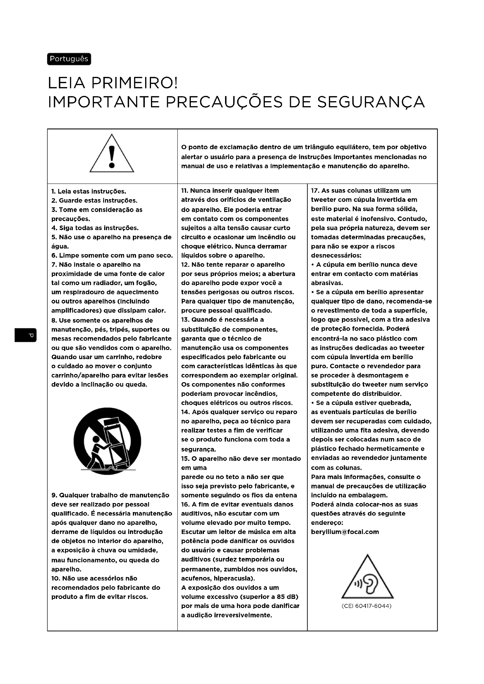- Se a cúpula estiver quebrada, as eventuais partículas de berílio devem ser recuperadas com cuidado, utilizando uma fita adesiva, devendo depois ser colocadas num saco de plástico fechado hermeticamente e enviadas ao revendedor juntamente com as colunas. Para mais informações, consulte o manual de precauções de utilização incluído na embalagem. Poderá ainda colocar-nos as suas questões através do seguinte endereço: beryllium@focal.com (CEI 60417-6044)27 SCALA UTOPIA