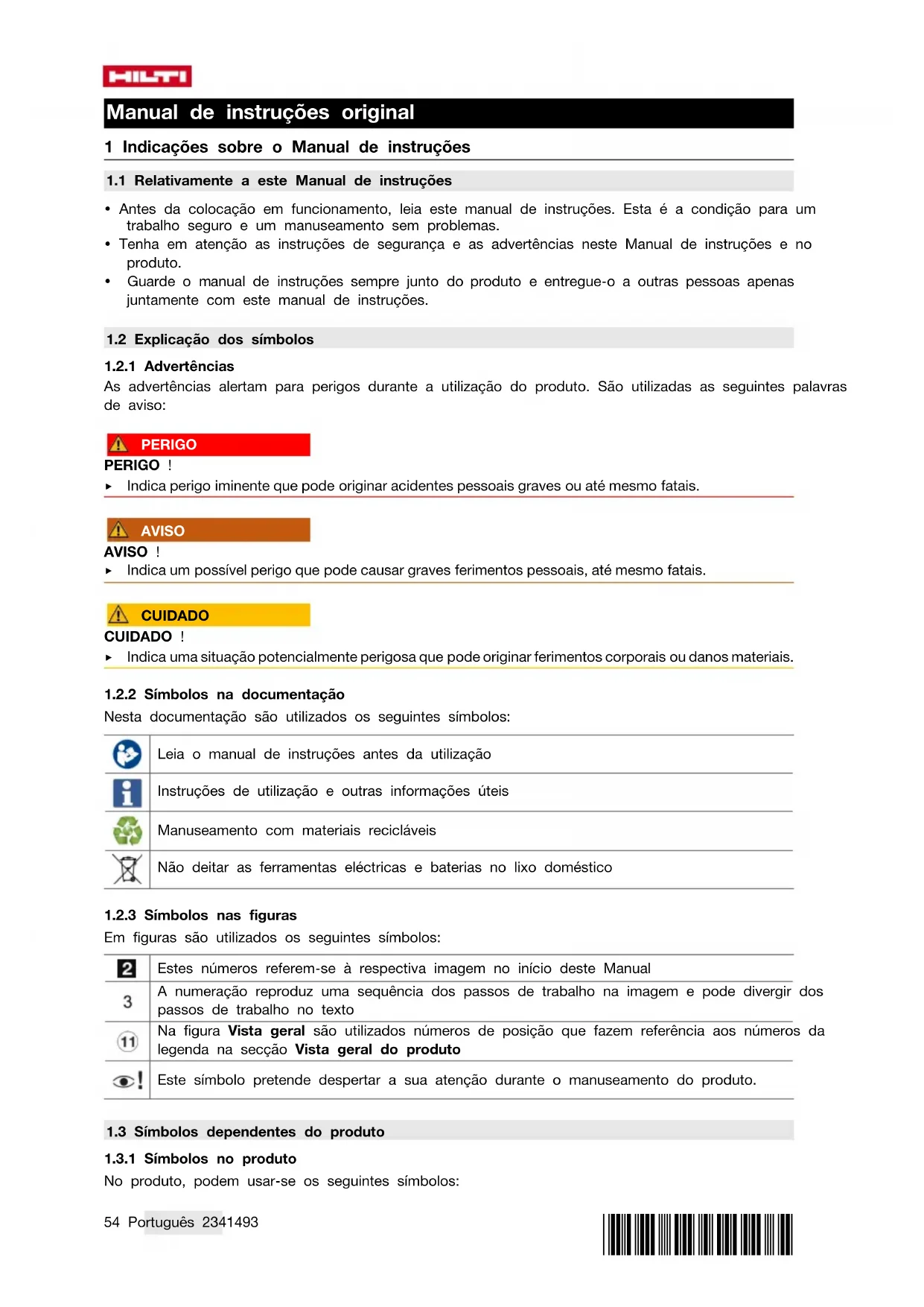 - Não opere o produto se existirem danos e/ou perturbações de funcionamento. Mande reparar o produto imediatamente no Centro de Assistência Técnica Hilti.
