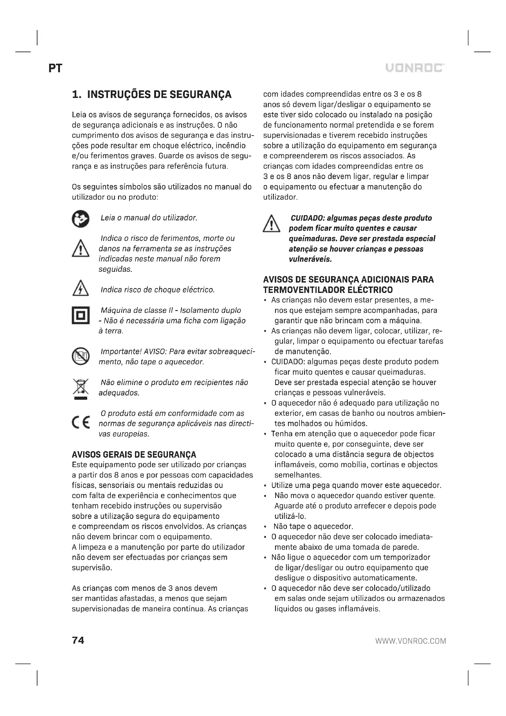 Problema Causa possível Solução Ruído anormal Não é possível colocar oequipamento na vertical Coloque oaquecedor numa superfície nivelada AMBIENTE Os equipamentos eléctricos ou electrónicos defeituosos e/ou eliminados devem ser recolhidos em locais de reciclagem adequados. Apenas para os países da CE Não elimine as ferramentas eléctricas em conjun- to com os resíduos domésticos. De acordo com adirectiva europeia 2012/19/UE sobre resíduos de equipamentos eléctricos eelectrónicos eares- pectiva implementação na legislação nacional, as ferramentas eléctricas que já não sejam utilizadas devem ser recolhidas em separado eeliminadas de maneira ecológica. GARANTIA Os produtos da VONROC são desenvolvidos de acordo com os padrões de qualidade mais ele- vados enão apresentam quaisquer defeitos em termos de materiais emão-de-obra em relação ao período estipulado por lei, cujo início é apartir da data de compra original. Se oproduto apresentar qualquer falha durante este período devido aqual- quer defeito no material e/ou de mão-de-obra, contacte aVONROC directamente. As seguintes circunstâncias estão excluídas desta garantia: