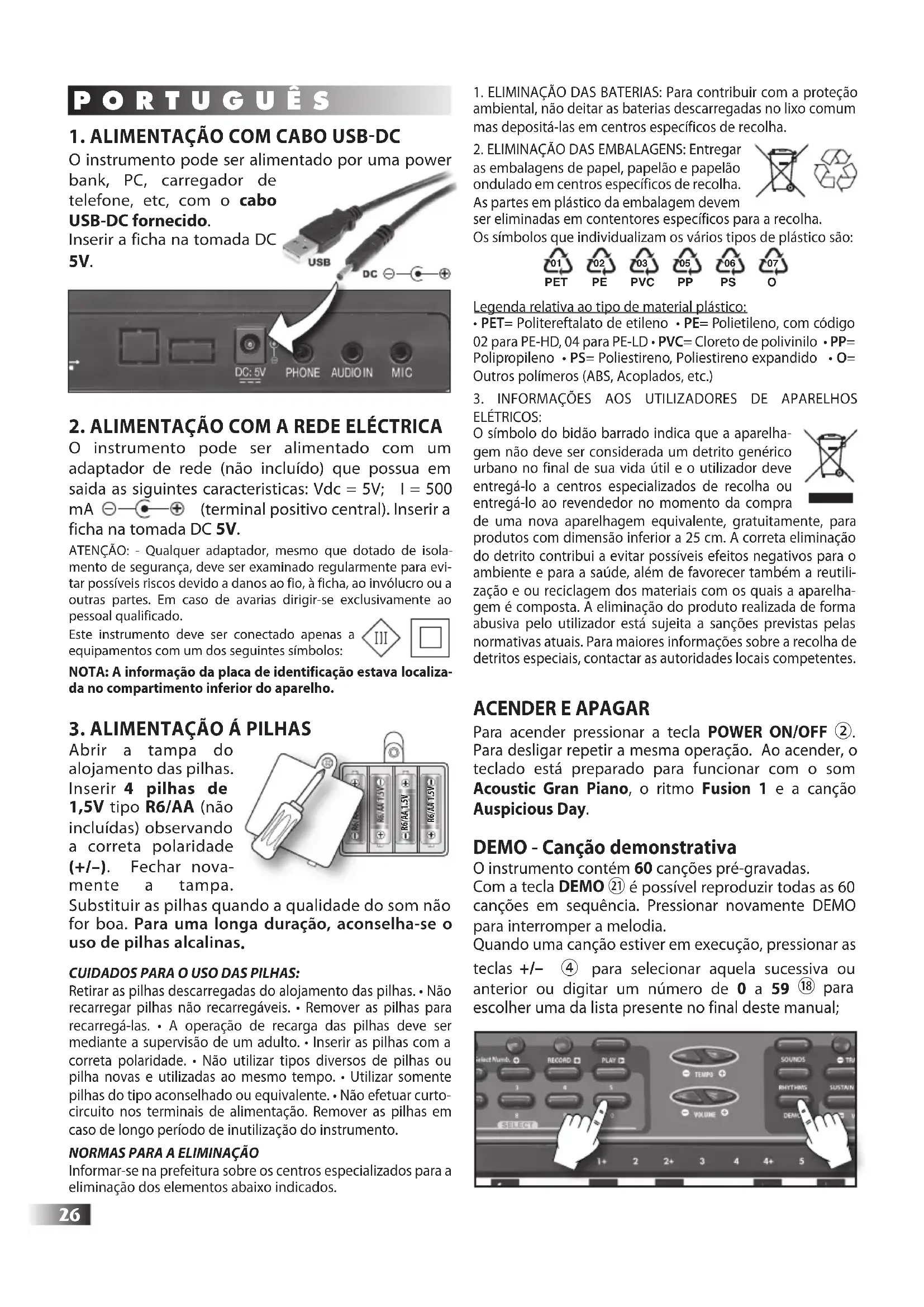 CUIDADOS PARA O USO DAS PILHAS: Retirar as pilhas descarregadas do alojamento das pilhas. • Não recarregar pilhas não recarregáveis. • Remover as pilhas para recarregá-las. • A operação de recarga das pilhas deve ser mediante a supervisão de um adulto. • Inserir as pilhas com a correta polaridade. • Não utilizar tipos diversos de pilhas ou pilha novas e utilizadas ao mesmo tempo. • Utilizar somente pilhas do tipo aconselhado ou equivalente. • Não efetuar curto-circuito nos terminais de alimentação. Remover as pilhas em caso de longo período de inutilização do instrumento.NORMAS PARA A ELIMINAÇÃOInformar-se na prefeitura sobre os centros especializados para a eliminação dos elementos abaixo indicados.1. ELIMINAÇÃO DAS BATERIAS: Para contribuir com a proteção ambiental, não deitar as baterias descarregadas no lixo comum mas depositá-las em centros específicos de recolha.2. ELIMINAÇÃO DAS EMBALAGENS: Entregar as embalagens de papel, papelão e papelão ondulado em centros específicos de recolha. As partes em plástico da embalagem devem ser eliminadas em contentores específicos para a recolha.Os símbolos que individualizam os vários tipos de plástico são:Legenda relativa ao tipo de material plástico: