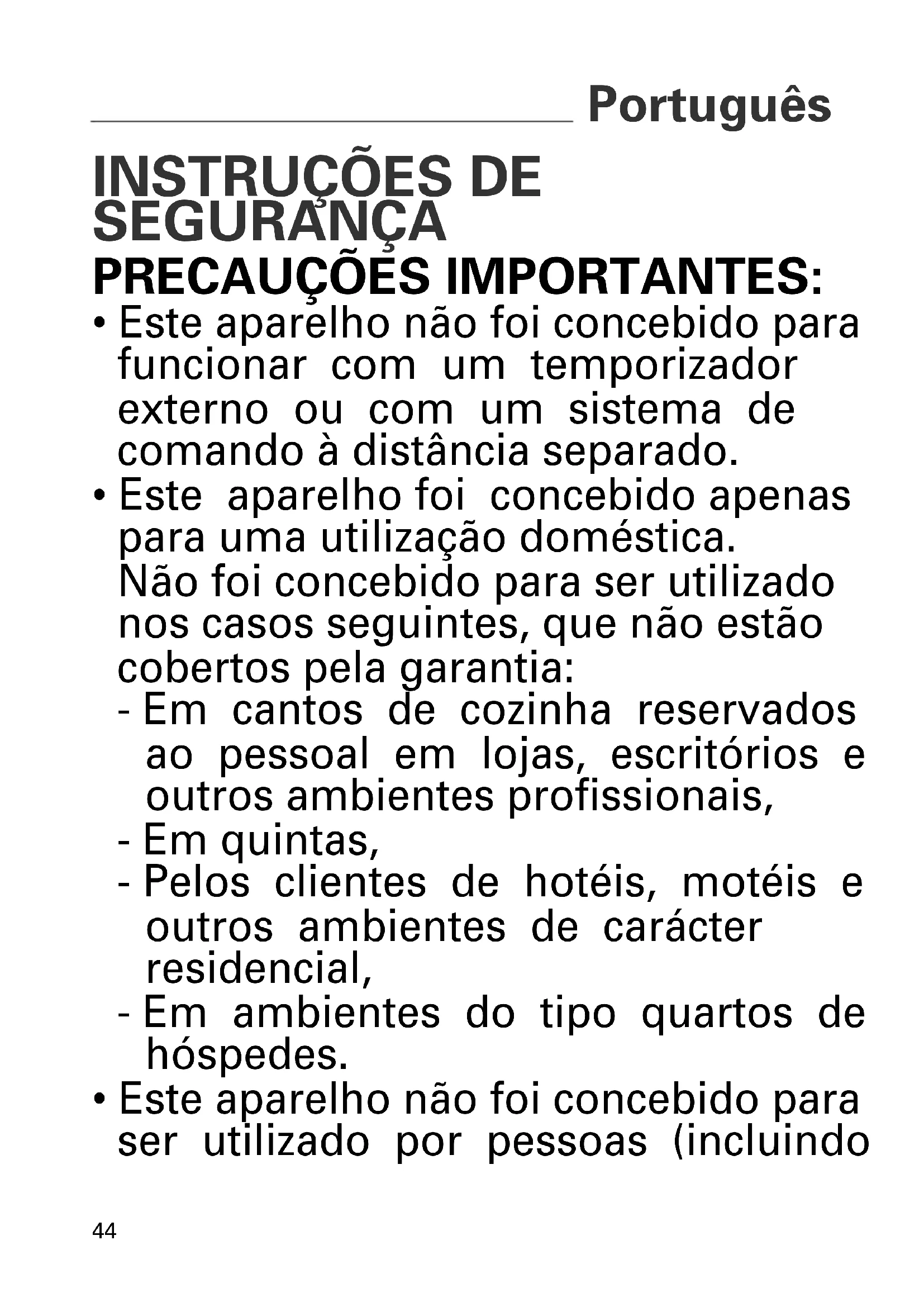 - Este aparelho foi concebido apenas para uma utilização doméstica. Não foi concebido para ser utilizado nos casos seguintes, que não estão cobertos pela garantia: - Em cantos de cozinha reservados ao pessoal em lojas, escritórios e outros ambientes profissionais, - Em quintas, - Pelos clientes de hotéis, motéis e outros ambientes de carácter residencial, - Em ambientes do tipo quartos de hóspedes.