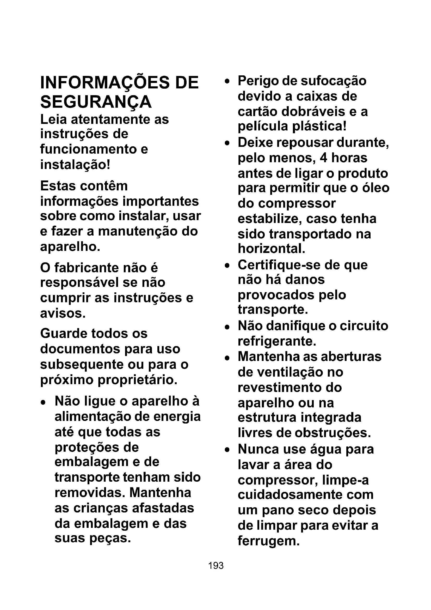 SEGURANÇA Leia atentamente as instruções de funcionamento e instalação! Estas contêm informações importantes sobre como instalar, usar e fazer a manutenção do aparelho. O fabricante não é responsável se não cumprir as instruções e avisos. Guarde todos os documentos para uso subsequente ou para o próximo proprietário.