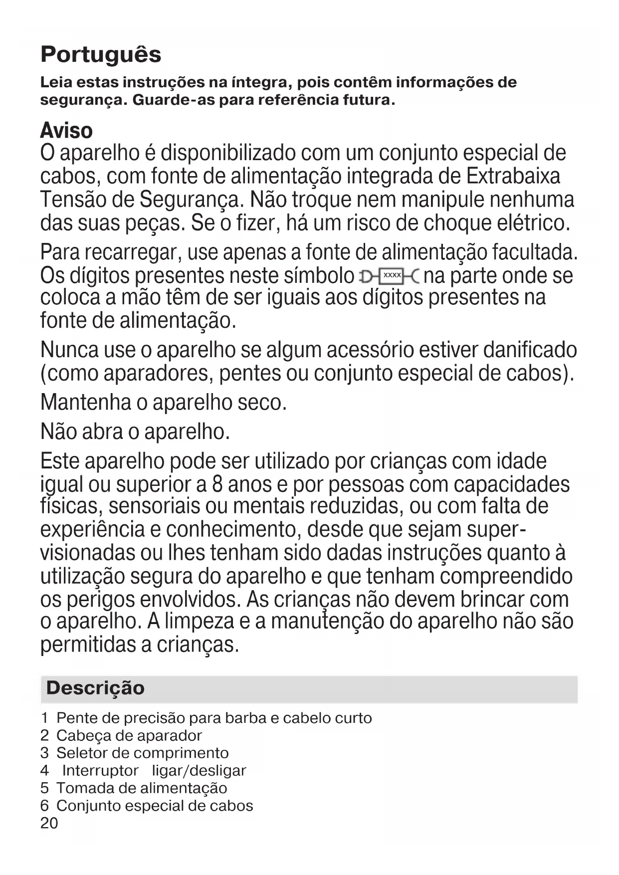 90618446_Type5516_BT_3222_3221_3220_MN_ANZ.indd 1990618446_Type5516_BT_3222_3221_3220_MN_ANZ.indd 19 17.06.19 13:4217.06.19 13:42 Business Use - P&G AUTHORIZED POA-00141023 Rev 001 Effective Date 2019-06-24 Printed 2022-01-12 Page 19 of 4420 Português Leia estas instruções na íntegra, pois contêm informações de segurança. Guarde-as para referência futura. Aviso O aparelho é disponibilizado com um conjunto especial de cabos, com fonte de alimentação integrada de Extrabaixa Tensão de Segurança. Não troque nem manipule nenhuma das suas peças. Se o fizer, há um risco de choque elétrico. Para recarregar, use apenas a fonte de alimentação facultada. Os dígitos presentes neste símbolo xxxx na parte onde se coloca a mão têm de ser iguais aos dígitos presentes na fonte de alimentação. Nunca use o aparelho se algum acessório estiver danificado (como aparadores, pentes ou conjunto especial de cabos). Mantenha o aparelho seco. Não abra o aparelho. Este aparelho pode ser utilizado por crianças com idade igual ou superior a 8 anos e por pessoas com capacidades físicas, sensoriais ou mentais reduzidas, ou com falta de experiência e conhecimento, desde que sejam super- visionadas ou lhes tenham sido dadas instruções quanto à utilização segura do aparelho e que tenham compreendido os perigos envolvidos. As crianças não devem brincar com o aparelho. A limpeza e a manutenção do aparelho não são permitidas a crianças. Descrição 1 Pente de precisão para barba e cabelo curto 2 Cabeça de aparador 3 Seletor de comprimento 4 Interruptor ligar/desligar 5 Tomada de alimentação 6 Conjunto especial de cabos 90618446_Type5516_BT_3222_3221_3220_MN_ANZ.indd 2090618446_Type5516_BT_3222_3221_3220_MN_ANZ.indd 20 17.06.19 13:4217.06.19 13:42 Business Use - P&G AUTHORIZED POA-00141023 Rev 001 Effective Date 2019-06-24 Printed 2022-01-12 Page 20 of 4421 7 Indicador de carregamento Para obter as especificações elétricas, consulte as instruções impressas no conjunto especial de cabos. Carregamento A temperatura ambiente recomendada para carregar é de 5 °C a 35 °C. A bateria poderá não carregar adequadamente, ou de todo, em condições de temperaturas extremamente baixas ou altas. A temperatura ambiente recomendada para aparar é de 15 °C a 35 °C. Não expor o aparelho a tempe- raturas superiores a 50 °C por períodos prolongados.