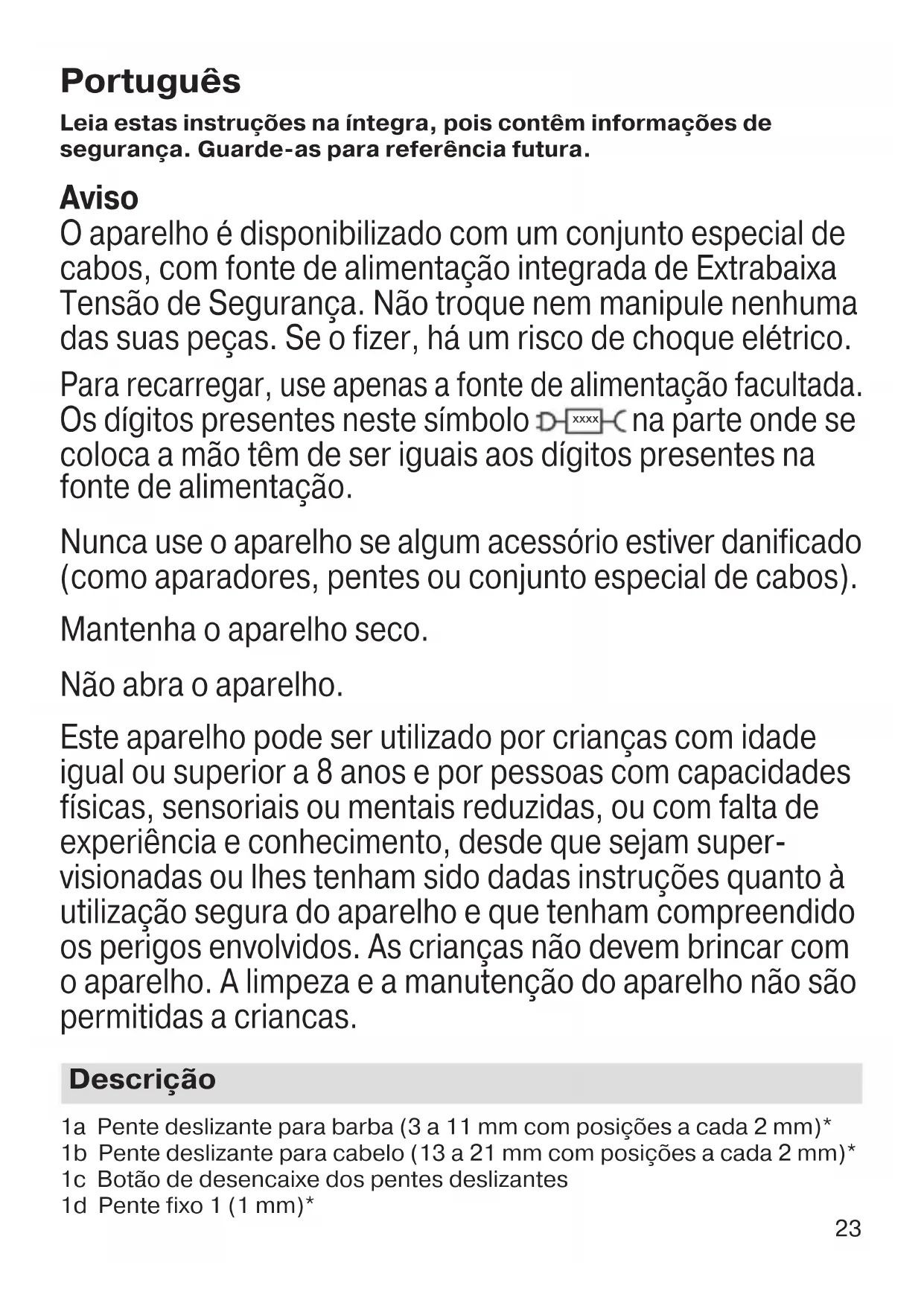 90640284_Type5513_MGK3225_3221_3220_MN_ANZ.indd 2290640284_Type5513_MGK3225_3221_3220_MN_ANZ.indd 22 13.06.19 14:4213.06.19 14:42 Business Use - P&G AUTHORIZED POA-00139280 Rev 001 Effective Date 2019-06-17 Printed 2020-05-04 Page 22 of 5623 Português Leia estas instruções na íntegra, pois contêm informações de segurança. Guarde-as para referência futura. Aviso O aparelho é disponibilizado com um conjunto especial de cabos, com fonte de alimentação integrada de Extrabaixa Tensão de Segurança. Não troque nem manipule nenhuma das suas peças. Se o fizer, há um risco de choque elétrico. Para recarregar, use apenas a fonte de alimentação facultada. Os dígitos presentes neste símbolo xxxx na parte onde se coloca a mão têm de ser iguais aos dígitos presentes na fonte de alimentação. Nunca use o aparelho se algum acessório estiver danificado (como aparadores, pentes ou conjunto especial de cabos). Mantenha o aparelho seco. Não abra o aparelho. Este aparelho pode ser utilizado por crianças com idade igual ou superior a 8 anos e por pessoas com capacidades físicas, sensoriais ou mentais reduzidas, ou com falta de experiência e conhecimento, desde que sejam super- visionadas ou lhes tenham sido dadas instruções quanto à utilização segura do aparelho e que tenham compreendido os perigos envolvidos. As crianças não devem brincar com o aparelho. A limpeza e a manutenção do aparelho não são permitidas a criancas. Descrição 1a Pente deslizante para barba (3 a 11 mm com posições a cada 2 mm)* 1b Pente deslizante para cabelo (13 a 21 mm com posições a cada 2 mm)* 1c Botão de desencaixe dos pentes deslizantes 1d Pente fixo 1 (1 mm)* 90640284_Type5513_MGK3225_3221_3220_MN_ANZ.indd 2390640284_Type5513_MGK3225_3221_3220_MN_ANZ.indd 23 13.06.19 14:4213.06.19 14:42 Business Use - P&G AUTHORIZED POA-00139280 Rev 001 Effective Date 2019-06-17 Printed 2020-05-04 Page 23 of 5624 1e Pente fixo 2 (2 mm)* 2a Cabeça de aparador 2b Cabeça de aparador para orelhas e nariz* 2c Cabeça de aparador para detalhes* 3 Interruptor ligar/desligar 4 Tomada de alimentação 5 Conjunto especial de cabos 6 Indicador de carregamento