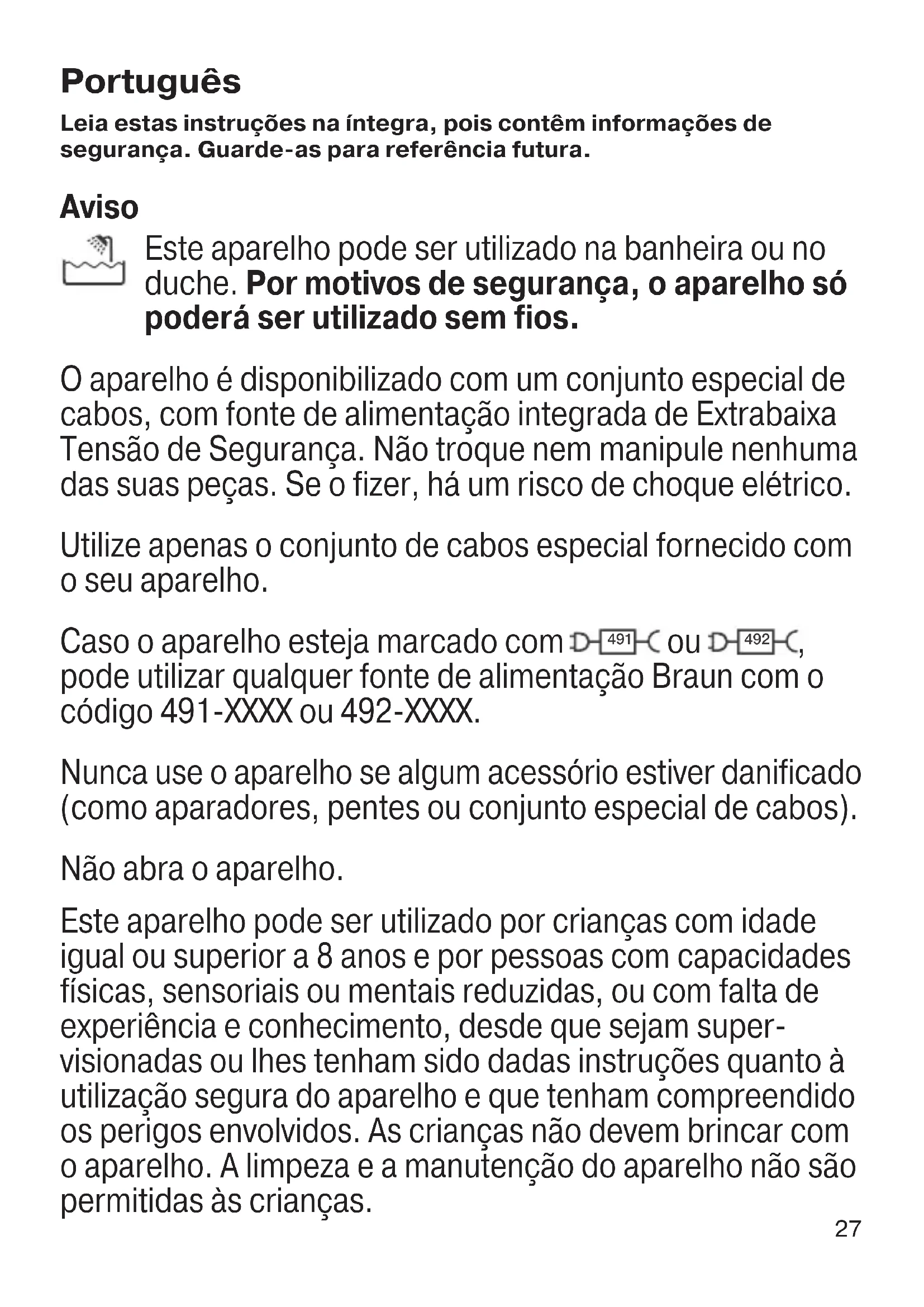 - Para manter o bom funcionamento dos acessórios, lubrifique frequentemente o aparador e as lâminas com uma gota de óleo lubrificante (não incluído). Aviso ambiental Este produto contém uma bateria e/ou resíduos elétricos recicláveis. Com o intuito de proteger o ambiente, não elimine o produto junta- mente com o lixo doméstico. Entregue-o num dos pontos de recolha de resíduos elétricos à disposição no seu país. Sujeito a alterações sem aviso prévio. Garantia Braun concede a este produto 2 anos de garantia a partir da data de com- pra. Dentro do período de garantia qualquer defeito do aparelho, devido aos materiais ou ao seu fabrico, será reparado, substituindo peças ou trocando por um aparelho novo segundo o nosso critério, sem qualquer custo. Dependendo da disponibilidade, a substituição poderá resultar de uma cor diferente ou de um modelo equivalente. A garantia não cobre avarias por utilização indevida, funcionamento a volta- gem diferente da indicada, ligação a uma tomada de corrente elétrica incor- 90590980_MGK7221MGK7220MGK7920MGK5280 MN_ANZ.indd 3090590980_MGK7221MGK7220MGK7920MGK5280 MN_ANZ.indd 30 11.06.19 12:0011.06.19 12:00 Business Use - P&G AUTHORIZED POA-00138563 Rev 001 Effective Date 2019-06-13 Printed 2022-03-31 Page 30 of 6431 reta, rutura, utilização ou desgaste normal (p. ex.: rede e bloco de lâminas), defeitos com um efeito insignificante no valor ou no funcionamento do pro- duto. A garantia perderá o seu efeito no caso de serem efetuadas reparações por pessoas não autorizadas ou se não forem utilizados acessórios originais Braun. A garantia só é válida se a data de compra fôr confirmada pela apresenta- ção da fatura ou documento de compra correspondente. Esta garantia é válida para todos os países onde este produto seja distri- buído por Braun ou por um distribuidor Braun autorizado. No caso de reclamação ao abrigo de garantia, dirija-se ao Serviço de Assistência Técnica Oficial Braun mais próximo: www.service.braun.com. Só para Portugal Apoio ao consumidor: Para localizar o seu Serviço Braun mais próximo o no caso de surgir alguma dúvida relativamente ao funcionamiento deste pro- duto, contacte por favor este serviço pelo telefone 808 20 00 33. 90590980_MGK7221MGK7220MGK7920MGK5280 MN_ANZ.indd 3190590980_MGK7221MGK7220MGK7920MGK5280 MN_ANZ.indd 31 11.06.19 12:0011.06.19 12:00 Business Use - P&G AUTHORIZED POA-00138563 Rev 001 Effective Date 2019-06-13 Printed 2022-03-31 Page 31 of 6432 Italiano Leggere attentamente queste istruzioni, contengono informazioni di sicurezza. Conservarle per una consultazione futura. Attenzione Questo apparecchio è adatto per un utilizzo nella vasca da bagno o sotto la doccia. Per ragioni di sicurezza può essere utilizzato solo senza fili. L’apparecchio è fornito di uno speciale cavo di alimentazione dotato di un sistema integrato di sicurezza a basso voltag- gio. Non sostituire o manomettere nessuna sua parte. In caso contrario, sussiste il rischio di scosse elettriche. Utilizzare solo il cavo speciale fornito con l’apparecchio. Se l’apparecchio è contrassegnato da