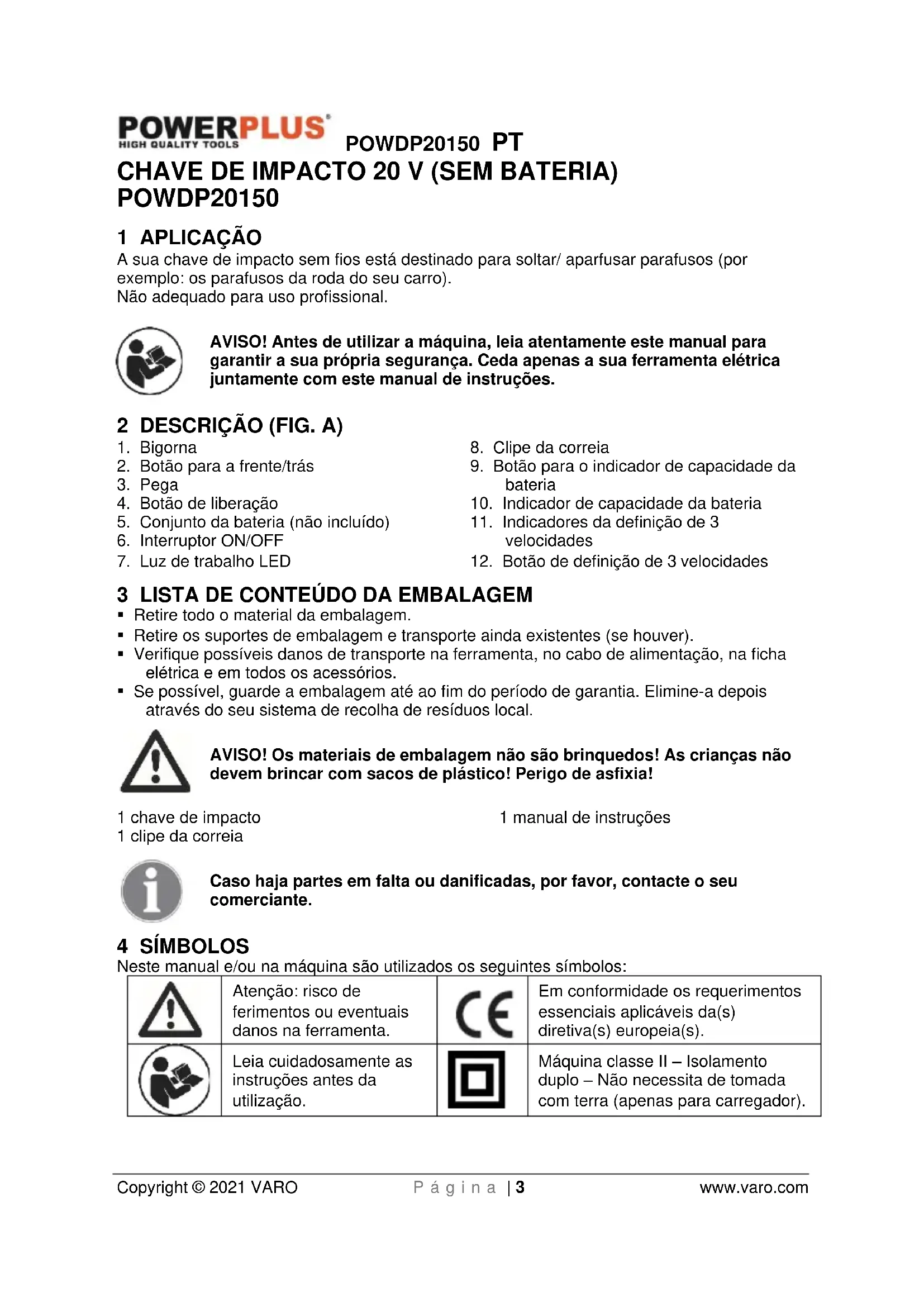 Máquina classe II – Isolamento duplo – Não necessita de tomada com terra (apenas para carregador).POWDP20150 PT Copyright © 2021 VARO P á g i n a | 4 www.varo.com