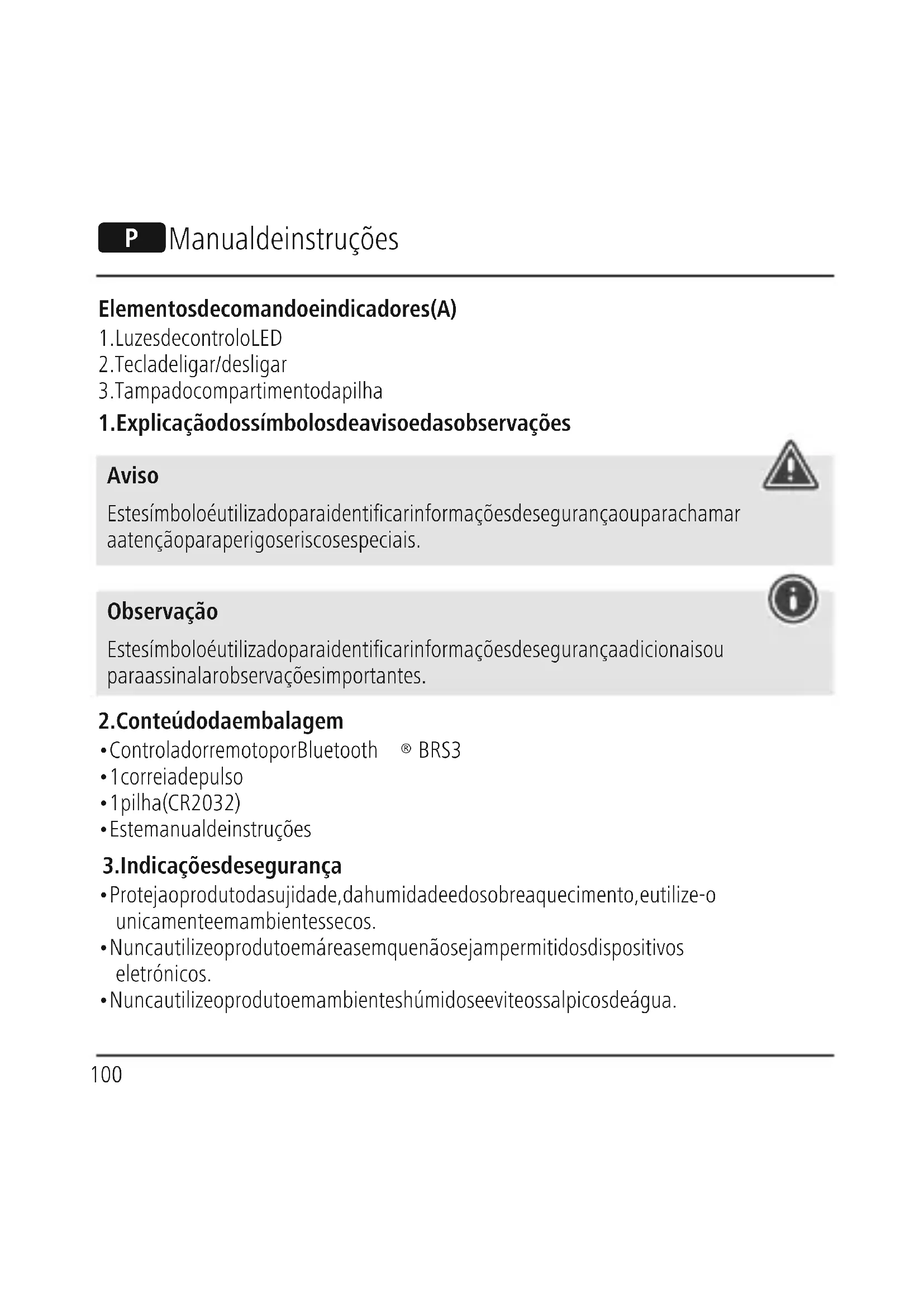 - Nunca utilize o produto em ambientes húmidos e evite os salpicos de água. O Manual de instruções101