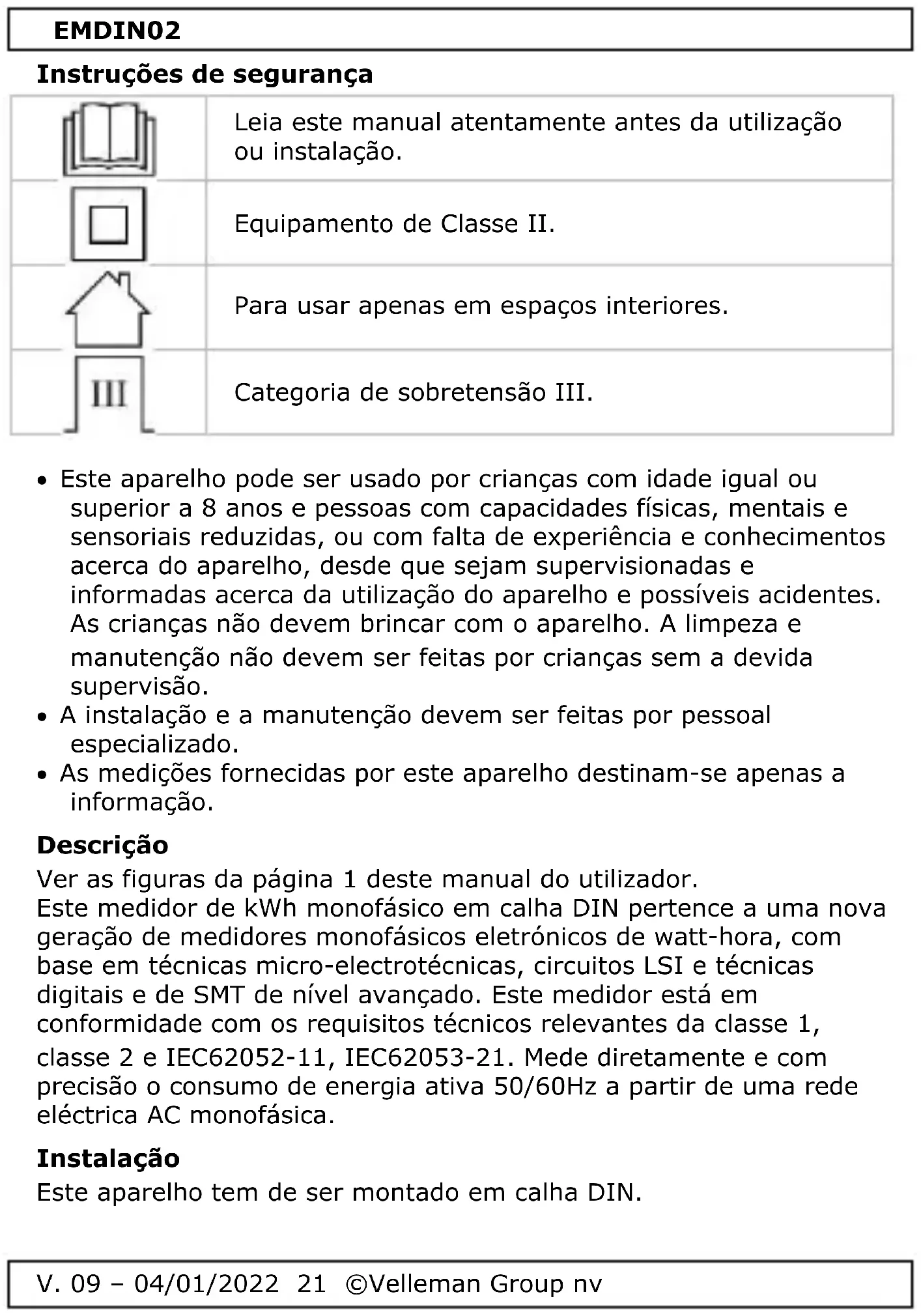 MONOFÁSICO - MEDIDOR DE kWh PARA MONTAGEM EM DIN-RAIL - 2 MÓDULOS - PARA USO PROFISSIONAL Aos cidadãos da União Europeia Importantes informações sobre o meio ambiente no que respeita a este produto Este símbolo no aparelho ou na embalagem indica que, enquanto desperdícios, poderão causar danos no meio ambiente. Não deite o aparelho (nem as pilhas, se as houver) no lixo doméstico; dirija-se a uma empresa especializada em reciclagem. Devolva o aparelho ao seu distribuidor ou ao posto de reciclagem local. Respeite a legislação local relativa ao meio ambiente. Em caso de dúvidas, contacte com as autoridades locais para os resíduos. Obrigada por escolher a Velleman! Leia atentamente as instruções do manual antes de usar o aparelho. Caso o aparelho tenha sofrido algum dano durante o transporte não o instale e entre em contacto com o seu distribuidor.EMDIN02