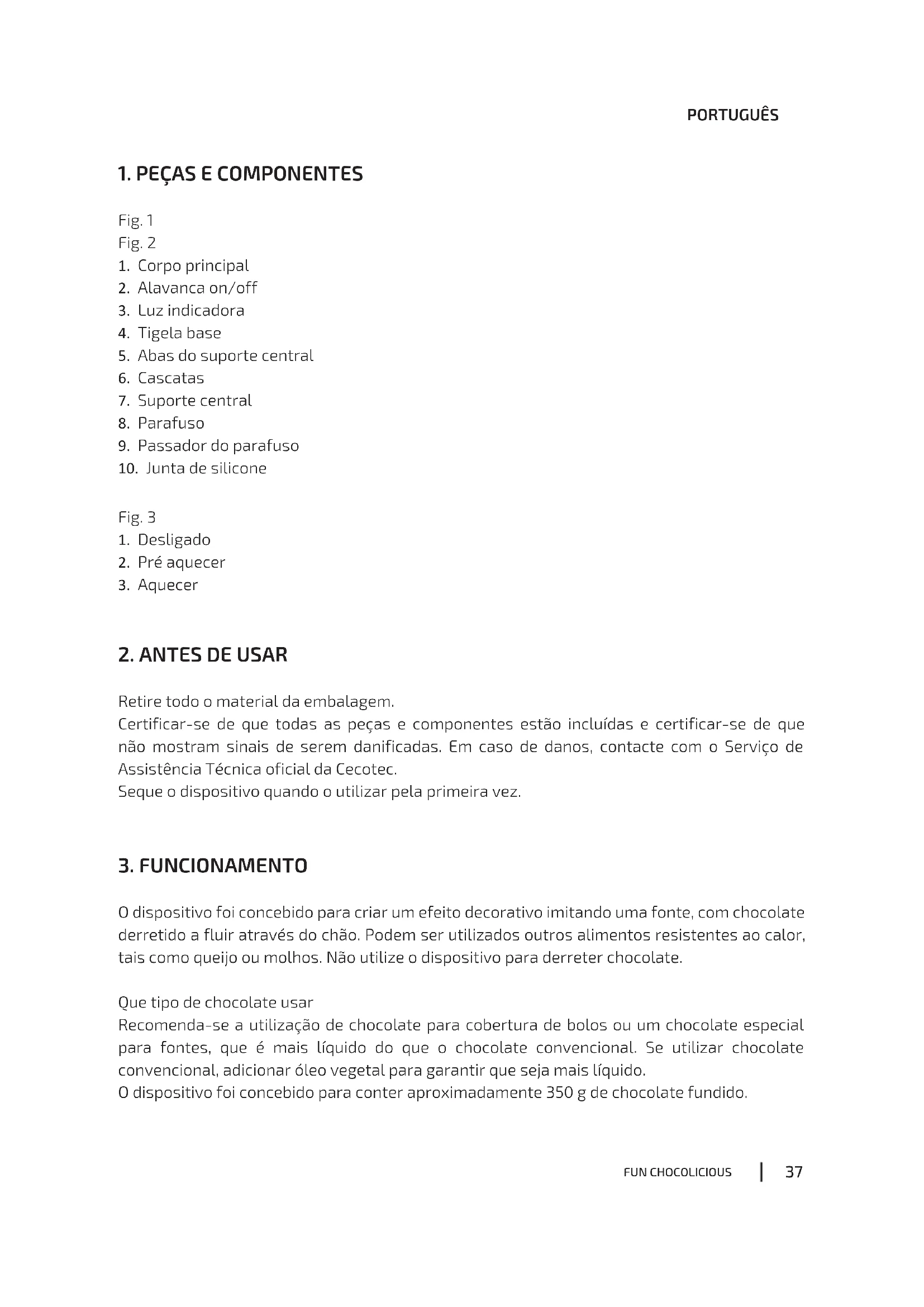 O dispositivo foi concebido para criar um efeito decorativo imitando uma fonte, com chocolate derretido a fluir através do chão. Podem ser utilizados outros alimentos resistentes ao calor, tais como queijo ou molhos. Não utilize o dispositivo para derreter chocolate. Que tipo de chocolate usar Recomenda-se a utilização de chocolate para cobertura de bolos ou um chocolate especial para fontes, que é mais líquido do que o chocolate convencional. Se utilizar chocolate convencional, adicionar óleo vegetal para garantir que seja mais líquido. O dispositivo foi concebido para conter aproximadamente 350 g de chocolate fundido. 08020_Fun Chocolicious_Manual_YV_01200724.indd 3708020_Fun Chocolicious_Manual_YV_01200724.indd 37 24/7/20 12:5324/7/20 12:53FUN CHOCOLICIOUS