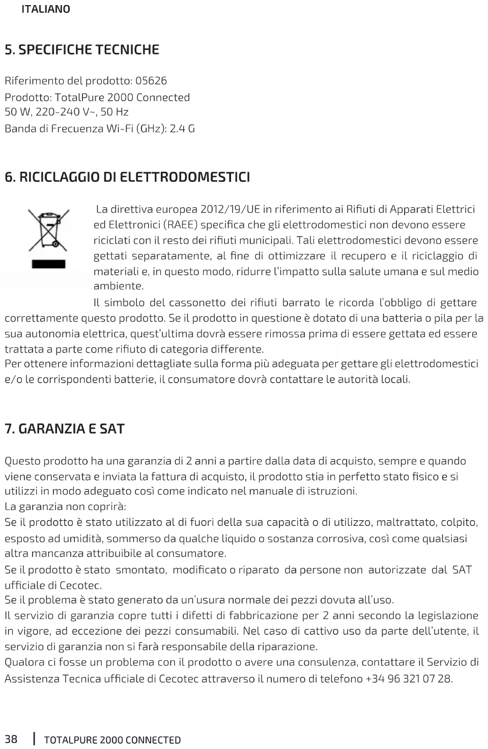 Este produto tem uma garantia de 2 anos desde a data de compra, sempre e quando se conserve e envie a fatura de compra, o produto esteja em perfeito estado físico e se lhe dê um uso adequado tal e como se indica neste Manual de Instruções. A garantia não cobrirá: Se o produto tiver sido usado fora da sua capacidade ou utilidade, maltratado, batido, exposto à humidade, submergido em algum líquido ou substância corrosiva, assim como qualquer outra falta atribuível ao consumidor. Se o produto foi desmontado, modicado ou reparado por pessoas não autorizadas pelo SAT ocial da Cecotec. Se a ocorrência foi originada pelo desgaste normal das peças devido ao uso.43 PORTUGUÊS TOTALPURE 2000 CONNECTED O serviço de garantia cobre todos os defeitos de fabricação durante 2 anos com base à legislação vigente, exceto peças consumíveis. Em caso de mal uso por parte do usuário, o serviço de garantia não se fará responsável pela reparação. Se em alguma ocasião deteta uma ocorrência com o produto ou tem alguma consulta, entre em contacto com o Serviço de Assistência Técnica ocial da Cecotec através do número de telefone +34 96 321 07 28.44 POLSKI TOTALPURE 2000 CONNECTED
