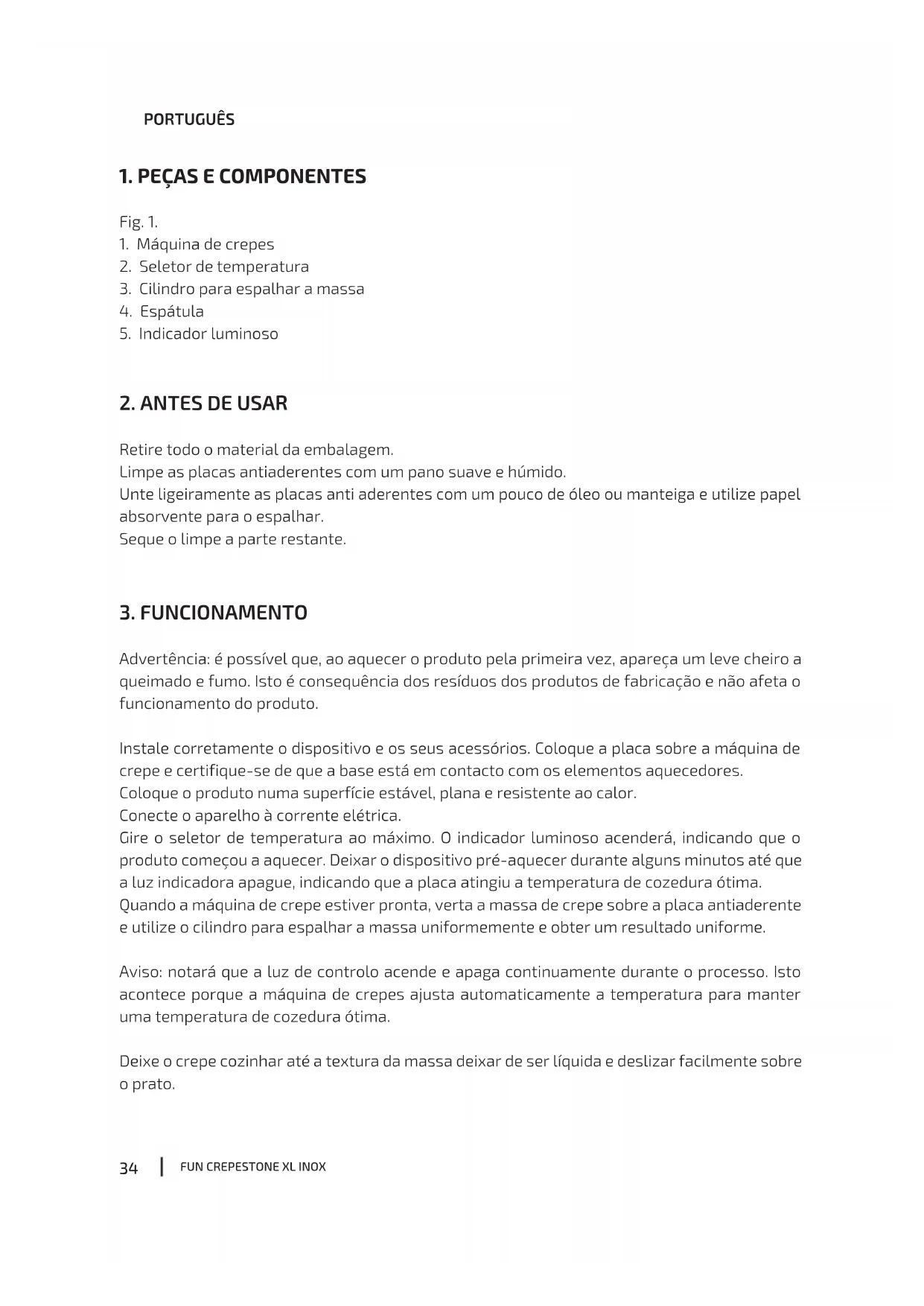 Advertência: é possível que, ao aquecer o produto pela primeira vez, apareça um leve cheiro a queimado e fumo. Isto é consequência dos resíduos dos produtos de fabricação e não afeta o funcionamento do produto. Instale corretamente o dispositivo e os seus acessórios. Coloque a placa sobre a máquina de crepe e certifique-se de que a base está em contacto com os elementos aquecedores. Coloque o produto numa superfície estável, plana e resistente ao calor. Conecte o aparelho à corrente elétrica. Gire o seletor de temperatura ao máximo. O indicador luminoso acenderá, indicando que o produto começou a aquecer. Deixar o dispositivo pré-aquecer durante alguns minutos até que a luz indicadora apague, indicando que a placa atingiu a temperatura de cozedura ótima. Quando a máquina de crepe estiver pronta, verta a massa de crepe sobre a placa antiaderente e utilize o cilindro para espalhar a massa uniformemente e obter um resultado uniforme. Aviso: notará que a luz de controlo acende e apaga continuamente durante o processo. Isto acontece porque a máquina de crepes ajusta automaticamente a temperatura para manter uma temperatura de cozedura ótima. Deixe o crepe cozinhar até a textura da massa deixar de ser líquida e deslizar facilmente sobre o prato. 08019_Crepera Fun Crepestone XL Inox_Manual_YV_01200723docx.indd 3408019_Crepera Fun Crepestone XL Inox_Manual_YV_01200723docx.indd 34 24/7/20 12:4824/7/20 12:48FUN CREPESTONE XL INOX