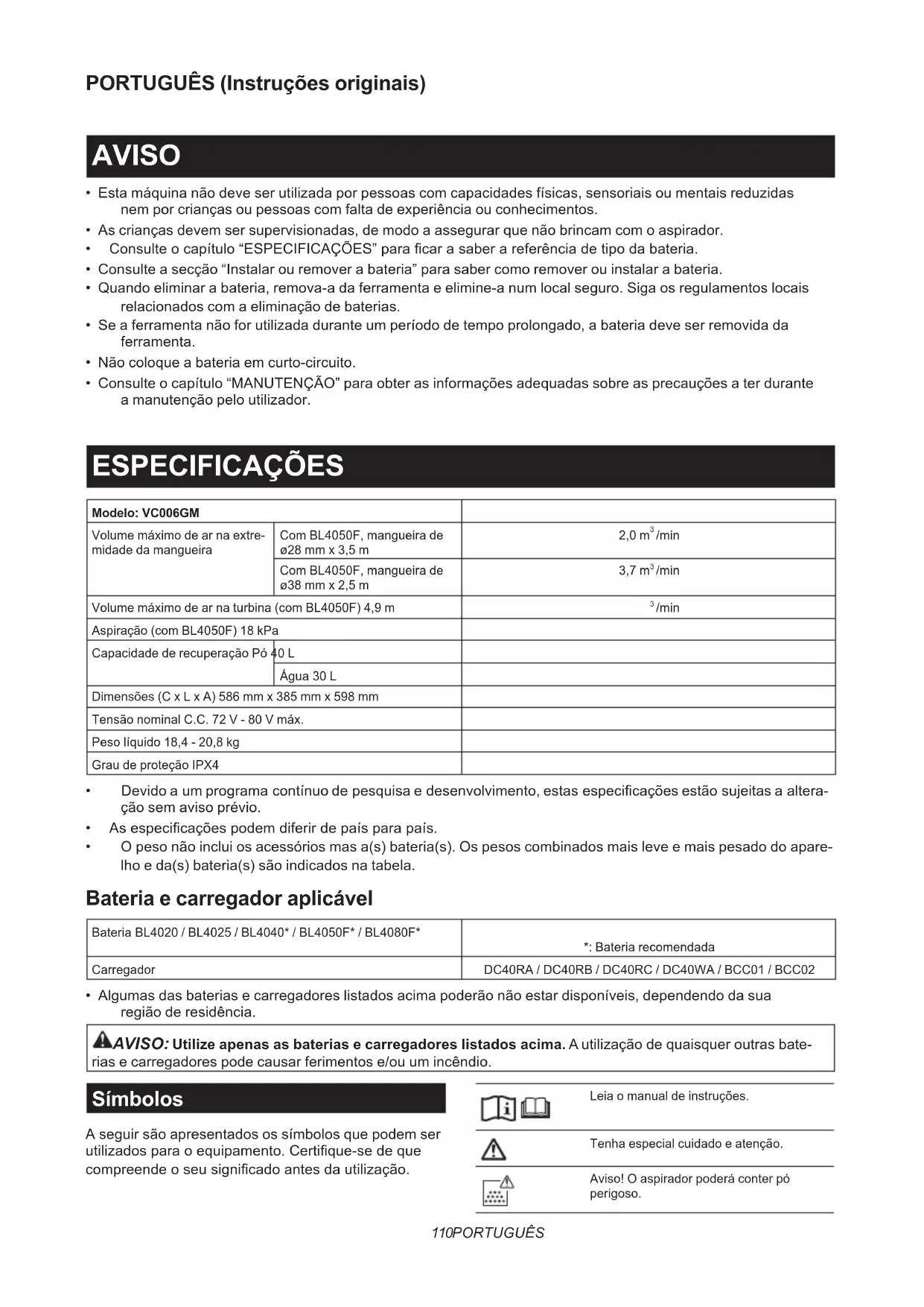 - Algumas das baterias e carregadores listados acima poderão não estar disponíveis, dependendo da sua região de residência. AVISO: Utilize apenas as baterias e carregadores listados acima. A utilização de quaisquer outras bate- rias e carregadores pode causar ferimentos e/ou um incêndio. Símbolos A seguir são apresentados os símbolos que podem ser utilizadosparaoequipamento.Certique-sedeque compreendeoseusignicadoantesdautilização. Leia o manual de instruções. Tenha especial cuidado e atenção. Aviso! O aspirador poderá conter pó perigoso.111 PORTUGUÊS Nunca se coloque sobre o aspirador. Max 20kg 44lbs Nunca coloque nada com um peso supe- rior a 20 kg (44 lbs) sobre o aspirador. Classe de pó M (médio): para a separação do pó com um valor-limite de exposição prossionalnãoinferiora0,1mg/m