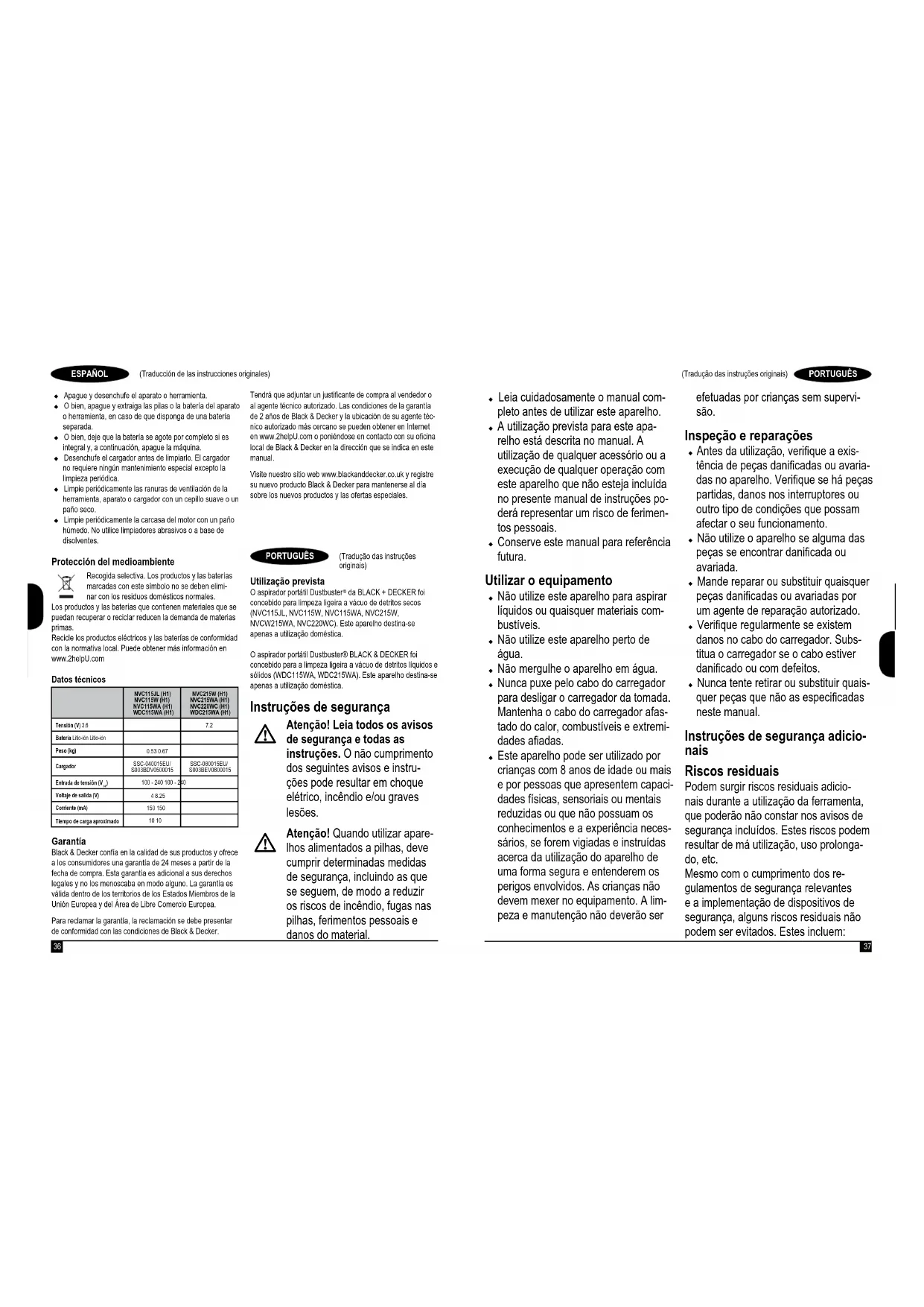 (Tradução das instruções originais) PORTUGUÊS Montagem Acessórios (Fig. C) Estes modelos podem ser fornecidos com alguns dos seguin- tes acessórios: uUma espátula (9) para utilização em líquidos em superfí- cies rígidas. uUma escova (6) para móveis e escadas. uUm acessório de ponta chata (8) para espaços exíguos. uUma escova para animais de estimação (7) para remoção de pêlos de animais. Nota: Nunca utilize esta escova directamente nos animais. Encaixe (Fig. C) uIntroduza o acessório adequado na parte frontal do apa- relho, tal como ilustrado. Certique-se de que o acessório está completamente introduzido. Boquilha retrátil (apenas nas unidadesNVC215W, NVC215WA e NVC220WC) (Fig. D) uEstique a boquilha (5), como indicado na Figura D, até encaixar no respectivo local. uPara recolher a boquilha, pressione o botão (5a) e deslize para trás na direcção do depósito de poeiras (3) como indicado na Figura D. Utilização uAntes da primeira utilização, a bateria deve ser carregada durante pelo menos 24 horas. Atenção! Para evitar danos no aparelho, antes de carregar certique-se de que este não contém líquidos e que está seco. Carregar a bateria através da base de carga (apenas nas unidades NVC115W, NVC115WA, NVC215W, NVC- 215WA, NVC220WC, WDC115WA, WDC215WA) (Fig. B) uCertique-se de que o aparelho está desligado. A bateria não carrega com o interruptor para ligar/desligar (1) premido. uColoque o aparelho no suporte de carga (4). uLigue o carregador. Ligue à corrente. uDeixe o aparelho a carregar pelo menos 21 horas. Ao carregar, o carregador pode aquecer. Isto é normal e não representa um problema. O aparelho pode ser deixado sempre ligado ao carregador. Atenção! Não carregue a bateria a temperaturas ambientes abaixo de 10 °C ou acima de 40 °C. Carregar a bateria através da cha do carregador (apenas na unidade NVC115JL) (Fig. B1) uCertique-se de que o aparelho está desligado. A bateria não carrega com o interruptor para ligar/desligar (1) premido. uIntroduza a cha do carregador (4a) na porta de carga (4b). uLigue o carregador. Ligue à corrente. uO indicador LED acende-se. uDeixe o aparelho a carregar pelo menos 21 horas. Ao carregar, o carregador pode aquecer. Isto é normal e não representa um problema. O aparelho pode ser deixado sempre ligado ao carregador. Atenção! Não carregue a bateria a temperaturas ambientes abaixo de 10 °C ou acima de 40 °C. Ligar e desligar (Fig. E) uPara ligar o aparelho, mantenha premido o interruptor para ligar/desligar (1). uPara desligar o aparelho, solte o interruptor ligar/desligar (1). Recolha de resíduos secos (apenas nas unidades NVC) uPara uso diário em resíduos secos. Atenção! Nunca utilize estas unidades para recolher aplica- ções em líquidos. Recolha de resíduos líquidos e secos (apenas nas unidades WDC) uPara a utilização diária em resíduos secos, utilize o aparelho sem a espátula. Atenção! Este produto foi concebido apenas para pequenas sujidades. uEste equipamento também pode ser utilizado para a recolha diária de resíduos líquidos. Utilize o acessório de rolo de borracha em superfícies rígidas não absorventes. Em superfícies absorventes, tais como alcatifas, o seu aparelho recolhe derrames de líquidos sem o acessório. uPara um melhor desempenho de recolha de líquidos em superfícies rígidas, insira a espátula na abertura do bocal do depósito. uPara melhores resultados ao utilizar este acessório, man- tenha o aparelho a um ângulo de 45° e puxe-o lentamente na sua direcção. uNão encha o depósito acima do limite do cano de entrada. Em caso de existência de líquidos no depósito, não vire a unidade ao contrário, não incline, não aponte o bocal para cima nem abane excessivamente o aspirador. uDepois de recolher resíduos líquidos, limpe o depósito e o ltro imediatamente. Se a unidade não for limpa após a recolha de líquidos, poderá formar-se bolor e mofo. uPara evitar danos no aparelho, antes de carregar certique-se de que este não contém líquidos e que está seco. Optimizar a potência de sucção Para garantir uma potência de sucção optimizada, os ltros devem ser limpos regularmente durante a utilização. Esvaziar e limpar o aparelho. Remover o depósito de poeiras e os ltros (Fig. F e G). Atenção! Os ltros são re-utilizáveis e devem ser limpos regularmente. uPressione o botão de desbloqueio do depósito (2) e retire o depósito de poeiras (3). uSegurando o depósito de poeiras sobre um caixote do lixo ou lavatório, retire o ltro para esvaziar o conteúdo do depósito. uPara voltar a montar o depósito de poeiras, coloque-o novamente no manípulo até este encaixar na posição correcta. Atenção! Nunca utilize o aparelho sem ltros. Só será obtida uma excelente recolha das poeiras com os ltros limpos. Acessório em espuma (Fig. H) (apenas nas unida- des WDC) uColoque o acessório em espuma (12) no centro do deec- tor de resíduos secos/líquidos (13). Atenção! Nunca utilize o aparelho para aplicação em líquidos sem o deector de líquidos e o acessório em espuma instalados. Pré-ltro (Fig. I) (apenas nas unidades NVC) O ltro e o pré-ltro podem ser separados para permitir uma limpeza mais ecaz. uRode o pré-ltro (11) no sentido contrário ao dos ponteiros do relógio e retire-o do ltro (10). Atenção! Nunca utilize estas unidades para recolher aplica- ções em líquidos. Limpar os compartimentos de poeiras e os ltros uOs depósitos de poeiras e os ltros podem ser lavados em água tépida com sabão. uAntes de reinstalar, certique-se de que os ltros e o depósito de poeiras estão secos. Substituição dos ltros Os ltros deverão ser substituídos a cada 6 a 9 meses e sempre que estiverem gastos ou danicados. Os ltros para substituição estão disponíveis junto do seu revendedor BLACK+DECKER: Manutenção O seu aparelho/ferramenta com/sem os BLACK+DECKER foi concebido para funcionar durante muito tempo, com um mínimo de ma