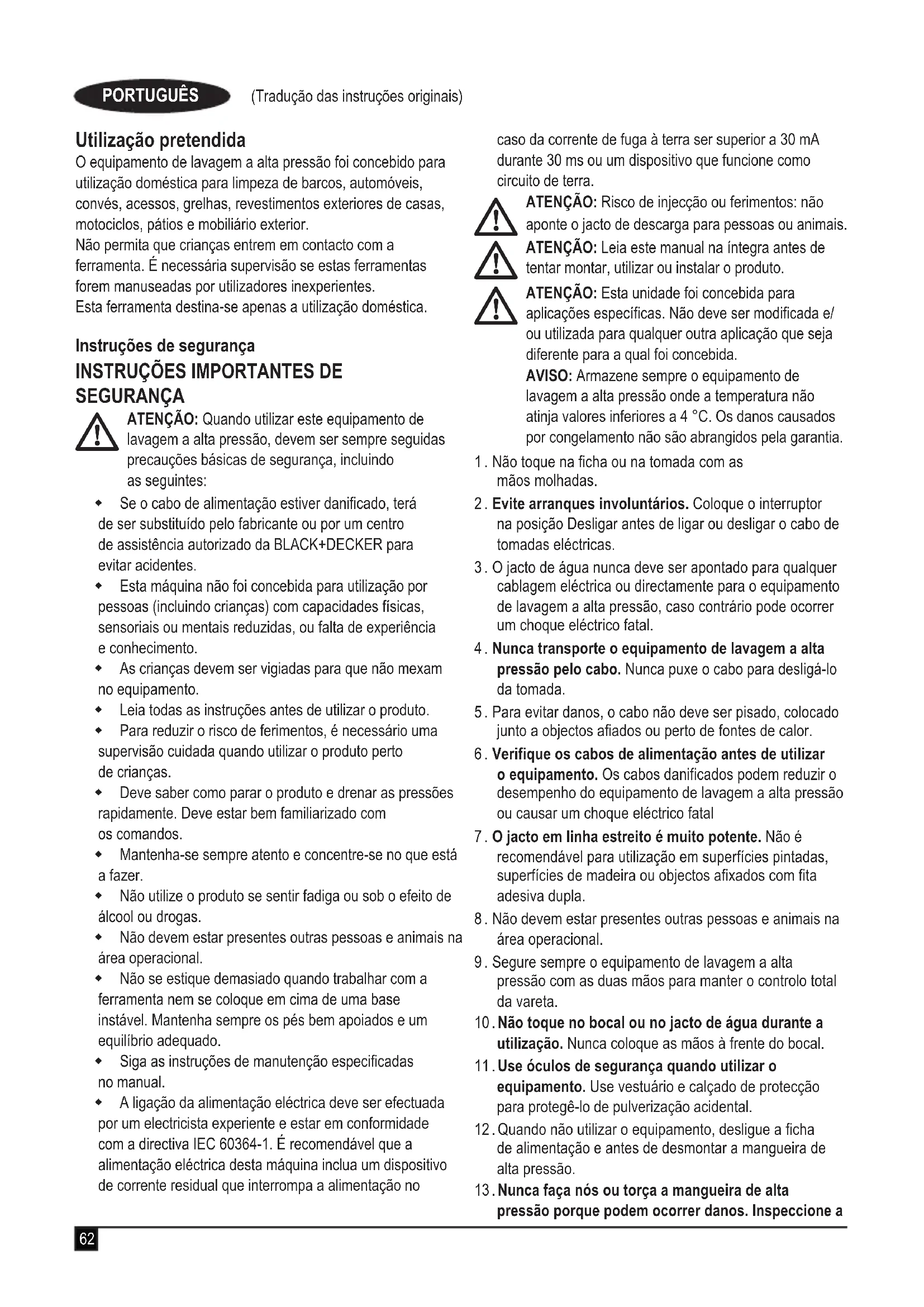 ATENÇÃO: Quando utilizar este equipamento de lavagem a alta pressão, devem ser sempre seguidas precauções básicas de segurança, incluindo as seguintes: Se o cabo de alimentação estiver danicado, terá de ser substituído pelo fabricante ou por um centro de assistência autorizado da BLACK+DECKER para evitar acidentes. Esta máquina não foi concebida para utilização por pessoas (incluindo crianças) com capacidades físicas, sensoriais ou mentais reduzidas, ou falta de experiência e conhecimento. As crianças devem ser vigiadas para que não mexam no equipamento. Leia todas as instruções antes de utilizar o produto. Para reduzir o risco de ferimentos, é necessário uma supervisão cuidada quando utilizar o produto perto de crianças. Deve saber como parar o produto e drenar as pressões rapidamente. Deve estar bem familiarizado com os comandos. Mantenha‑se sempre atento e concentre‑se no que está a fazer. Não utilize o produto se sentir fadiga ou sob o efeito de álcool ou drogas. Não devem estar presentes outras pessoas e animais na área operacional. Não se estique demasiado quando trabalhar com a ferramenta nem se coloque em cima de uma base instável. Mantenha sempre os pés bem apoiados e um equilíbrio adequado. Siga as instruções de manutenção especicadas no manual. A ligação da alimentação eléctrica deve ser efectuada por um electricista experiente e estar em conformidade com a directiva IEC 60364‑1. É recomendável que a alimentação eléctrica desta máquina inclua um dispositivo de corrente residual que interrompa a alimentação no caso da corrente de fuga à terra ser superior a 30 mA durante 30 ms ou um dispositivo que funcione como circuito de terra.