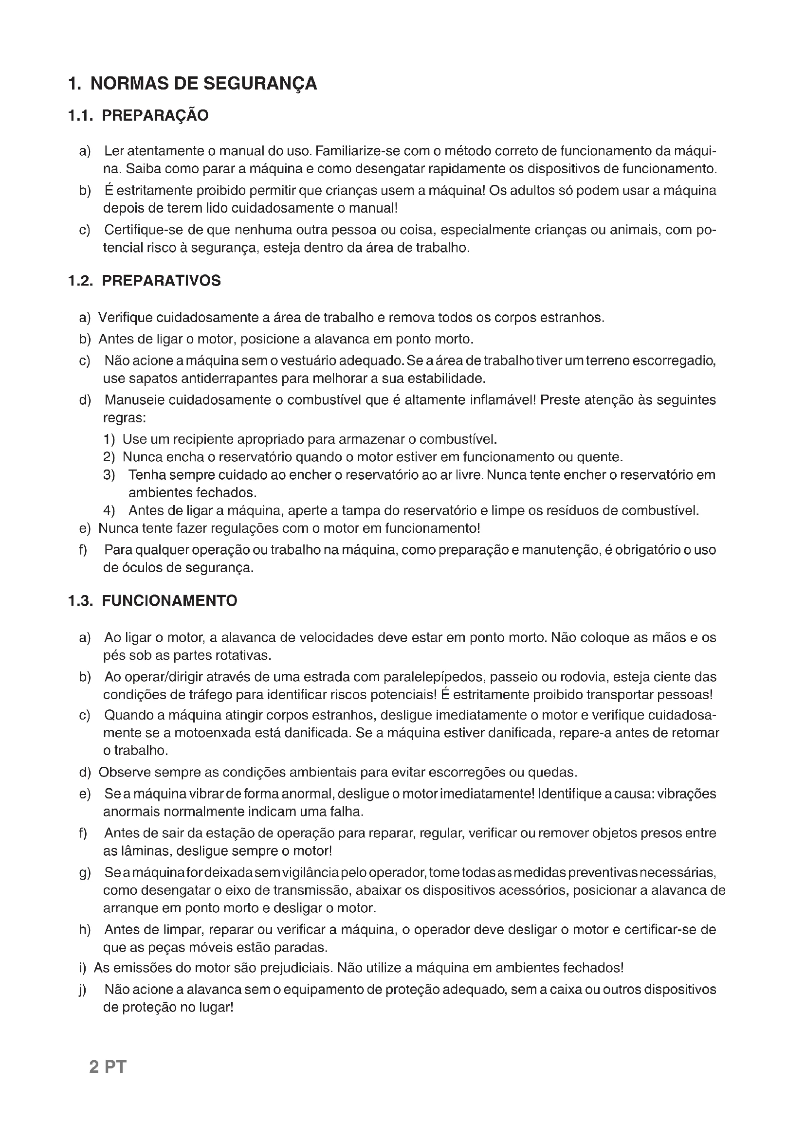 1.1. PREPARAÇÃO a) Ler atentamente o manual do uso. Familiarize-se com o método correto de funcionamento da máqui- na. Saiba como parar a máquina e como desengatar rapidamente os dispositivos de funcionamento. b) É estritamente proibido permitir que crianças usem a máquina! Os adultos só podem usar a máquina depois de terem lido cuidadosamente o manual! c) Certique-se de que nenhuma outra pessoa ou coisa, especialmente crianças ou animais, com po- tencial risco à segurança, esteja dentro da área de trabalho. 1.2. PREPARATIVOS a) Verique cuidadosamente a área de trabalho e remova todos os corpos estranhos. b) Antes de ligar o motor, posicione a alavanca em ponto morto. c) Não acione a máquina sem o vestuário adequado. Se a área de trabalho tiver um terreno escorregadio, use sapatos antiderrapantes para melhorar a sua estabilidade. d) Manuseie cuidadosamente o combustível que é altamente inamável! Preste atenção às seguintes regras: