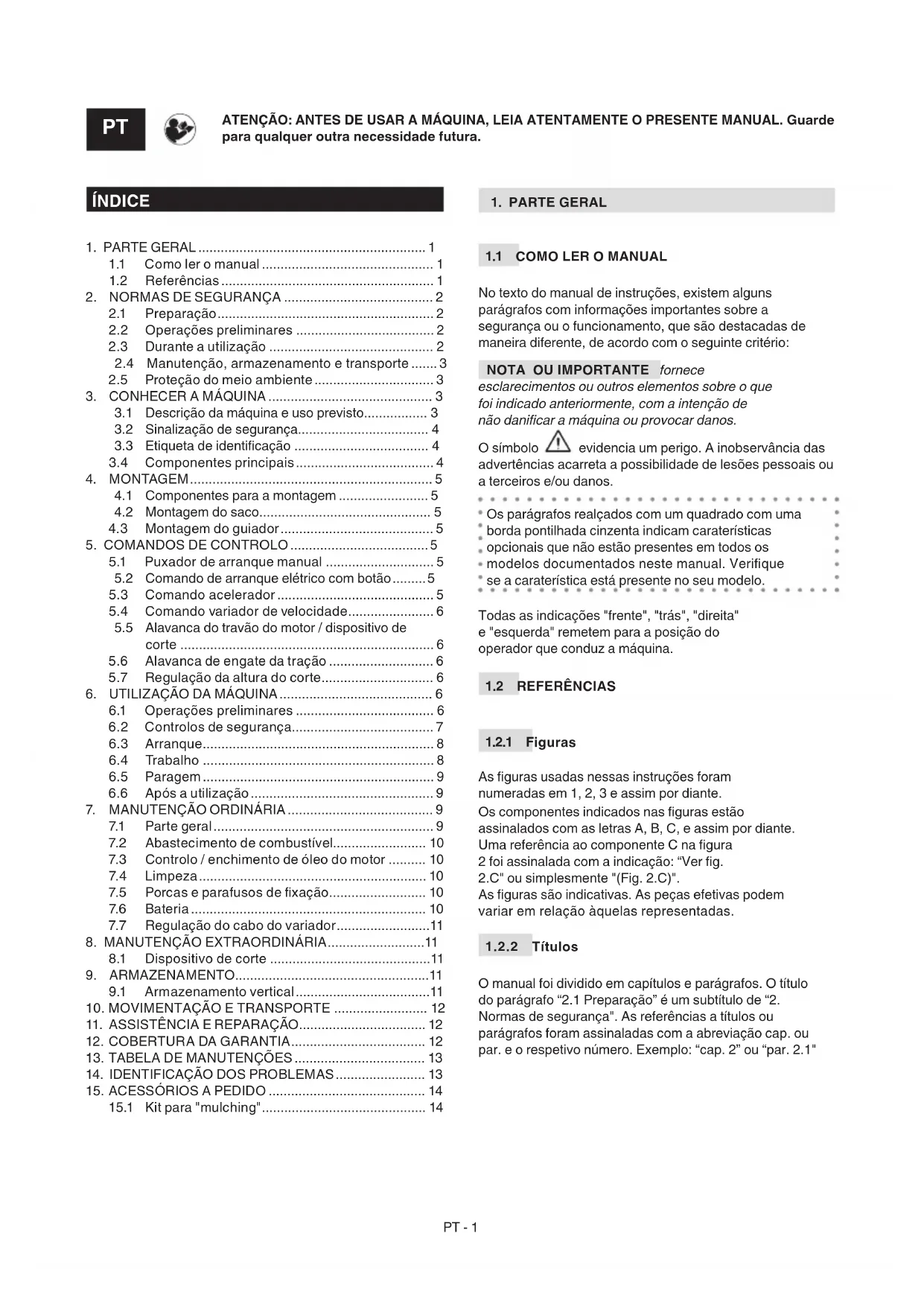 Intervenção Frequência Notas MÁQUINA Controlo de todas as xações Antes de cada uso par. 7.5 Controlos de segurança / Vericação dos comandos (incluída a alavanca de presença do operador) Antes de cada uso par. 6.2 Vericação das proteções de descarga traseira / descarga lateral. Antes de cada uso par. 6.2.1 Vericação do saco de recolha e do deetor de descarga lateral. Antes de cada uso par. 6.2.1 Vericação do dispositivo de corte Antes de cada uso par. 6.2.1 Limpeza geral e controlo No nal de cada uso par. 7.4 Vericação de eventuais danos presentes na máquina. Se necessário, contate o centro de assistência autorizado. No nal de cada uso - Regulação do cabo do variador ** par. 7.7 Substituição do dispositivo de corte - par. 8.1 *** MOTOR Controlo / abastecimento nível combustível Antes de cada uso par. 6.1.1 / 7.2 * Controlo / enchimento de óleo do motor Antes de cada uso par. 6.1.1 / 7.3 * Controlo e limpeza do ltro de ar * * Controlo e limpeza dos contatos da vela * * Substituição da vela * * Carga da bateria * par. 7.6 * * Consulte o manual do motor. ** Operação que deverá ser efetuada nos problemas sinais de problema de funcionamento *** Operação que deve ser executada pelo seu Revendedor ou por um Centro especializadoPT - 14