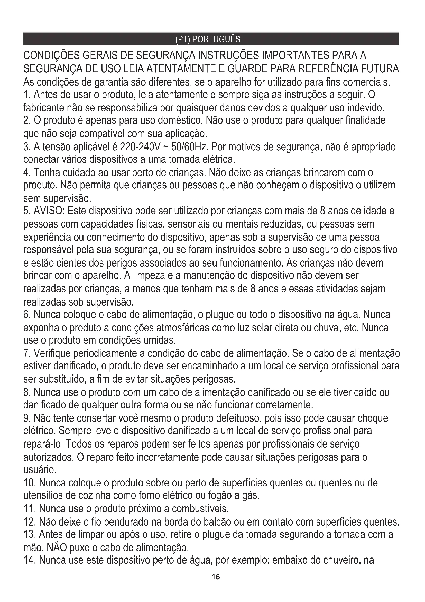 CONDIÇÕES GERAIS DE SEGURANÇA INSTRUÇÕES IMPORTANTES PARA A SEGURANÇA DE USO LEIA ATENTAMENTE E GUARDE PARA REFERÊNCIA FUTURA As condições de garantia são diferentes, se o aparelho for utilizado para fins comerciais.