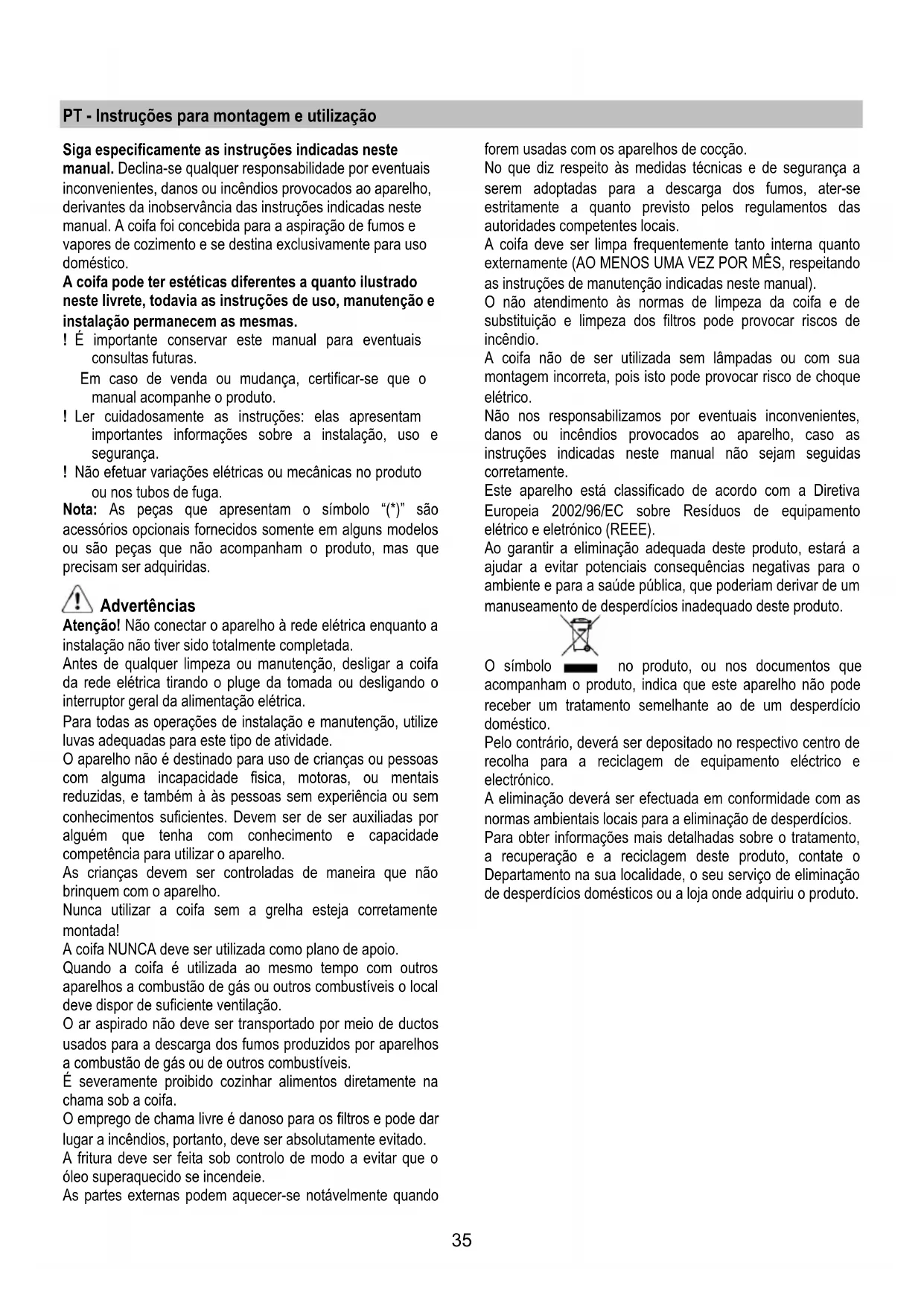 Pulse por 3 segundos la tecla, se desconecta la electrónica de mando de la campana. Esta función puede ser útil durante la operación de limpieza del producto. Para activar la electrónica bastará repetir la operación. En caso de eventuales anomalías en el funcionamiento, antes de dirigirse al servicio de asistencia, desconectar el aparato de la alimentación eléctrica, extrayendo el enchufe al menos durante 5 segundos, y después conectarlo nuevamente. Si la anomalía de funcionamiento no desaparece, dirigirse al servicio de asistencia.34 Mantenimiento ¡Atención! Antes de cualquier operación de limpieza o mantenimiento, retire la campana de la red eléctrica desconectando el enchufe o desconectando el interruptor general de la casa. Limpieza La campana debe ser limpiada con frecuencia tanto externamente como internamente (con la misma frecuencia con la que se realiza el mantenimiento de los filtros de grasa). Para la limpieza, utilice un paño impregnado de detergente líquido neutro. No utilice productos que contengan abrasivos. ¡NO UTILICE ALCOHOL! ATENCION: De no observarse las instrucciones dadas para limpiar el aparato y sustituir el filtro, puede producirse un incendio. El fabricante recomienda leerlas y respetarlas atentamente. El fabricante no se hace responsable por los daños al motor o los incendios provocados en el aparato debido a intervenciones de mantenimiento incorrectas o al incumplimiento de las normas de seguridad proporcionadas. Filtro antigrasa Fig. 19-25 Retiene las partículas de grasa producidas cuando se cocina. Debe limpiarse una vez al mes (o cuando el sistema de indicación de saturación de los filtros - si está previsto en el modelo que se posee - indica esta necesidad) con detergentes no agresivos, manualmente o bien en lavavajillas a bajas temperaturas y con ciclo breve. Con el lavado en el lavavajilla el filtro antigrasa metálico puede desteñirse pero sus características de filtrado no cambian absolutamente. Para desmontar el filtro antigrasa, tirar de la manija de desenganche de muelle. Filtro al carbón activo (solamente para la versión filtrante) Fig. 23 Retiene los olores desagradables producidos por el cocinado de alimentos. El filtro al carbón puede ser lavado cada dos meses (o cuando el sistema de indicaciones de saturación de los filtros – si está previsto en el modelo en su poder- indica esta necesidad) en agua caliente y detergentes idóneos o en lavavajillas a 65° C (en caso de lavado en lavavajillas efectuar el ciclo de lavado completo sin vajillas en el interior). Quitar el agua en exceso sin arruinar el filtro, después , ponerlo en el horno durante 10 minutos a 100° C para secarlo definitivamente. Sustituir el cojín cada 3 años y cada vez quel el paño resulte dañado. Sustitución de la lámpara La campana viene provista de un sistema de iluminación basado en la tecnología LED. Los LEDS garantizan una óptima iluminación, una duración hasta 10 veces mayor de las lámparas tradicionales y permiten aborra el 90% de energía eléctrica. . Para la sustitución dirigirse al servicio asistencia técnica .35 PT - Instruções para montagem e utilização Siga especificamente as instruções indicadas neste manual. Declina-se qualquer responsabilidade por eventuais inconvenientes, danos ou incêndios provocados ao aparelho, derivantes da inobservância das instruções indicadas neste manual. A coifa foi concebida para a aspiração de fumos e vapores de cozimento e se destina exclusivamente para uso doméstico. A coifa pode ter estéticas diferentes a quanto ilustrado neste livrete, todavia as instruções de uso, manutenção e instalação permanecem as mesmas. ! É importante conservar este manual para eventuais consultas futuras. Em caso de venda ou mudança, certificar-se que o manual acompanhe o produto. ! Ler cuidadosamente as instruções: elas apresentam importantes informações sobre a instalação, uso e segurança. ! Não efetuar variações elétricas ou mecânicas no produto ou nos tubos de fuga. Nota: As peças que apresentam o símbolo “(*)” são acessórios opcionais fornecidos somente em alguns modelos ou são peças que não acompanham o produto, mas que precisam ser adquiridas. Advertências Atenção! Não conectar o aparelho à rede elétrica enquanto a instalação não tiver sido totalmente completada. Antes de qualquer limpeza ou manutenção, desligar a coifa da rede elétrica tirando o pluge da tomada ou desligando o interruptor geral da alimentação elétrica. Para todas as operações de instalação e manutenção, utilize luvas adequadas para este tipo de atividade. O aparelho não é destinado para uso de crianças ou pessoas com alguma incapacidade fisica, motoras, ou mentais reduzidas, e também à às pessoas sem experiência ou sem conhecimentos suficientes. Devem ser de ser auxiliadas por alguém que tenha com conhecimento e capacidade competência para utilizar o aparelho. As crianças devem ser controladas de maneira que não brinquem com o aparelho. Nunca utilizar a coifa sem a grelha esteja corretamente montada! A coifa NUNCA deve ser utilizada como plano de apoio. Quando a coifa é utilizada ao mesmo tempo com outros aparelhos a combustão de gás ou outros combustíveis o local deve dispor de suficiente ventilação. O ar aspirado não deve ser transportado por meio de ductos usados para a descarga dos fumos produzidos por aparelhos a combustão de gás ou de outros combustíveis. É severamente proibido cozinhar alimentos diretamente na chama sob a coifa. O emprego de chama livre é danoso para os filtros e pode dar lugar a incêndios, portanto, deve ser absolutamente evitado. A fritura deve ser feita sob controlo de modo a evitar que o óleo superaquecido se incendeie. As partes externas podem aquecer-se notávelmente quando forem usadas com os aparelhos de cocção. No que diz respeito às medidas técnicas e de segurança a serem adoptadas para a descarga dos fumos