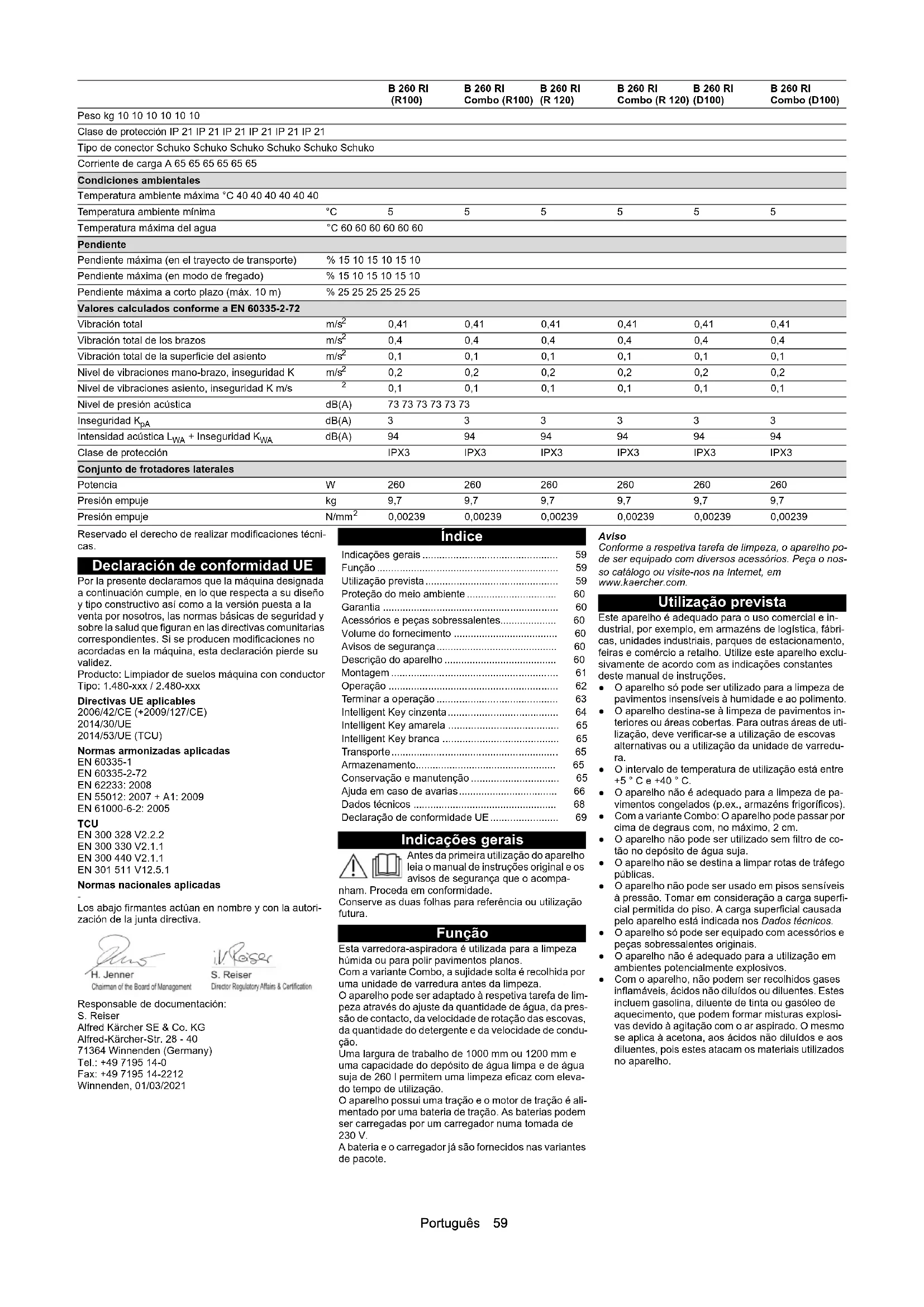 Los abajo firmantes actúan en nombre y con la autori- zación de la junta directiva. Responsable de documentación: S. Reiser Alfred Kärcher SE & Co. KG Alfred-Kärcher-Str. 28 - 40 71364 Winnenden (Germany) Tel.: +49 7195 14-0 Fax: +49 7195 14-2212 Winnenden, 01/03/2021 Índice Indicações gerais Antes da primeira utilização do aparelho leia o manual de instruções original e os avisos de segurança que o acompa- nham. Proceda em conformidade. Conserve as duas folhas para referência ou utilização futura. Função Esta varredora-aspiradora é utilizada para a limpeza húmida ou para polir pavimentos planos. Com a variante Combo, a sujidade solta é recolhida por uma unidade de varredura antes da limpeza. O aparelho pode ser adaptado à respetiva tarefa de lim- peza através do ajuste da quantidade de água, da pres- são de contacto, da velocidade de rotação das escovas, da quantidade do detergente e da velocidade de condu- ção. Uma largura de trabalho de 1000 mm ou 1200 mm e uma capacidade do depósito de água limpa e de água suja de 260 l permitem uma limpeza eficaz com eleva- do tempo de utilização. O aparelho possui uma tração e o motor de tração é ali- mentado por uma bateria de tração. As baterias podem ser carregadas por um carregador numa tomada de 230 V. A bateria e o carregador já são fornecidos nas variantes de pacote. Aviso Conforme a respetiva tarefa de limpeza, o aparelho po- de ser equipado com diversos acessórios. Peça o nos- so catálogo ou visite-nos na Internet, em www.kaercher.com. Utilização prevista Este aparelho é adequado para o uso comercial e in- dustrial, por exemplo, em armazéns de logística, fábri- cas, unidades industriais, parques de estacionamento, feiras e comércio a retalho. Utilize este aparelho exclu- sivamente de acordo com as indicações constantes deste manual de instruções. ● O aparelho só pode ser utilizado para a limpeza de pavimentos insensíveis à humidade e ao polimento. ● O aparelho destina-se à limpeza de pavimentos in- teriores ou áreas cobertas. Para outras áreas de uti- lização, deve verificar-se a utilização de escovas alternativas ou a utilização da unidade de varredu- ra. ● O intervalo de temperatura de utilização está entre +5 ° C e +40 ° C. ● O aparelho não é adequado para a limpeza de pa- vimentos congelados (p.ex., armazéns frigoríficos). ● Com a variante Combo: O aparelho pode passar por cima de degraus com, no máximo, 2 cm. ● O aparelho não pode ser utilizado sem filtro de co- tão no depósito de água suja. ● O aparelho não se destina a limpar rotas de tráfego públicas. ● O aparelho não pode ser usado em pisos sensíveis à pressão. Tomar em consideração a carga superfi- cial permitida do piso. A carga superficial causada pelo aparelho está indicada nos Dados técnicos. ● O aparelho só pode ser equipado com acessórios e peças sobressalentes originais. ● O aparelho não é adequado para a utilização em ambientes potencialmente explosivos. ● Com o aparelho, não podem ser recolhidos gases inflamáveis, ácidos não diluídos ou diluentes. Estes incluem gasolina, diluente de tinta ou gasóleo de aquecimento, que podem formar misturas explosi- vas devido à agitação com o ar aspirado. O mesmo se aplica à acetona, aos ácidos não diluídos e aos diluentes, pois estes atacam os materiais utilizados no aparelho. Peso kg 10 10 10 10 10 10 Clase de protección IP 21 IP 21 IP 21 IP 21 IP 21 IP 21 Tipo de conector Schuko Schuko Schuko Schuko Schuko Schuko Corriente de carga A 65 65 65 65 65 65 Condiciones ambientales Temperatura ambiente máxima °C 40 40 40 40 40 40 Temperatura ambiente mínima °C555555 Temperatura máxima del agua °C 60 60 60 60 60 60 Pendiente Pendiente máxima (en el trayecto de transporte) % 15 10 15 10 15 10 Pendiente máxima (en modo de fregado) % 15 10 15 10 15 10 Pendiente máxima a corto plazo (máx. 10 m) % 25 25 25 25 25 25 Valores calculados conforme a EN 60335-2-72 Vibración total m/s