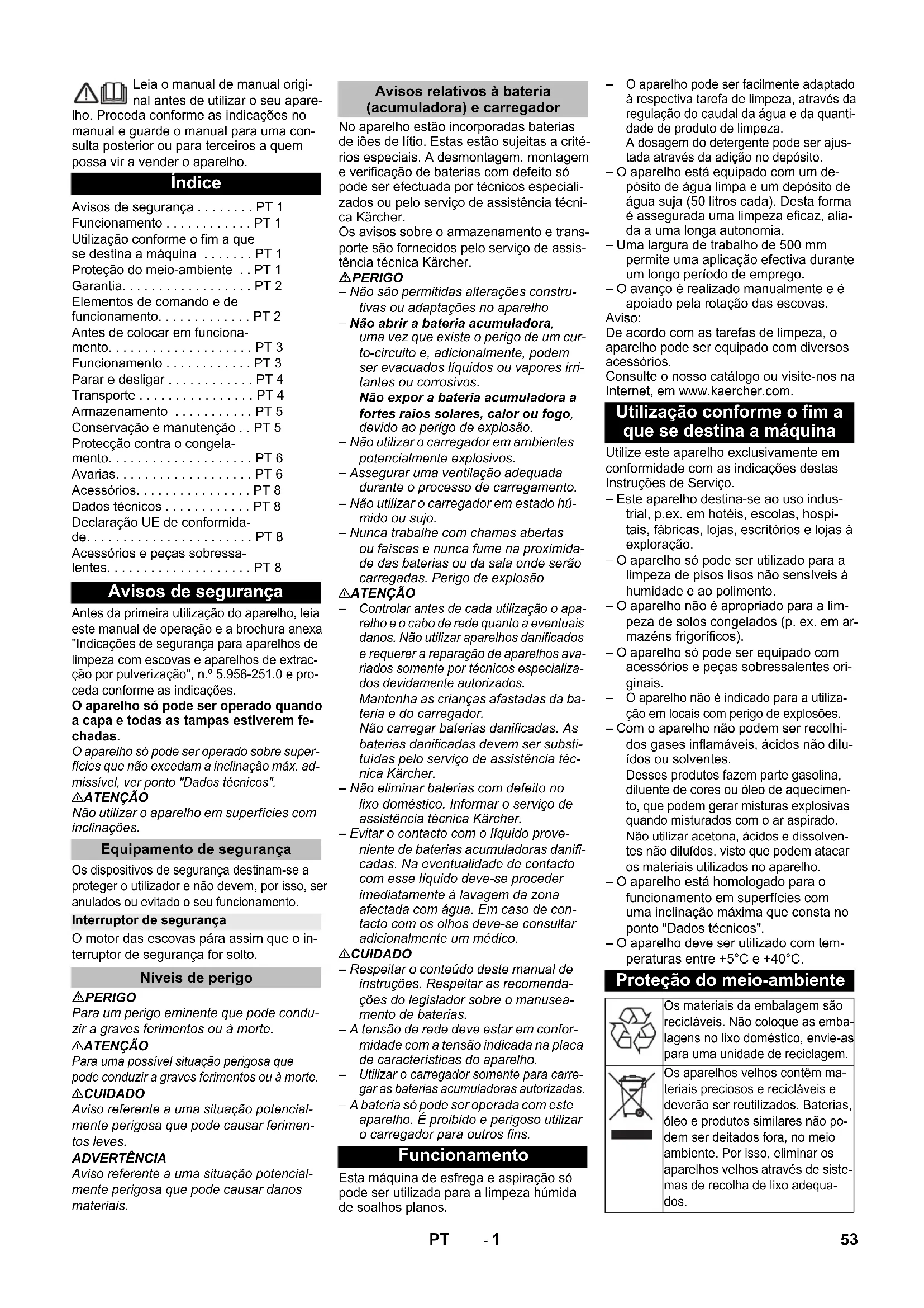 Chairman of the Board of Management Director Regulatory Affairs & Certification Accesorios y piezas de repuesto 52 ES- 1 Leia o manual de manual origi- nal antes de utilizar o seu apare- lho. Proceda conforme as indicações no manual e guarde o manual para uma con- sulta posterior ou para terceiros a quem possa vir a vender o aparelho. Antes da primeira utilização do aparelho, leia este manual de operação e a brochura anexa "Indicações de segurança para aparelhos de limpeza com escovas e aparelhos de extrac- ção por pulverização", n.º 5.956-251.0 e pro- ceda conforme as indicações. O aparelho só pode ser operado quando a capa e todas as tampas estiverem fe- chadas. O aparelho só pode ser operado sobre super- fícies que não excedam a inclinação máx. ad- missível, ver ponto "Dados técnicos". 몇 ATENÇÃO Não utilizar o aparelho em superfícies com inclinações. Os dispositivos de segurança destinam-se a proteger o utilizador e não devem, por isso, ser anulados ou evitado o seu funcionamento. O motor das escovas pára assim que o in- terruptor de segurança for solto. PERIGO Para um perigo eminente que pode condu- zir a graves ferimentos ou à morte. 몇 ATENÇÃO Para uma possível situação perigosa que pode conduzir a graves ferimentos ou à morte. 몇 CUIDADO Aviso referente a uma situação potencial- mente perigosa que pode causar ferimen- tos leves. ADVERTÊNCIA Aviso referente a uma situação potencial- mente perigosa que pode causar danos materiais. No aparelho estão incorporadas baterias de iões de lítio. Estas estão sujeitas a crité- rios especiais. A desmontagem, montagem e verificação de baterias com defeito só pode ser efectuada por técnicos especiali- zados ou pelo serviço de assistência técni- ca Kärcher. Os avisos sobre o armazenamento e trans- porte são fornecidos pelo serviço de assis- tência técnica Kärcher. PERIGO – Não são permitidas alterações constru- tivas ou adaptações no aparelho – Não abrir a bateria acumuladora, uma vez que existe o perigo de um cur- to-circuito e, adicionalmente, podem ser evacuados líquidos ou vapores irri- tantes ou corrosivos. Não expor a bateria acumuladora a fortes raios solares, calor ou fogo, devido ao perigo de explosão. – Não utilizar o carregador em ambientes potencialmente explosivos. – Assegurar uma ventilação adequada durante o processo de carregamento. – Não utilizar o carregador em estado hú- mido ou sujo. – Nunca trabalhe com chamas abertas ou faíscas e nunca fume na proximida- de das baterias ou da sala onde serão carregadas. Perigo de explosão 몇 ATENÇÃO