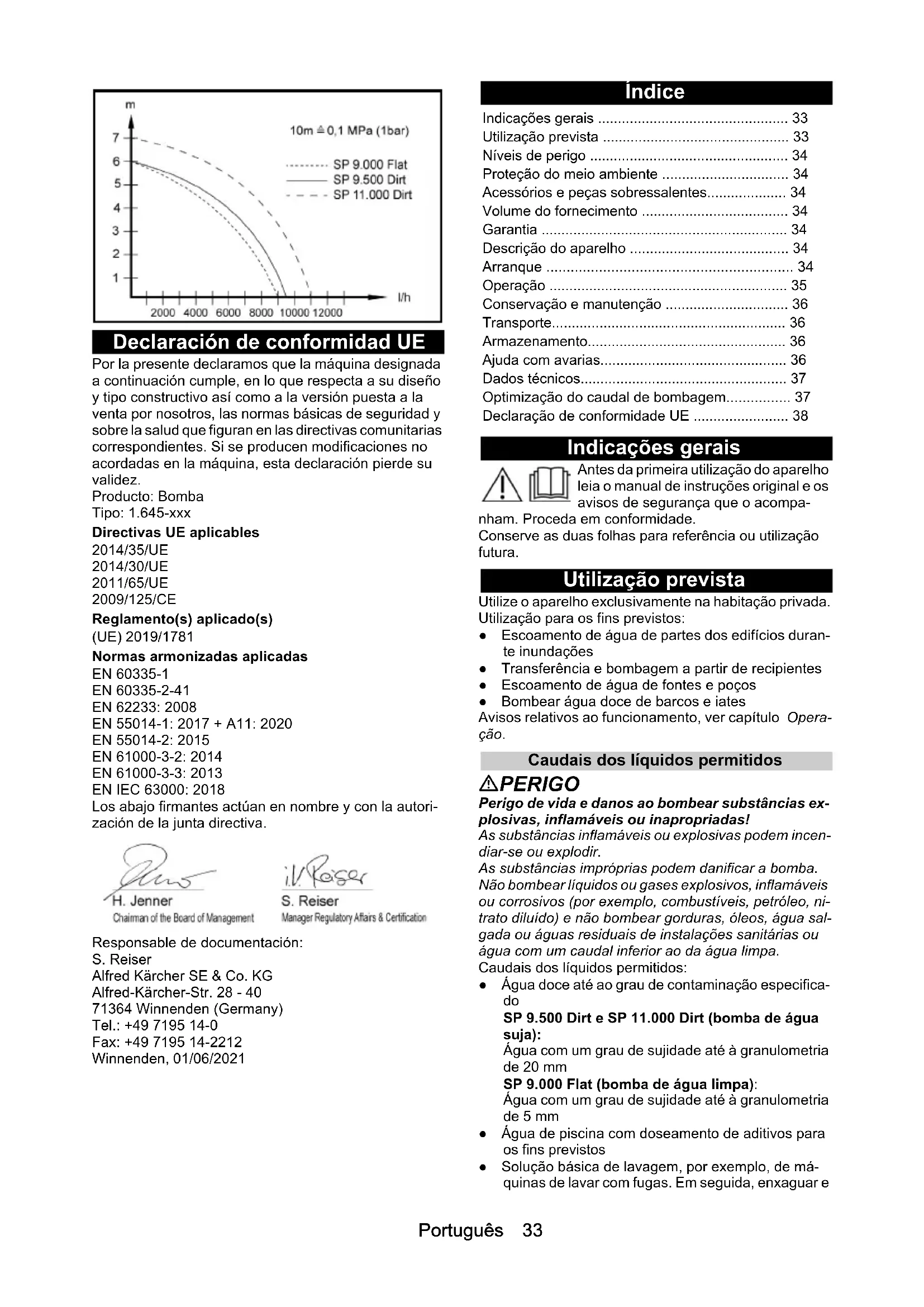DirtPortuguês 33 Declaración de conformidad UE Por la presente declaramos que la máquina designada a continuación cumple, en lo que respecta a su diseño y tipo constructivo así como a la versión puesta a la venta por nosotros, las normas básicas de seguridad y sobre la salud que figuran en las directivas comunitarias correspondientes. Si se producen modificaciones no acordadas en la máquina, esta declaración pierde su validez. Producto: Bomba Tipo: 1.645-xxx Directivas UE aplicables 2014/35/UE 2014/30/UE 2011/65/UE 2009/125/CE Reglamento(s) aplicado(s) (UE) 2019/1781 Normas armonizadas aplicadas EN 60335-1 EN 60335-2-41 EN 62233: 2008 EN 55014-1: 2017 + A11: 2020 EN 55014-2: 2015 EN 61000-3-2: 2014 EN 61000-3-3: 2013 EN IEC 63000: 2018 Los abajo firmantes actúan en nombre y con la autori- zación de la junta directiva. Responsable de documentación: S. Reiser Alfred Kärcher SE & Co. KG Alfred-Kärcher-Str. 28 - 40 71364 Winnenden (Germany) Tel.: +49 7195 14-0 Fax: +49 7195 14-2212 Winnenden, 01/06/2021 Índice Indicações gerais Antes da primeira utilização do aparelho leia o manual de instruções original e os avisos de segurança que o acompa- nham. Proceda em conformidade. Conserve as duas folhas para referência ou utilização futura. Utilização prevista Utilize o aparelho exclusivamente na habitação privada. Utilização para os fins previstos: ● Escoamento de água de partes dos edifícios duran- te inundações ● Transferência e bombagem a partir de recipientes ● Escoamento de água de fontes e poços ● Bombear água doce de barcos e iates Avisos relativos ao funcionamento, ver capítulo Opera- ção. Caudais dos líquidos permitidos PERIGO Perigo de vida e danos ao bombear substâncias ex- plosivas, inflamáveis ou inapropriadas! As substâncias inflamáveis ou explosivas podem incen- diar-se ou explodir. As substâncias impróprias podem danificar a bomba. Não bombear líquidos ou gases explosivos, inflamáveis ou corrosivos (por exemplo, combustíveis, petróleo, ni- trato diluído) e não bombear gorduras, óleos, água sal- gada ou águas residuais de instalações sanitárias ou água com um caudal inferior ao da água limpa. Caudais dos líquidos permitidos: ● Água doce até ao grau de contaminação especifica-