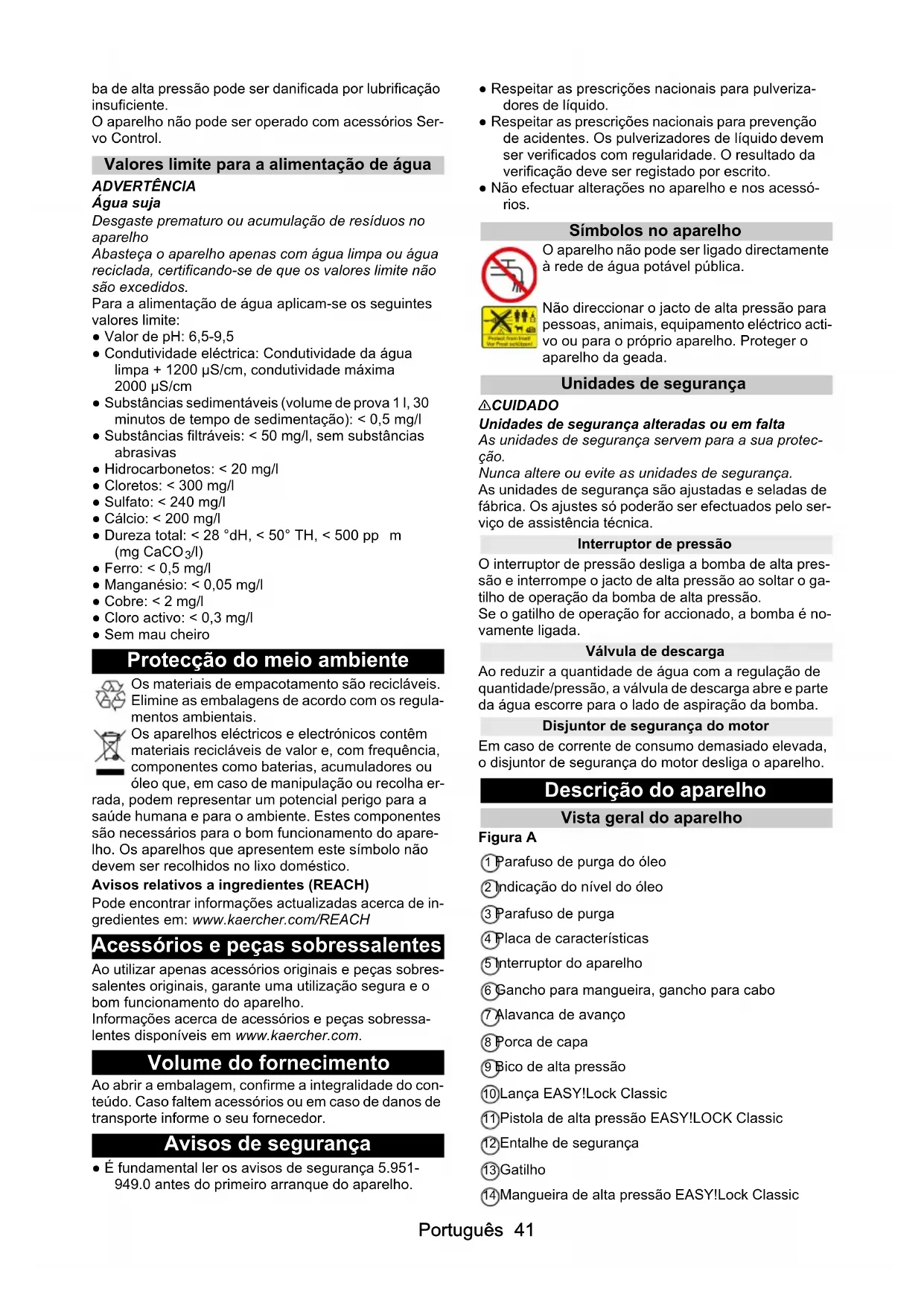 /l) ● Ferro: < 0,5 mg/l ● Manganésio: < 0,05 mg/l ● Cobre: < 2 mg/l ● Cloro activo: < 0,3 mg/l ● Sem mau cheiro Protecção do meio ambiente Os materiais de empacotamento são recicláveis. Elimine as embalagens de acordo com os regula- mentos ambientais. Os aparelhos eléctricos e electrónicos contêm materiais recicláveis de valor e, com frequência, componentes como baterias, acumuladores ou óleo que, em caso de manipulação ou recolha er- rada, podem representar um potencial perigo para a saúde humana e para o ambiente. Estes componentes são necessários para o bom funcionamento do apare- lho. Os aparelhos que apresentem este símbolo não devem ser recolhidos no lixo doméstico. Avisos relativos a ingredientes (REACH) Pode encontrar informações actualizadas acerca de in- gredientes em: www.kaercher.com/REACH Acessórios e peças sobressalentes Ao utilizar apenas acessórios originais e peças sobres- salentes originais, garante uma utilização segura e o bom funcionamento do aparelho. Informações acerca de acessórios e peças sobressa- lentes disponíveis em www.kaercher.com. Volume do fornecimento Ao abrir a embalagem, confirme a integralidade do con- teúdo. Caso faltem acessórios ou em caso de danos de transporte informe o seu fornecedor. Avisos de segurança ● É fundamental ler os avisos de segurança 5.951-
