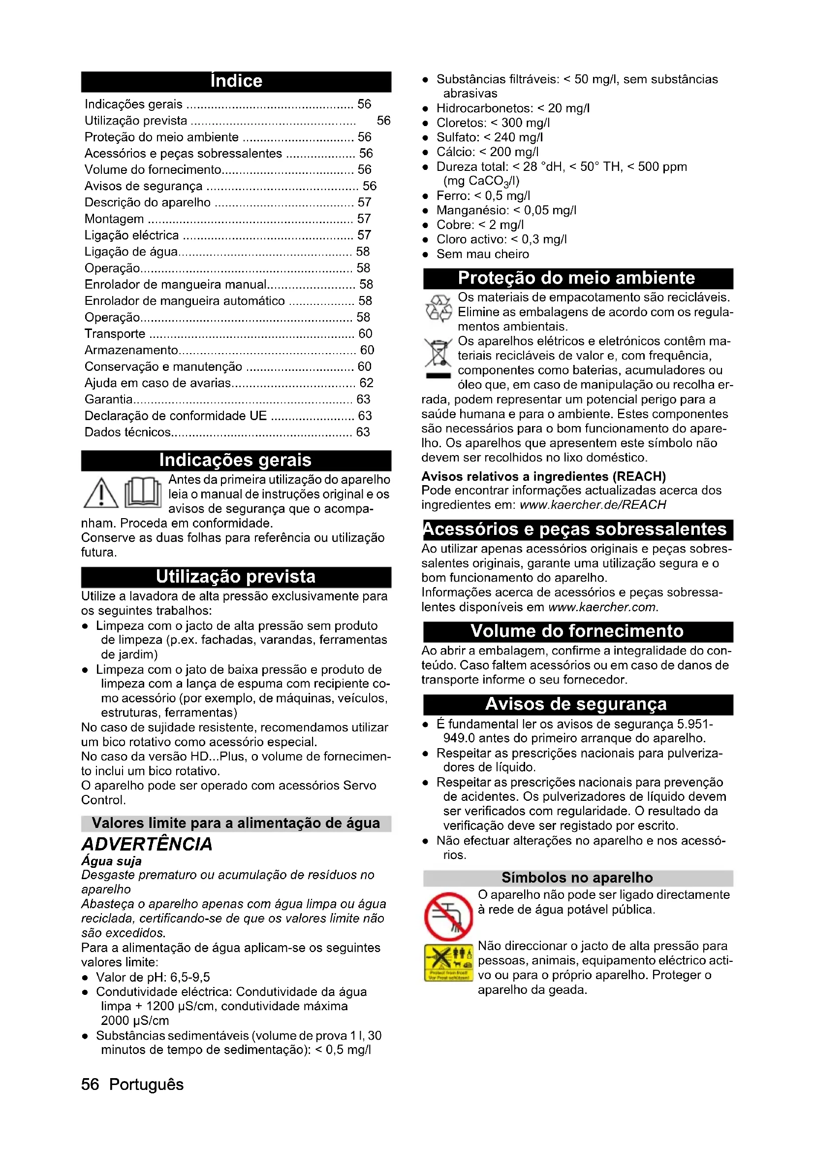 /l) ● Ferro: < 0,5 mg/l ● Manganésio: < 0,05 mg/l ● Cobre: < 2 mg/l ● Cloro activo: < 0,3 mg/l ● Sem mau cheiro Proteção do meio ambiente Os materiais de empacotamento são recicláveis. Elimine as embalagens de acordo com os regula- mentos ambientais. Os aparelhos elétricos e eletrónicos contêm ma- teriais recicláveis de valor e, com frequência, componentes como baterias, acumuladores ou óleo que, em caso de manipulação ou recolha er- rada, podem representar um potencial perigo para a saúde humana e para o ambiente. Estes componentes são necessários para o bom funcionamento do apare- lho. Os aparelhos que apresentem este símbolo não devem ser recolhidos no lixo doméstico. Avisos relativos a ingredientes (REACH) Pode encontrar informações actualizadas acerca dos ingredientes em: www.kaercher.de/REACH Acessórios e peças sobressalentes Ao utilizar apenas acessórios originais e peças sobres- salentes originais, garante uma utilização segura e o bom funcionamento do aparelho. Informações acerca de acessórios e peças sobressa- lentes disponíveis em www.kaercher.com. Volume do fornecimento Ao abrir a embalagem, confirme a integralidade do con- teúdo. Caso faltem acessórios ou em caso de danos de transporte informe o seu fornecedor. Avisos de segurança ● É fundamental ler os avisos de segurança 5.951-