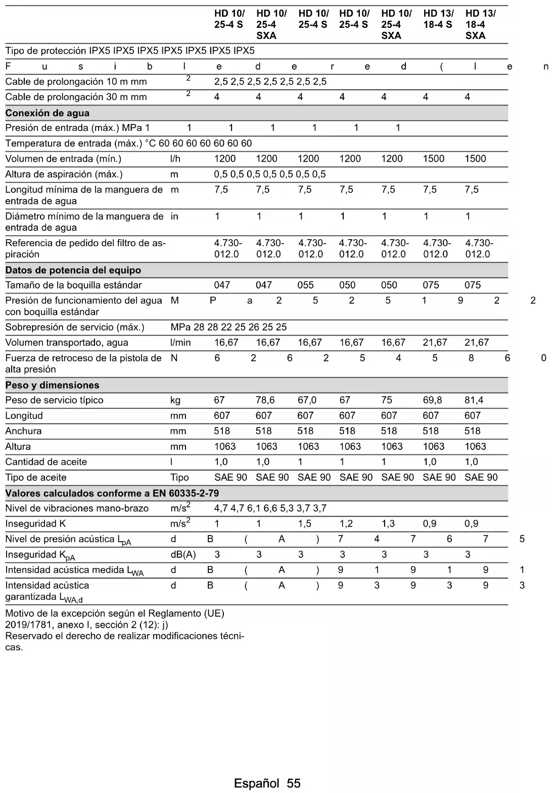 Nível de potência sonora dB(A) HD 9/20-4 S(XA) Medido: 91 Garantido: 93 HD 10/21-4 S(XA) Medido: 91 Garantido: 93 HD 13/18-4 S(XA) Medido: 91 Garantido: 93 HD 10/25-4 S(XA) Medido: 91 Garantido: 93 Os signatários actuam em nome e em procuração do Conselho de Administração. Mandatário da documentação: S. Reiser Alfred Kärcher SE & Co. KG Alfred-Kärcher-Str. 28 - 40 71364 Winnenden (Alemanha) Tel.: +49 7195 14-0 Fax: +49 7195 14-2212 Winnenden, 01/08/2023 Dados técnicos HD 9/ 20-4 S HD 9/ 20-4 SX Plus HD 9/ 20-4 SXA HD 10/ 21-4 S HD 10/ 21-4 SX Plus HD 10/ 21-4 SXA HD 10/ 21-4 S Variante nacional País EU EU EU EU EU EU KAP Ligação eléctrica Tensão V 400 400 400 400 400 400 380 Fase ~ 3333333 Frequência Hz 50 50 50 50 50 50 50 Impedância eléctrica máxima admis- sível