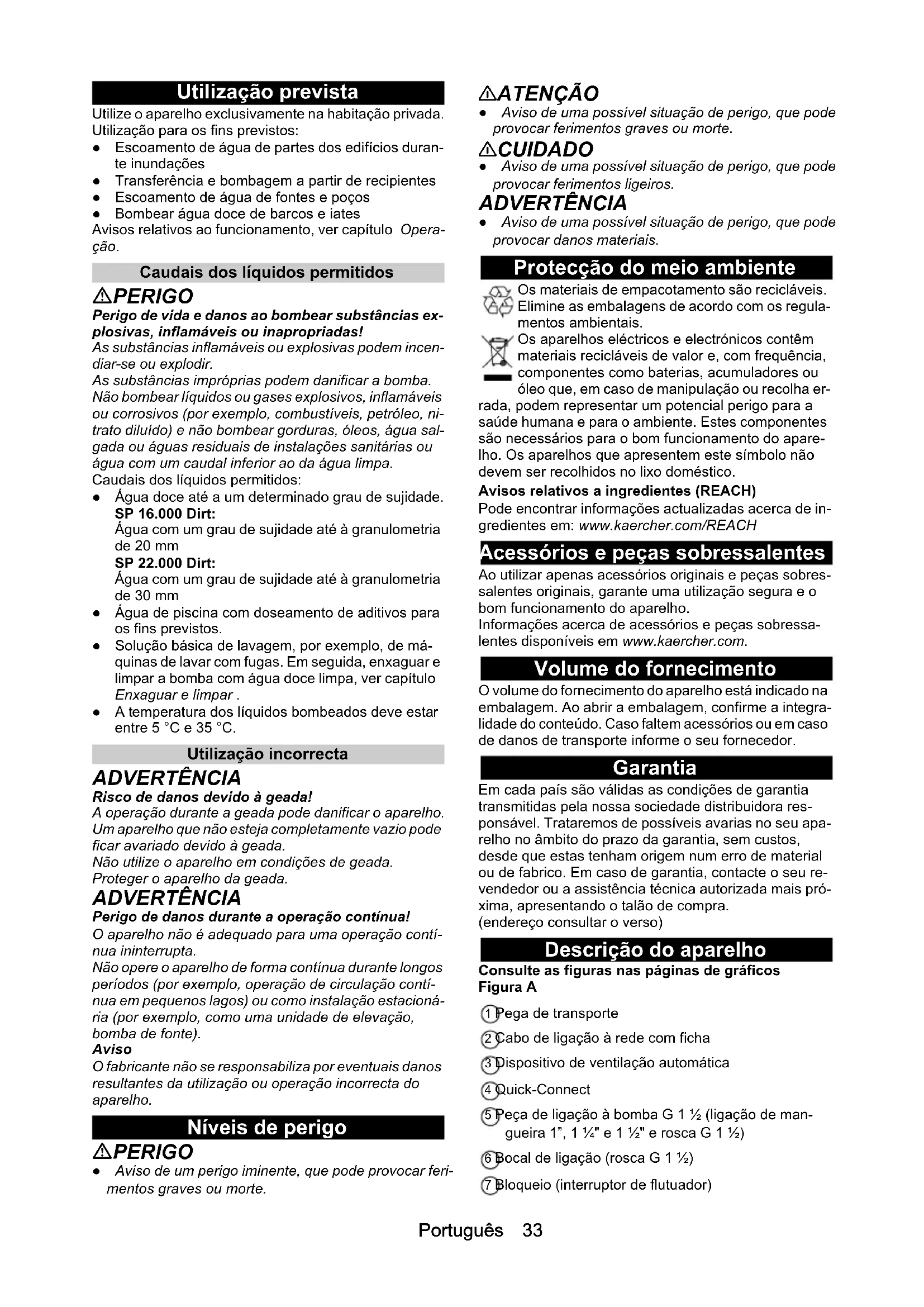 - Declaração de conformidade UE Português 33 Utilização prevista Utilize o aparelho exclusivamente na habitação privada. Utilização para os fins previstos: ● Escoamento de água de partes dos edifícios duran- te inundações ● Transferência e bombagem a partir de recipientes ● Escoamento de água de fontes e poços ● Bombear água doce de barcos e iates Avisos relativos ao funcionamento, ver capítulo Opera- ção. Caudais dos líquidos permitidos PERIGO Perigo de vida e danos ao bombear substâncias ex- plosivas, inflamáveis ou inapropriadas! As substâncias inflamáveis ou explosivas podem incen- diar-se ou explodir. As substâncias impróprias podem danificar a bomba. Não bombear líquidos ou gases explosivos, inflamáveis ou corrosivos (por exemplo, combustíveis, petróleo, ni- trato diluído) e não bombear gorduras, óleos, água sal- gada ou águas residuais de instalações sanitárias ou água com um caudal inferior ao da água limpa. Caudais dos líquidos permitidos: ● Água doce até a um determinado grau de sujidade. SP 16.000 Dirt: Água com um grau de sujidade até à granulometria de 20 mm SP 22.000 Dirt: Água com um grau de sujidade até à granulometria de 30 mm ● Água de piscina com doseamento de aditivos para os fins previstos. ● Solução básica de lavagem, por exemplo, de má- quinas de lavar com fugas. Em seguida, enxaguar e limpar a bomba com água doce limpa, ver capítulo Enxaguar e limpar . ● A temperatura dos líquidos bombeados deve estar entre 5 °C e 35 °C. Utilização incorrecta ADVERTÊNCIA Risco de danos devido à geada! A operação durante a geada pode danificar o aparelho. Um aparelho que não esteja completamente vazio pode ficar avariado devido à geada. Não utilize o aparelho em condições de geada. Proteger o aparelho da geada. ADVERTÊNCIA Perigo de danos durante a operação contínua! O aparelho não é adequado para uma operação contí- nua ininterrupta. Não opere o aparelho de forma contínua durante longos períodos (por exemplo, operação de circulação contí- nua em pequenos lagos) ou como instalação estacioná- ria (por exemplo, como uma unidade de elevação, bomba de fonte). Aviso O fabricante não se responsabiliza por eventuais danos resultantes da utilização ou operação incorrecta do aparelho. Níveis de perigo PERIGO ● Aviso de um perigo iminente, que pode provocar feri- mentos graves ou morte. 몇 ATENÇÃO ● Aviso de uma possível situação de perigo, que pode provocar ferimentos graves ou morte. 몇 CUIDADO ● Aviso de uma possível situação de perigo, que pode provocar ferimentos ligeiros. ADVERTÊNCIA ● Aviso de uma possível situação de perigo, que pode provocar danos materiais. Protecção do meio ambiente Os materiais de empacotamento são recicláveis. Elimine as embalagens de acordo com os regula- mentos ambientais. Os aparelhos eléctricos e electrónicos contêm materiais recicláveis de valor e, com frequência, componentes como baterias, acumuladores ou óleo que, em caso de manipulação ou recolha er- rada, podem representar um potencial perigo para a saúde humana e para o ambiente. Estes componentes são necessários para o bom funcionamento do apare- lho. Os aparelhos que apresentem este símbolo não devem ser recolhidos no lixo doméstico. Avisos relativos a ingredientes (REACH) Pode encontrar informações actualizadas acerca de in- gredientes em: www.kaercher.com/REACH Acessórios e peças sobressalentes Ao utilizar apenas acessórios originais e peças sobres- salentes originais, garante uma utilização segura e o bom funcionamento do aparelho. Informações acerca de acessórios e peças sobressa- lentes disponíveis em www.kaercher.com. Volume do fornecimento O volume do fornecimento do aparelho está indicado na embalagem. Ao abrir a embalagem, confirme a integra- lidade do conteúdo. Caso faltem acessórios ou em caso de danos de transporte informe o seu fornecedor. Garantia Em cada país são válidas as condições de garantia transmitidas pela nossa sociedade distribuidora res- ponsável. Trataremos de possíveis avarias no seu apa- relho no âmbito do prazo da garantia, sem custos, desde que estas tenham origem num erro de material ou de fabrico. Em caso de garantia, contacte o seu re- vendedor ou a assistência técnica autorizada mais pró- xima, apresentando o talão de compra. (endereço consultar o verso) Descrição do aparelho Consulte as figuras nas páginas de gráficos Figura A 1 Pega de transporte 2 Cabo de ligação à rede com ficha 3 Dispositivo de ventilação automática 4 Quick-Connect 5 Peça de ligação à bomba G 1 ½ (ligação de man- gueira 1”, 1 ¼" e 1 ½" e rosca G 1 ½) 6 Bocal de ligação (rosca G 1 ½) 7 Bloqueio (interruptor de flutuador)34 Português 8 Regulação em altura (interruptor de flutuador) 9 Interruptor de flutuador 10 *Peça de ligação à bomba G 1 (ligação de man- gueira ¾″ e 1″ e rosca G 1) 11 *Válvula de retenção 12 União de rosca G 1 (SP 16.000 Dirt) 13 Pré-filtro (SP 22.000 Dirt) p. 37