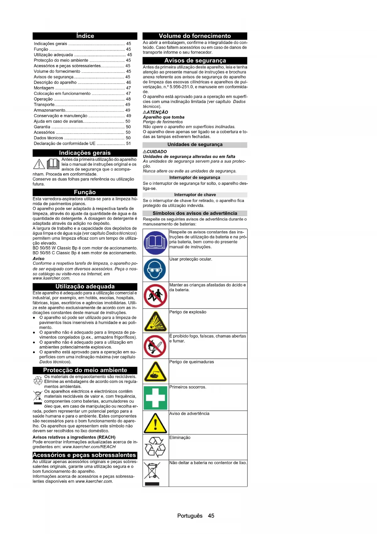- dB(A) 84,1 84,1 BD 50/55 W Classic Bp BD 50/55 C Classic Bp Chairman of the Board of Management Director Regulatory Affairs & Certification H. Jenner S. ReiserPortuguês 45 Índice Indicações gerais Antes da primeira utilização do aparelho leia o manual de instruções original e os avisos de segurança que o acompa- nham. Proceda em conformidade. Conserve as duas folhas para referência ou utilização futura. Função Esta varredora-aspiradora utiliza-se para a limpeza hú- mida de pavimentos planos. O aparelho pode ser adaptado à respectiva tarefa de limpeza, através do ajuste da quantidade de água e da quantidade do detergente. A dosagem do detergente é adaptada através da adição no depósito. A largura de trabalho e a capacidade dos depósitos de água limpa e de água suja (ver capítulo Dados técnicos) permitem uma limpeza eficaz com um tempo de utiliza- ção elevado. BD 50/55 W Classic Bp é com motor de accionamento. BD 50/55 C Classic Bp é sem motor de accionamento. Aviso Conforme a respetiva tarefa de limpeza, o aparelho po- de ser equipado com diversos acessórios. Peça o nos- so catálogo ou visite-nos na Internet, em www.kaercher.com. Utilização adequada Este aparelho é adequado para a utilização comercial e industrial, por exemplo, em hotéis, escolas, hospitais, fábricas, lojas, escritórios e agências imobiliárias. Utili- ze este aparelho exclusivamente de acordo com as in- dicações constantes deste manual de instruções. ● O aparelho só pode ser utilizado para a limpeza de pavimentos lisos insensíveis à humidade e ao poli- mento. ● O aparelho não é adequado para a limpeza de pa- vimentos congelados (p.ex., armazéns frigoríficos). ● O aparelho não é adequado para a utilização em ambientes potencialmente explosivos. ● O aparelho está aprovado para a operação em su- perfícies com uma inclinação máxima (ver capítulo Dados técnicos). Protecção do meio ambiente Os materiais de empacotamento são recicláveis. Elimine as embalagens de acordo com os regula- mentos ambientais. Os aparelhos eléctricos e electrónicos contêm materiais recicláveis de valor e, com frequência, componentes como baterias, acumuladores ou óleo que, em caso de manipulação ou recolha er- rada, podem representar um potencial perigo para a saúde humana e para o ambiente. Estes componentes são necessários para o bom funcionamento do apare- lho. Os aparelhos que apresentem este símbolo não devem ser recolhidos no lixo doméstico. Avisos relativos a ingredientes (REACH) Pode encontrar informações actualizadas acerca de in- gredientes em: www.kaercher.com/REACH Acessórios e peças sobressalentes Ao utilizar apenas acessórios originais e peças sobres- salentes originais, garante uma utilização segura e o bom funcionamento do aparelho. Informações acerca de acessórios e peças sobressa- lentes disponíveis em www.kaercher.com. Volume do fornecimento Ao abrir a embalagem, confirme a integralidade do con- teúdo. Caso faltem acessórios ou em caso de danos de transporte informe o seu fornecedor. Avisos de segurança Antes da primeira utilização deste aparelho, leia e tenha atenção ao presente manual de instruções e brochura anexa referente aos avisos de segurança do aparelho de limpeza das escovas cilíndricas e aparelhos de pul- verização, n.º 5.956-251.0, e manuseie em conformida- de. O aparelho está aprovado para a operação em superfí- cies com uma inclinação limitada (ver capítulo Dados técnicos). 몇 ATENÇÃO Aparelho que tomba Perigo de ferimentos Não opere o aparelho em superfícies inclinadas. O aparelho deve apenas ser ligado se a cobertura e to- das as tampas estiverem fechadas. Unidades de segurança 몇 CUIDADO Unidades de segurança alteradas ou em falta As unidades de segurança servem para a sua protec- ção. Nunca altere ou evite as unidades de segurança. Interruptor de segurança Se o interruptor de segurança for solto, o aparelho des- liga-se. Interruptor de chave Se o interruptor de chave for retirado, o aparelho fica protegido da utilização indevida. Símbolos dos avisos de advertência Respeite os seguintes avisos de advertência durante o manuseamento de baterias: Indicações gerais p. 45