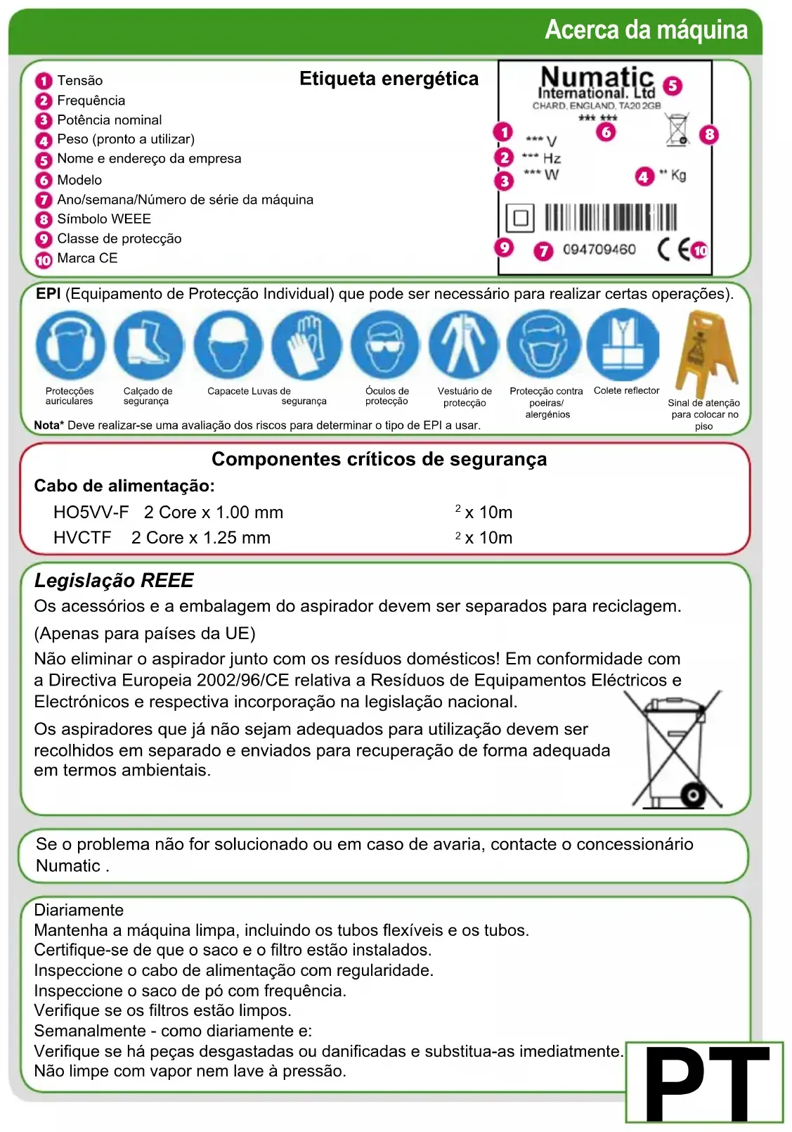 x 10m EPI (Equipamento de Protecção Individual) que pode ser necessário para realizar certas operações). Se o problema não for solucionado ou em caso de avaria, contacte o concessionário Numatic . Diariamente Mantenha a máquina limpa, incluindo os tubos exíveis e os tubos. Certique-se de que o saco e o ltro estão instalados. Inspeccione o cabo de alimentação com regularidade. Inspeccione o saco de pó com frequência. Verique se os ltros estão limpos. Semanalmente - como diariamente e: Verique se há peças desgastadas ou danicadas e substitua-as imediatmente. Não limpe com vapor nem lave à pressão. Acerca da máquina