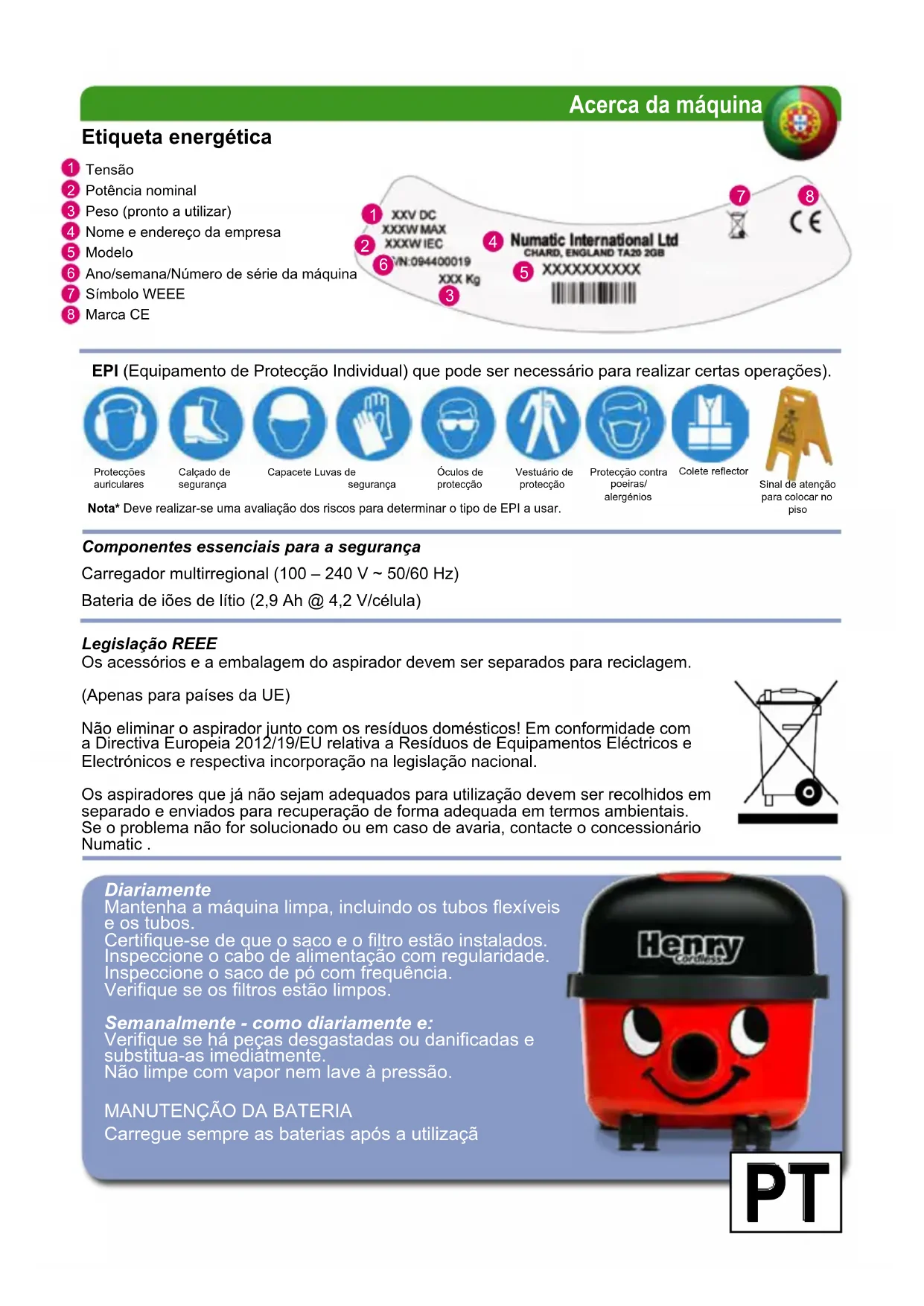 TensãoPotência nominalPeso (pronto a utilizar)Nome e endereço da empresaModeloAno/semana/Número de série da máquinaSímbolo WEEEMarca CE Componentes essenciais para a segurança Carregador multirregional (100 – 240 V ~ 50/60 Hz) Bateria de iões de lítio (2,9 Ah @ 4,2 V/célula) Acerca da máquina Etiqueta energética EPI (Equipamento de Protecção Individual) que pode ser necessário para realizar certas operações). Protecções auricularesCalçado de segurançaCapacete Luvas de segurançaÓculos de protecçãoVestuário de protecçãoNota* Deve realizar-se uma avaliação dos riscos para determinar o tipo de EPI a usar.Protecção contra poeiras/alergéniosSinal de atenção para colocar no piso Colete reector Legislação REEE Os acessórios e a embalagem do aspirador devem ser separados para reciclagem. (Apenas para países da UE) Não eliminar o aspirador junto com os resíduos domésticos! Em conformidade com a Directiva Europeia 2012/19/EU relativa a Resíduos de Equipamentos Eléctricos e Electrónicos e respectiva incorporação na legislação nacional. Os aspiradores que já não sejam adequados para utilização devem ser recolhidos em separado e enviados para recuperação de forma adequada em termos ambientais. Se o problema não for solucionado ou em caso de avaria, contacte o concessionário Numatic . Diariamente Mantenha a máquina limpa, incluindo os tubos exíveis e os tubos. Certique-se de que o saco e o ltro estão instalados. Inspeccione o cabo de alimentação com regularidade. Inspeccione o saco de pó com frequência. Verique se os ltros estão limpos. Semanalmente - como diariamente e: Verique se há peças desgastadas ou danicadas e substitua-as imediatmente. Não limpe com vapor nem lave à pressão.