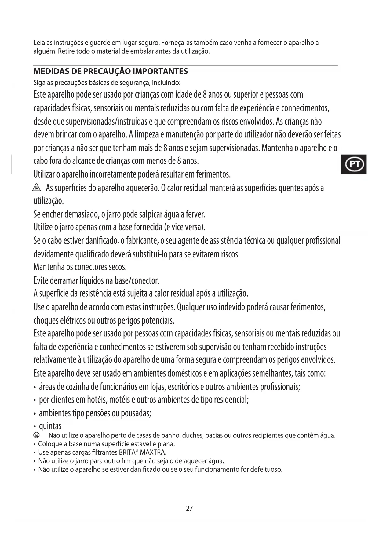 Siga as precauções básicas de segurança, incluindo: Este aparelho pode ser usado por crianças com idade de 8 anos ou superior e pessoas com capacidades físicas, sensoriais ou mentais reduzidas ou com falta de experiência e conhecimentos, desde que supervisionadas/instruídas e que compreendam os riscos envolvidos. As crianças não devem brincar com o aparelho. A limpeza e manutenção por parte do utilizador não deverão ser feitas por crianças a não ser que tenham mais de 8 anos e sejam supervisionadas. Mantenha o aparelho e o cabo fora do alcance de crianças com menos de 8 anos. Utilizar o aparelho incorretamente poderá resultar em ferimentos. h As superfícies do aparelho aquecerão. O calor residual manterá as superfícies quentes após a utilização. Se encher demasiado, o jarro pode salpicar água a ferver. Utilize o jarro apenas com a base fornecida (e vice versa). Se o cabo estiver danificado, o fabricante, o seu agente de assistência técnica ou qualquer profissional devidamente qualificado deverá substituí-lo para se evitarem riscos. Mantenha os conectores secos. Evite derramar líquidos na base/conector. A superfície da resistência está sujeita a calor residual após a utilização. Use o aparelho de acordo com estas instruções. Qualquer uso indevido poderá causar ferimentos, choques elétricos ou outros perigos potenciais. Este aparelho pode ser usado por pessoas com capacidades físicas, sensoriais ou mentais reduzidas ou falta de experiência e conhecimentos se estiverem sob supervisão ou tenham recebido instruções relativamente à utilização do aparelho de uma forma segura e compreendam os perigos envolvidos. Este aparelho deve ser usado em ambientes domésticos e em aplicações semelhantes, tais como: