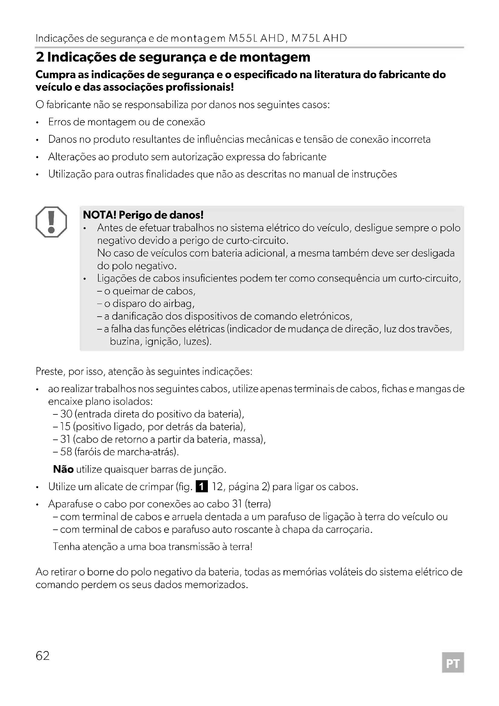 Ligações de cabos insuficientes podem ter como consequência um curto-circuito, – o queimar de cabos, – o disparo do airbag, – a danificação dos dispositivos de comando eletrónicos, – a falha das funções elétricas (indicador de mudança de direção, luz dos travões, buzina, ignição, luzes). M55L-AHD-M75L-AHD-IO-16s.book Seite 62 Montag, 17. Dezember 2018 4:16 16M55L AHD, M75L AHD Indicações de segurança e de montagem