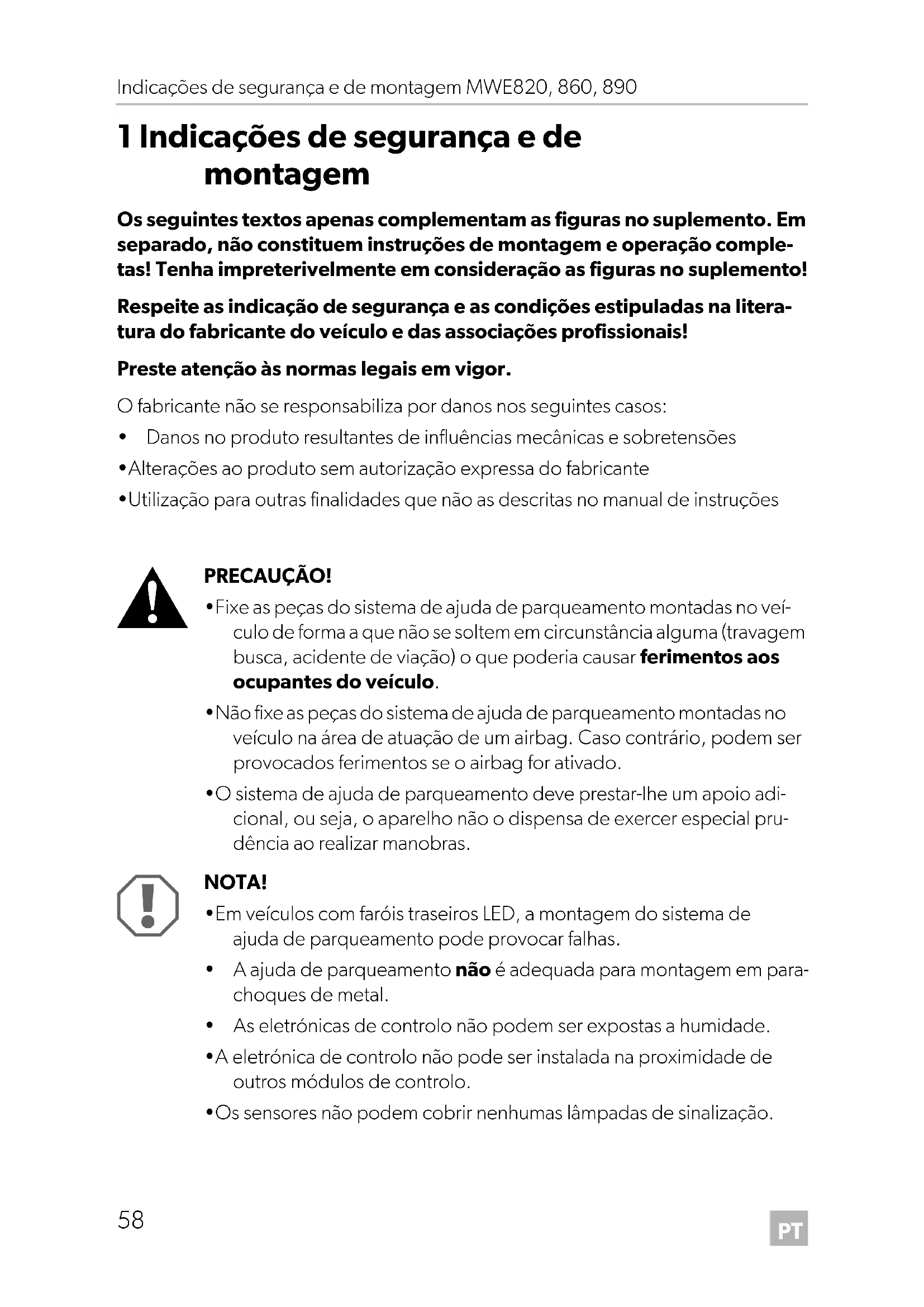 1 Indicações de segurança e de montagem Os seguintes textos apenas complementam as figuras no suplemento. Em separado, não constituem instruções de montagem e operação comple- tas! Tenha impreterivelmente em consideração as figuras no suplemento! Respeite as indicação de segurança e as condições estipuladas na litera- tura do fabricante do veículo e das associações profissionais! Preste atenção às normas legais em vigor. O fabricante não se responsabiliza por danos nos seguintes casos:
