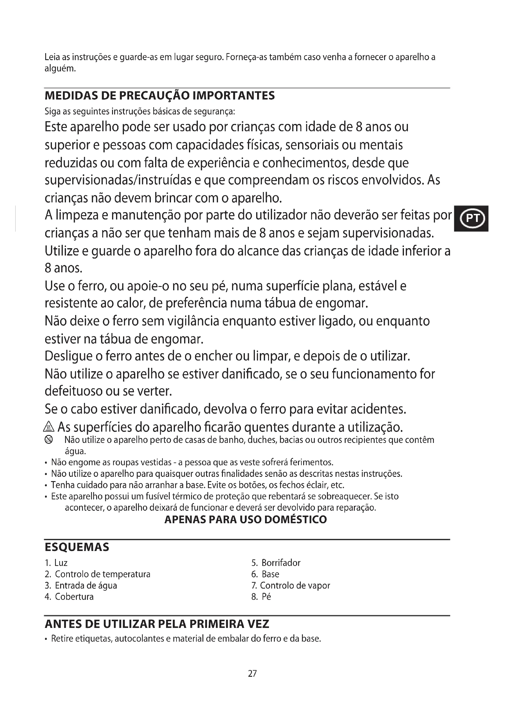 Siga as seguintes instruções básicas de segurança: Este aparelho pode ser usado por crianças com idade de 8 anos ou superior e pessoas com capacidades físicas, sensoriais ou mentais reduzidas ou com falta de experiência e conhecimentos, desde que supervisionadas/instruídas e que compreendam os riscos envolvidos. As crianças não devem brincar com o aparelho. A limpeza e manutenção por parte do utilizador não deverão ser feitas por crianças a não ser que tenham mais de 8 anos e sejam supervisionadas. Utilize e guarde o aparelho fora do alcance das crianças de idade inferior a 8 anos. Use o ferro, ou apoie-o no seu pé, numa superfície plana, estável e resistente ao calor, de preferência numa tábua de engomar. Não deixe o ferro sem vigilância enquanto estiver ligado, ou enquanto estiver na tábua de engomar. Desligue o ferro antes de o encher ou limpar, e depois de o utilizar. Não utilize o aparelho se estiver danificado, se o seu funcionamento for defeituoso ou se verter. Se o cabo estiver danificado, devolva o ferro para evitar acidentes. h As superfícies do aparelho ficarão quentes durante a utilização. b Não utilize o aparelho perto de casas de banho, duches, bacias ou outros recipientes que contêm água.