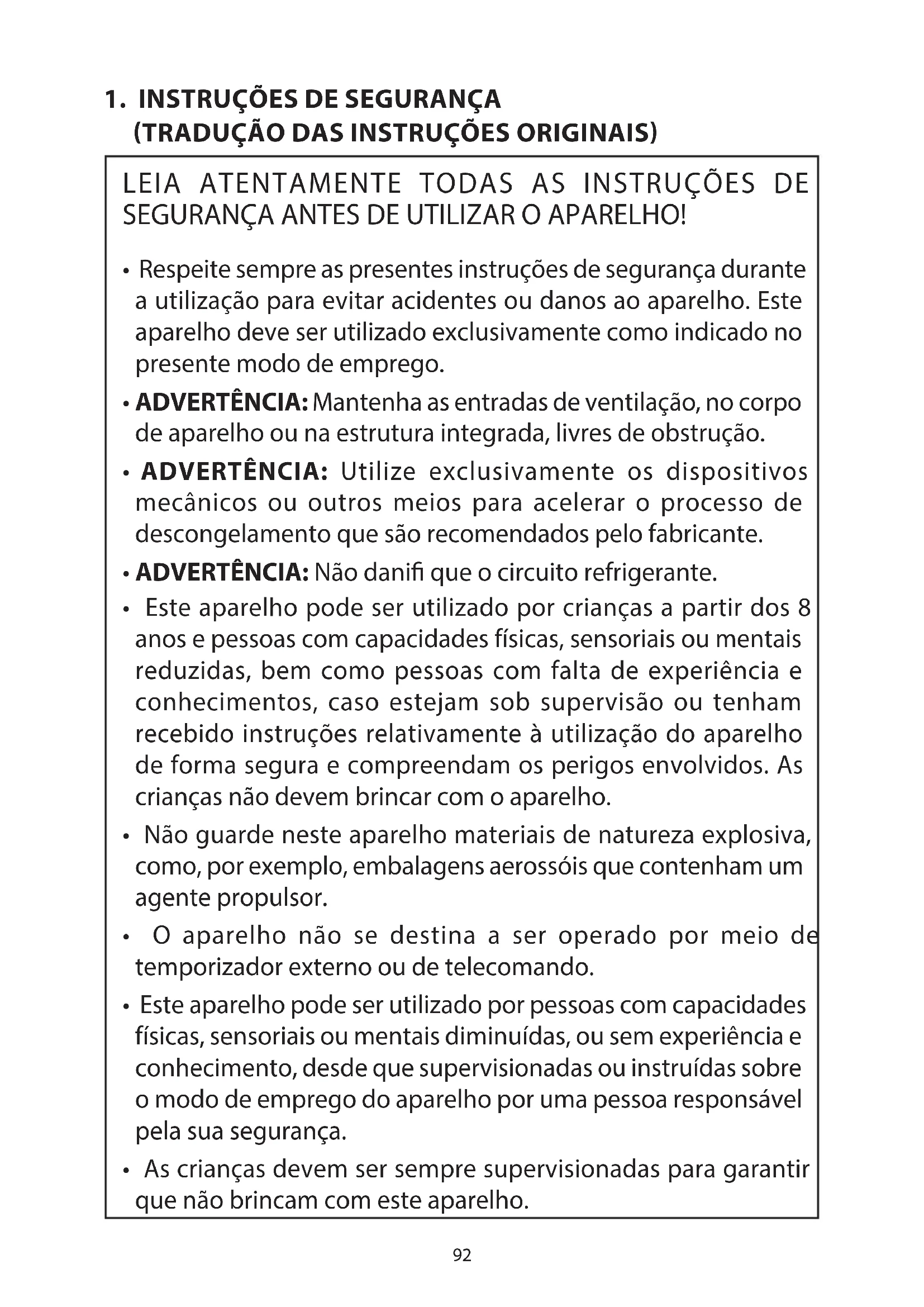 - ADVERTÊNCIA: Utilize exclusivamente os dispositivos mecânicos ou outros meios para acelerar o processo de descongelamento que são recomendados pelo fabricante.