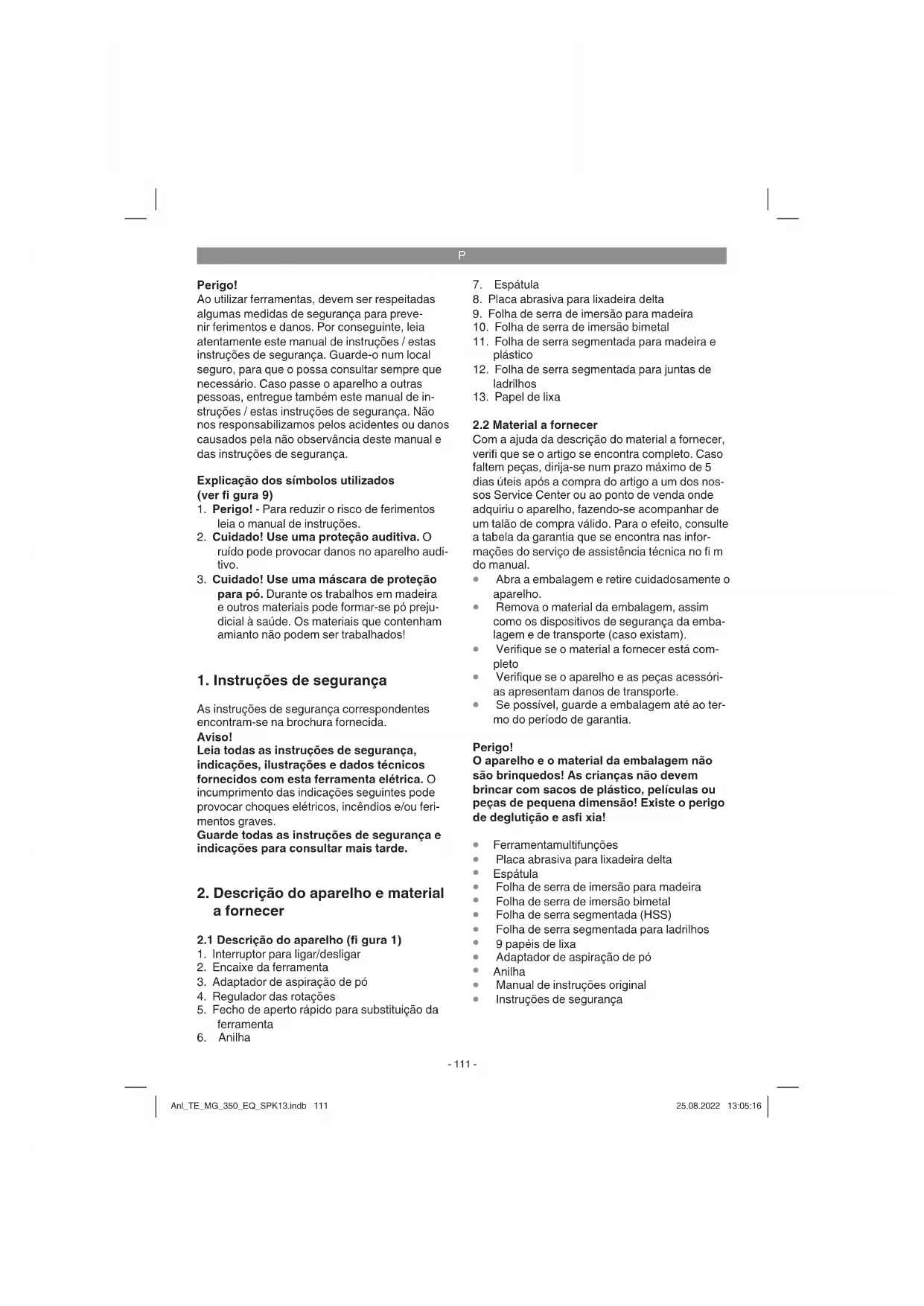 Depois de parar devido à sobrecarga, o apa- relho volta a funcionar automaticamente. Ferramentas de trabalho Cortar: cortar madeira e plástico. Indicações de trabalho: Ao serrar tenha em atenção aos corpos estranhos que possa encont- rar no material e, se necessário, remova-os. Durante o processo de serragem por imersão só podem ser trabalhados materiais macios como a madeira ou o pladur. Anl_TE_MG_350_EQ_SPK13.indb 113Anl_TE_MG_350_EQ_SPK13.indb 113 25.08.2022 13:05:1725.08.2022 13:05:17P