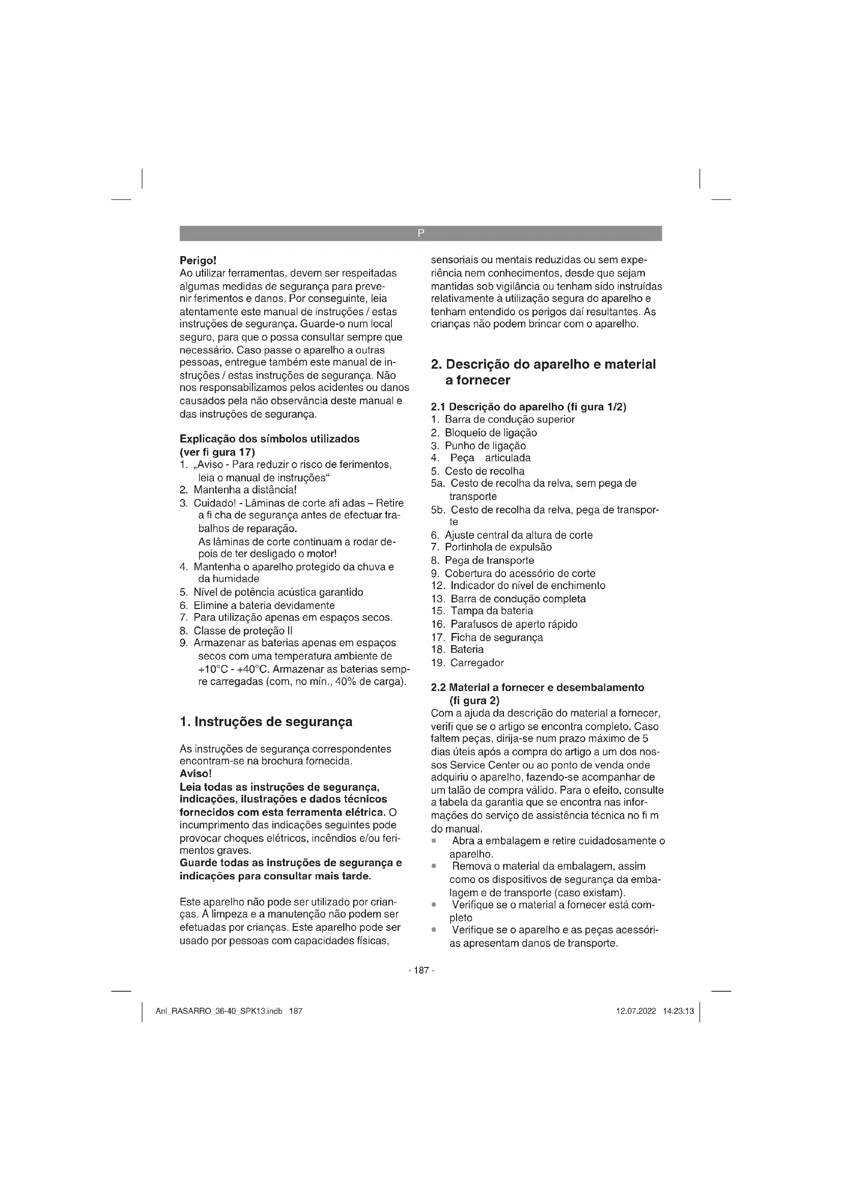 trabalho ou depois de o concluir, volte a remover a fi cha de segurança. Atenção! Para evitar uma ligação inadvertida, o corta- relvas está equipado com um bloqueio de ligação (fi gura 1/pos. 2), que tem de ser premido antes que se possa ativar o punho de ligação (fi gura 1/ pos. 3). O corta-relvas desliga-se assim que se larga o punho de ligação. O arranque pode de- morar alguns segundos. Repita várias vezes este procedimento para ter a certeza de que o seu aparelho funciona corretamente. Antes de efetuar trabalhos de reparação ou manutenção no apa- relho, certifi que-se de que a lâmina não está a girar e de que a fi cha de segurança está retirada. Aviso! Nunca abra a portinhola de expulsão enquanto o dispositivo de recolha é esvazia- do e o motor ainda estiver a funcionar. Uma lâmina em rotação pode causar ferimentos graves. Fixe sempre bem a portinhola de expulsão e o cesto de recolha da relva. Antes de os remover, deve desligar sempre o motor. A distância de segurança predeterminada pela barra de guia entre a carcaça da lâmina e o utiliz- ador tem de ser respeitada. Preste uma atenção especial ao cortar a relva e ao alterar a direcção junto a taludes e declives. Certifi que-se de que está numa posição segura, use calçado antider- rapante, maleável e calças compridas. Corte a relva sempre em sentido transversal ao declive. Por motivos de segurança o corta-relvas não pode ser utilizado em declives superiores a 15 graus. Muito cuidado ao recuar e ao puxar o corta- relvas. Existe o perigo de tropeçar! Indicações para cortar a relva adequadamente Ao cortar a relva é recomendado que a passa- gem de corte apanhe uma parte da relva anterior- mente cortada de modo a garantir a uniformidade do corte. Trabalhe apenas com uma lâmina afi ada e em perfeitas condições, para que as pontas da relva não fi quem retalhadas e a relva seque fi cando amarela. Para conseguir um corte uniforme da relva con- duza o corta-relvas em linhas rectas. As linhas devem sobrepor-se sempre em alguns centímet- ros, para eliminar eventuais marcas. O tempo de funcionamento da bateria e o ren- dimento por superfície em metros quadrados com uma carga de bateria dependem em grande medida das características da relva (p. ex. densi- dade, humidade, comprimento, altura de corte…) e da velocidade de corte (velocidade de passada normal). Para a adaptação individual do rendi- mento por superfície recomendamos a cortar a relva mais vezes, com uma maior altura de corte e a uma velocidade moderada. Ligar e desligar o aparelho frequentemente durante o processo de corte da relva reduz igualmente o rendimento por superfície. Se o tempo de funcionamento da bateria (rendimento por superfície) não for satis- fatório apesar das medidas acima mencionadas, a solução pode ser a utilização de baterias com uma maior capacidade (Ah). O número de vezes que a relva deve ser cortada depende apenas da rapidez com que ela cresce. Durante a época de crescimento máximo (Maio a Junho) a relva deve ser cortada duas vezes por semana, durante os restantes meses do ano apenas uma vez por semana. A altura de corte deve situar-se entre os 4 e os 6 cm e a relva deverá crescer entre 4 a 5 cm antes de ser nova- mente cortada. Caso a relva tenha crescido um pouco mais, não deve cometer o erro de cortá-la de imediato à altura normal. Isso prejudica a relva. Nunca corte mais de metade da altura da relva. Mantenha o lado inferior da carcaça do corta-rel- vas limpo e remova impreterivelmente os detritos de relva. Os detritos difi cultam o arranque, afec- tam a qualidade do corte e a expulsão de relva. Nos declives, efectue o corte no sentido transver- sal ao declive. Pode evitar o eventual deslizamen- to do corta-relvas colocando-o numa posição inc- linada, para cima. Seleccione a altura de corte de acordo com o comprimento real da relva. Efectue várias passagens, de modo a que o desbaste da relva não ultrapasse os 4 cm de uma só vez. Desligue o motor antes de realizar qualquer cont- rolo da lâmina. Lembre-se de que a lâmina ainda continua a girar durante alguns segundos depois de ter desligado o motor. Nunca tente parar a lâmina. Verifi que regularmente se a lâmina está correctamente fi xada, em bom estado e bem afi ada. Caso contrário, afi e ou substitua a lâmina. Caso a lâmina em movimento bata num objecto, Anl_RASARRO_36-40_SPK13.indb 191Anl_RASARRO_36-40_SPK13.indb 191 12.07.2022 14:23:1412.07.2022 14:23:14P