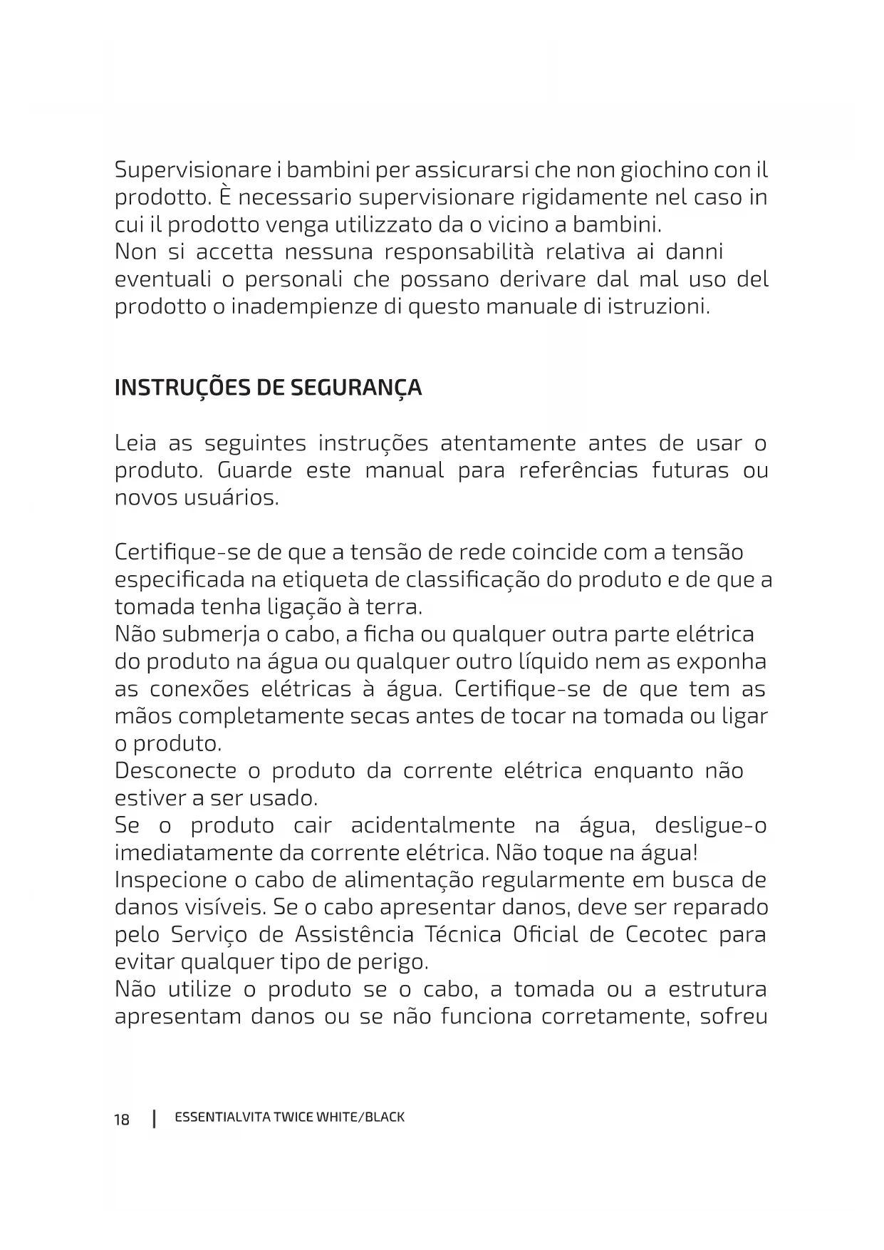 Encontre gratuitamente o manual do aparelho EssentialVita Twice CECOTEC em formato PDF.