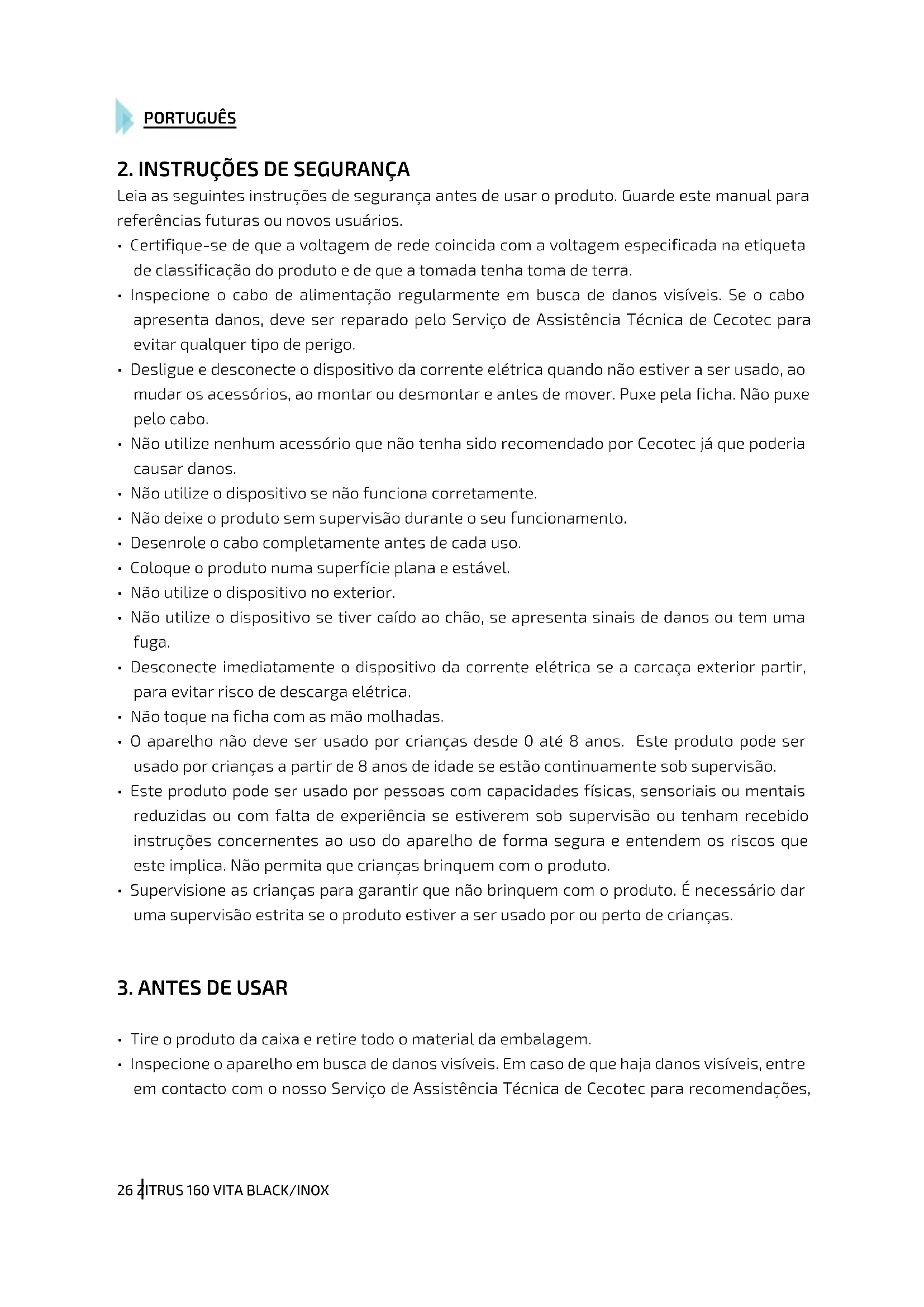 - Inspecione o aparelho em busca de danos visíveis. Em caso de que haja danos visíveis, entre em contacto com o nosso Serviço de Assistência Técnica de Cecotec para recomendações,PORTUGUÊS