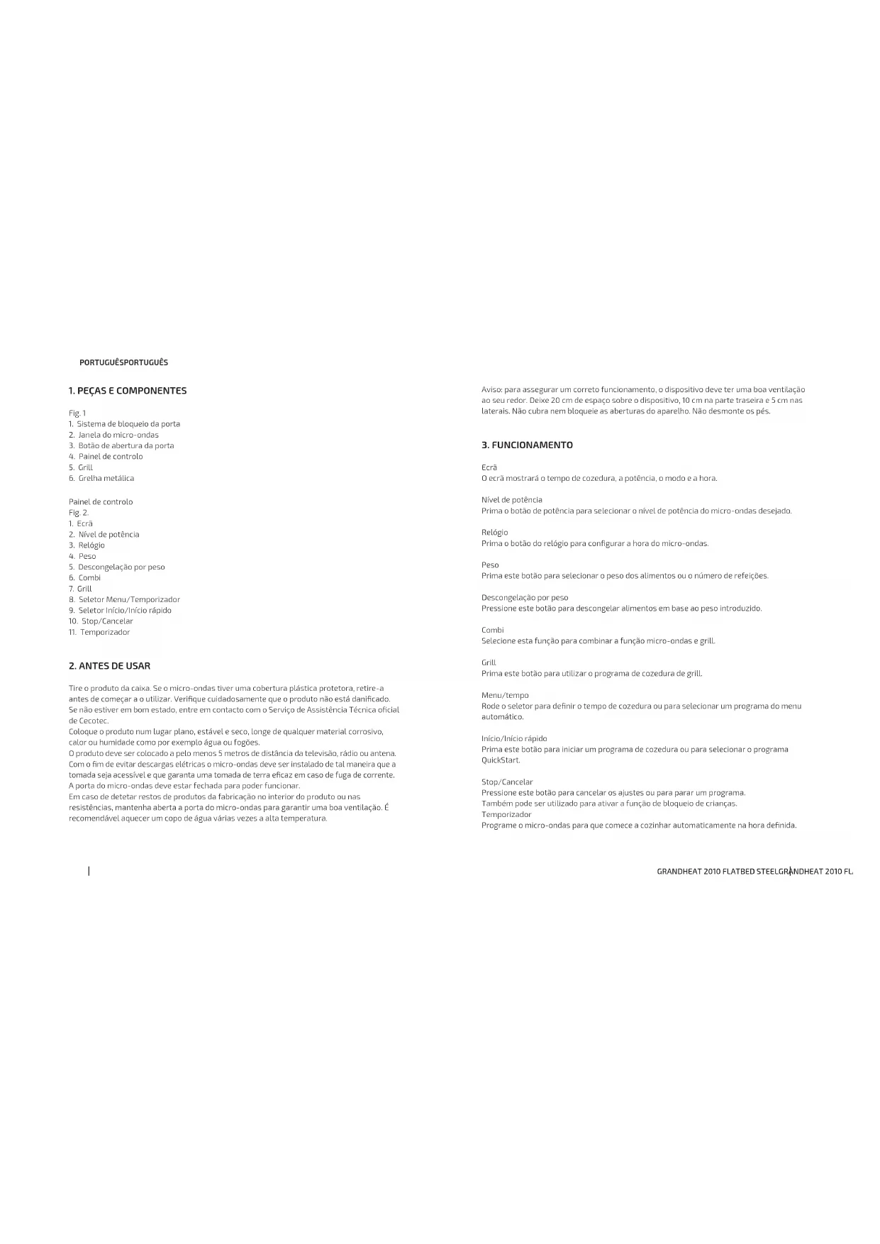 QuickStart Ao selecionar este programa, o aparelho cozinhará os alimentos num curto espaço de tempo à potência máxima (100 % de potência micro-ondas). O tempo máximo programável por este programa é de 10 minutos. Abra a porta e coloque a comida no micro-ondas. Feche a porta. Pressione o botão QuickStart repetidamente para selecionar o tempo de cozedura desejado. O dispositivo começará a funcionar automaticamente. Cada vez que pressionar o botão de Início/Início rápido, o tempo de cozedura aumentará em 30 segundos. Descongelação por peso O micro-ondas pode ser utilizado para descongelar carne, frango ou marisco por peso. O nível de potência e o tempo de descongelação são programados automaticamente segundo o peso congurado. A faixa de peso de alimentos congelados é de 100 g a 1800 g. Exemplo: Descongelar 600 g de gambas. Coloque as gambas dentro do micro-ondas. Prima o botão de descongelar por peso uma vez. Prima o botão de peso para selecionar o peso das gambas. Prima o botão de Início/Início rápido. Aviso: o micro-ondas vai parar a meio do processo de cozedura para lhe lembrar de virar os alimentos. Depois de ter virado os alimentos, prima o botão Início/Início rápido para continuar com o programa de cozedura. Cozedura grill O tempo máximo por este programa é de 95 minutos. O grill é particularmente útil para cozinhar cortes nos de carne, bifes, costeletas, salsichas e frango. Também pode ser utilizado para aquecer sandes e para gratinar. Exemplo: cozinhar no grill durante 12 minutos. Abra a porta e coloque a comida no micro-ondas. Feche a porta. Prima o botão Grill. Rode o seletor de Menu/Temporizador para congurar 12:00. Prima o botão de Início/Início rápido. Combi O tempo máximo de cozedura para ambos os programas Combi é de 95 minutos. Combinação 1 30 % micro-ondas e 70 % grill. Perfeito para cozinhar peixe ou gratinar. Exemplo: congurar a combinação 1 durante 25 minutos. Pressione o botão de Combi. O ecrã mostrará “CO-1”. Rode o seletor de Menu/Temporizador para congurar 25:00. Prima o botão de Início/Início rápido. Como utilizar o micro-ondas O dispositivo emitirá um sinal sonoro a cada vez que pressionar um botão. Uma vez concluído um programa, o dispositivo emitirá um sinal sonoro a cada 2 minutos até que a porta se abra ou até que um botão seja premido. Conguração da hora No modo standby, pressione o botão de Relógio para congurar a hora num sistema de 24 horas. Exemplo: ajuste o tempo de micro-ondas para as 8:30. Pressione o botão do relógio uma vez. Rode o seletor Menu/Temporizador para selecionar 8 horas. Pressione o botão do relógio uma vez para conrmar a hora. Rode o seletor Menu/Temporizador para selecionar 30 minutos. Pressione o botão do relógio uma vez para conrmar os ajustes. Durante o funcionamento, pressione o botão do relógio, a hora atual será mostrada no ecrã durante 3 segundos. Cozinhar no micro-ondas Para cozinhar no modo micro-ondas, basta selecionar o nível de potência pressionando repetidamente o botão de nível de potência e depois utilizar o seletor Menu/Timer para denir o tempo de cozedura desejado. O tempo máximo por este programa é de 95 minutos. Pressione o botão de potência para selecionar o nível desejado. Pressione o botão de nível de potência. Potência de cozedura 1 vez 100 % (100) 2 vezes 80 % (80) 3 vezes 60 % (60) 4 vezes 40 % (40) 5 vezes 20 % (20) 6 vezes 0 % (00) Exemplo: cozinhar 5 minutos a 60% de potência micro-ondas. Abra a porta e coloque a comida no micro-ondas. Feche a porta. Pressione o botão de nível de potência 3 vezes para selecionar 60 %. Rode o seletor Menu/Temporizador para selecionar 05:00. Prima o botão de Início/Início rápido. Aviso: verique o nível de potência durante o funcionamento, premindo o botão de nível de potência.GRANDHEAT 2010 FLATBED STEELGRANDHEAT 2010 FLATBED STEEL 8786