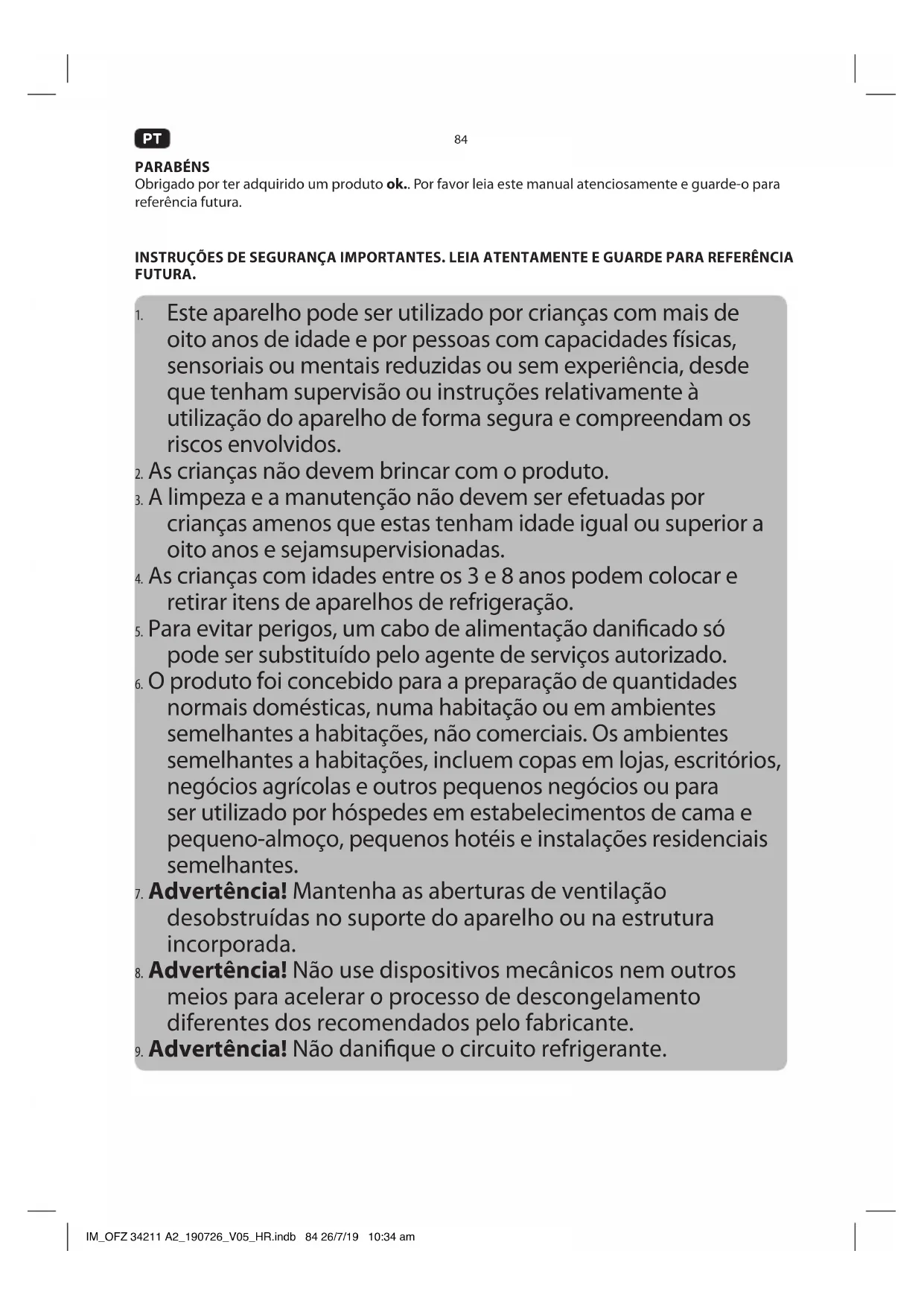 Temperatura ambiente : 10°C - 43°C Capacidade líquida do congelador : 153L Medidas (H x W x D) : 550 X 550 X 1420 mm Profundidade com a porta aberta : 1050 mm Este produto destina-se a ser usado nas classes climáticas de T-SN. Classe climática Temperatura ambiente T +16 to +43 °C SN +10 to +38 °C ELIMINAÇÃO Não elimine o aparelho no lixo doméstico não separado. Retorne-o a um ponto de recolha destinado à reciclagem de lixo electrónico (WEEE). Dessa forma, estará ajudando a preservar recursos e proteger o meio ambiente. Para mais informações, entre em contacto com o seu revendedor ou asautoridades locais. Os uidos refrigerantes devem ser evacuados e eliminados por um especialista qualicado, de acordo com os regulamentos federais e locais, antes do aparelho ser eliminado. IM_OFZ 34211 A2_190726_V05_HR.indb 91 26/7/19 10:34 am92