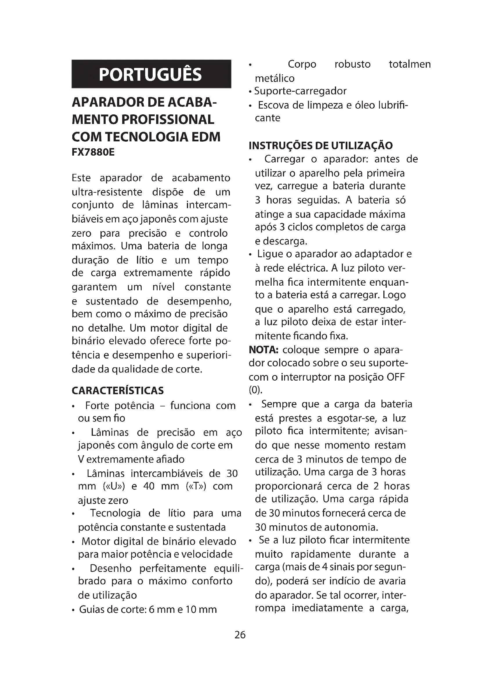 FX7880E Este aparador de acabamento ultra-resistente dispõe de um conjunto de lâminas intercam- biáveis em aço japonês com ajuste zero para precisão e controlo máximos. Uma bateria de longa duração de lítio e um tempo de carga extremamente rápido garantem um nível constante e sustentado de desempenho, bem como o máximo de precisão no detalhe. Um motor digital de binário elevado oferece forte po- tência e desempenho e superiori- dade da qualidade de corte. CARACTERÍSTICAS