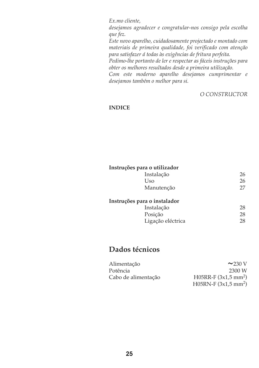 Ex.mo cliente, desejamos agradecer e congratular-nos consigo pela escolha que fez. Este novo aparelho, cuidadosamente projectado e montado com materiais de primeira qualidade, foi verificado com atenção para satisfazer á todas às exigências de fritura perfeita. Pedimo-lhe portanto de ler e respectar as fáceis instruções para obter os melhores resultados desde a primeira utilização. Com este moderno aparelho desejamos cumprimentar e desejamos também o melhor para si. O CONSTRUCTOR INDICE Instruções para o utilizador Instalação Uso Manutenção