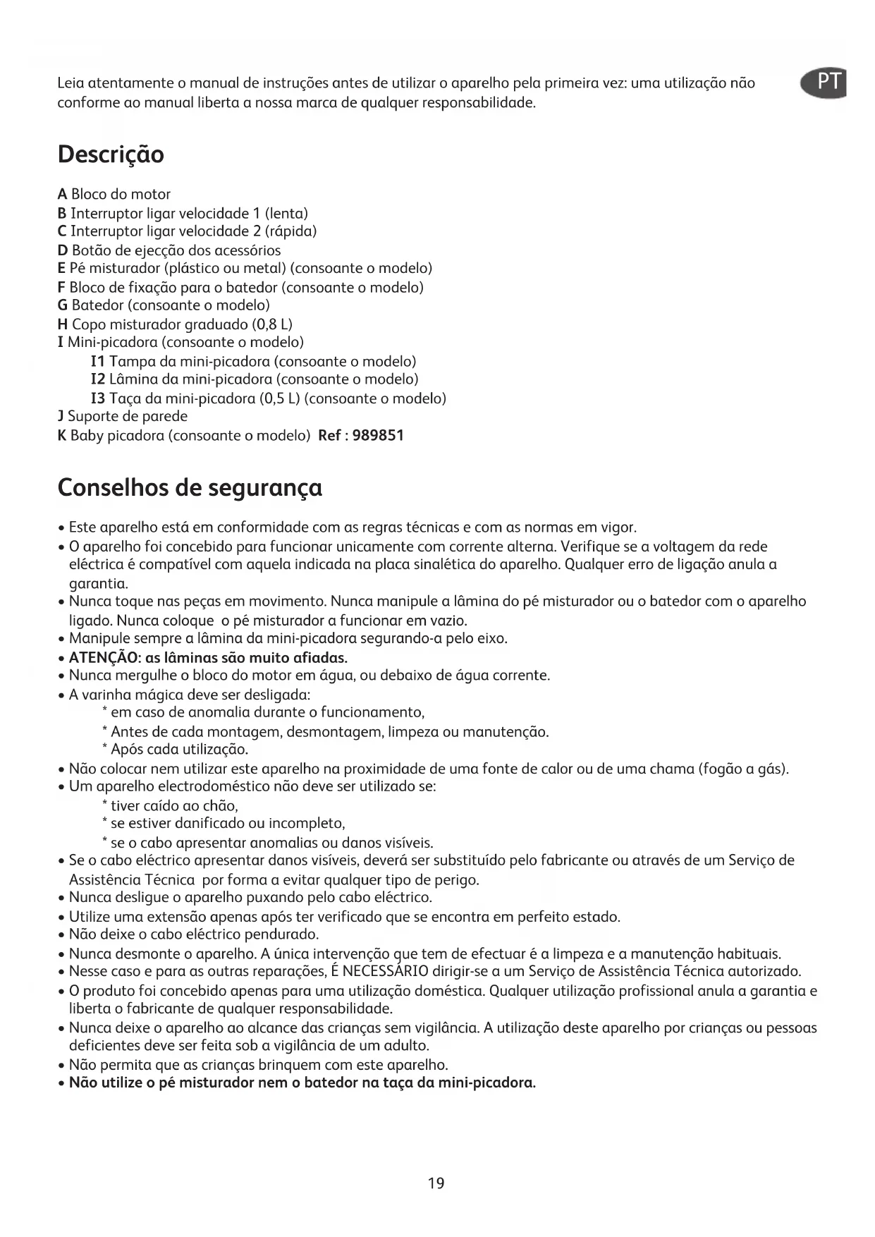 - Aconselhamos a limpar o pé misturador rapidamente após cada utilização. Se as partes de plástico ficarem tingidas com alimentos, por exemplo com cenoura, limpe-os com um pano embebido em óleo ali mentar, antes de os lavar como habitualmente. Arrumação Utilize o suporte de parede (J) para ter sempre a varinha mágica ao alcance da mão. Para fixar o suporte de parede, perfure horizontalmente dois pontos de fixação, distantes um do outro de 30 mm, e em seguida coloque os parafusos de fixação respeitando o sentido. Produto eléctrico ou electrónico em fim de vida Participemos na protecção do meio ambiente! O seu aparelho contém inúmeros materiais valorizáveis ou recicláveis. Confie o seu aparelho a um ponto de recolha ou caso este não exista a um centro de serviço autorizado para que o seu tratamento seja efectuado.22 İlk kullanım öncesinde kullanma kılavuzunu dikkatlice okuyun: Kullanım talimatları haricindeki kullanımlarda üretici sorumluluk kabul etmez. Tanım A Motor ünitesi B Hız düğmesi 1 (düşük hız) C Hız düğmesi 2 (yüksek hız) D Aksesuar çıkarma düğmesi E Mikser başlığı (plastik veya metal) (modele göre) F Çırpma teli başlığı (modele göre) G Çırpma teli (modele göre) H Ölçekli karışım kabı (0,8 litre) I Minideğirmen (modele göre) I1 Minideğirmenin kapağı (modele göre) I2 Minideğirmen bıçağı (modele göre) I3 Minideğirmen kabı (0,5 l) (modele göre) J Duvar askısı K Baby değirmen (modele göre) 989851 Güvenlik talimatları