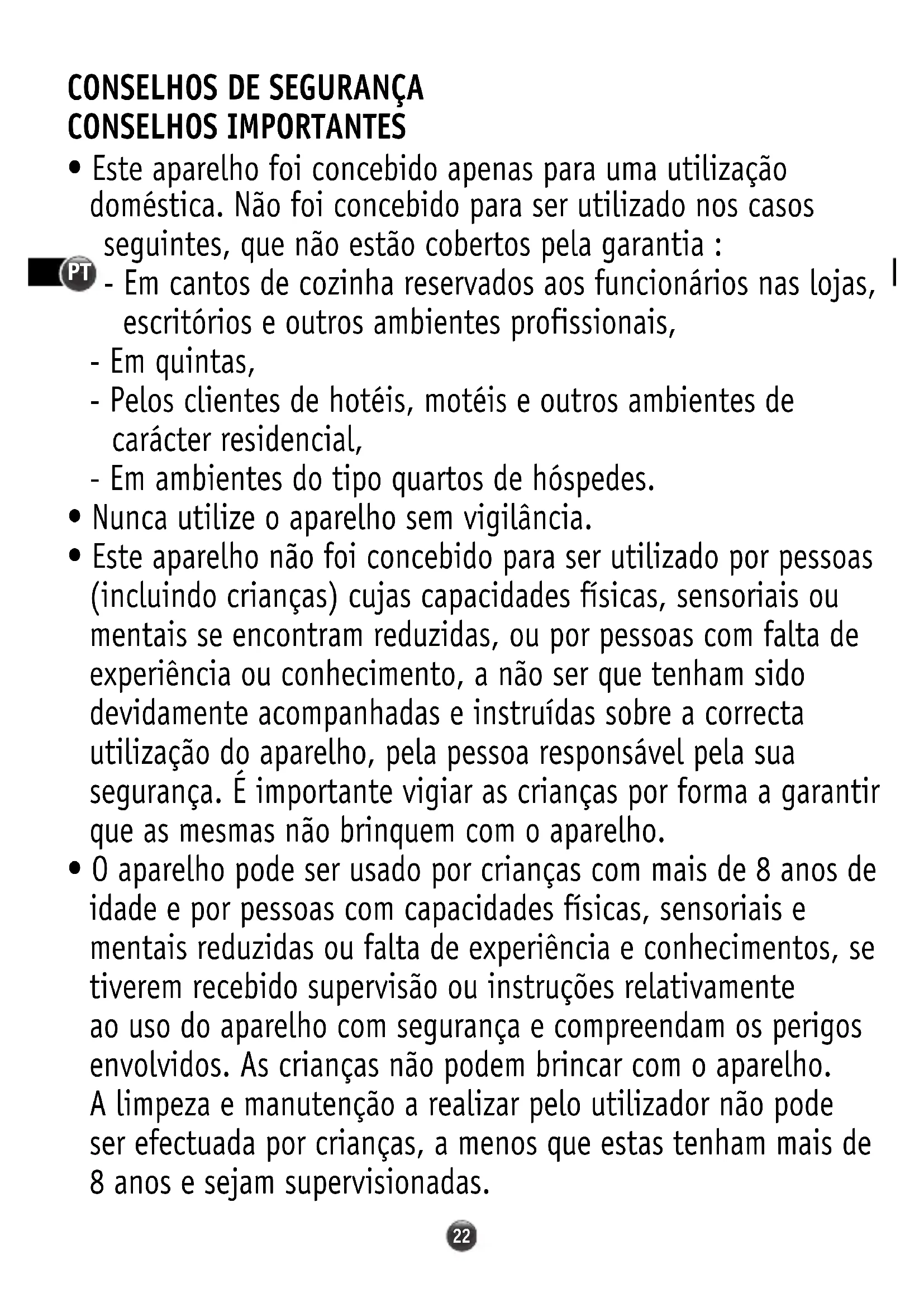 - Este aparelho não foi concebido para ser utilizado por pessoas (incluindo crianças) cujas capacidades físicas, sensoriais ou mentais se encontram reduzidas, ou por pessoas com falta de experiência ou conhecimento, a não ser que tenham sido devidamente acompanhadas e instruídas sobre a correcta utilização do aparelho, pela pessoa responsável pela sua segurança. É importante vigiar as crianças por forma a garantir que as mesmas não brinquem com o aparelho.