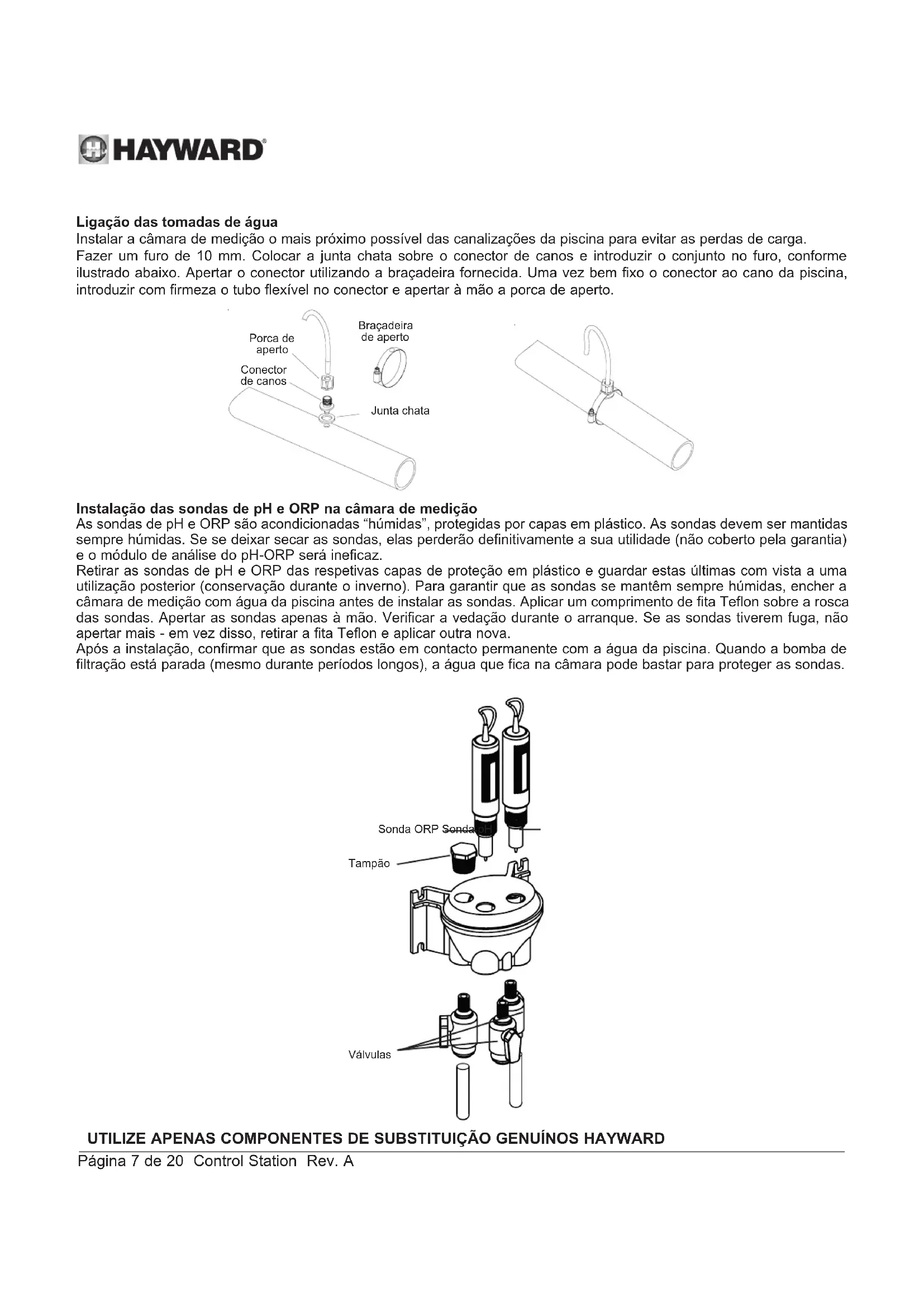 Cloro Sonda de temperatura ÁcidoUTILIZE APENAS COMPONENTES DE SUBSTITUIÇÃO GENUÍNOS HAYWARD Página 7 de 20 Control Station Rev. A Ligação das tomadas de água Instalar a câmara de medição o mais próximo possível das canalizações da piscina para evitar as perdas de carga. Fazer um furo de 10 mm. Colocar a junta chata sobre o conector de canos e introduzir o conjunto no furo, conforme ilustrado abaixo. Apertar o conector utilizando a braçadeira fornecida. Uma vez bem fixo o conector ao cano da piscina, introduzir com firmeza o tubo flexível no conector e apertar à mão a porca de aperto. Braçadeira de aperto Porca de aperto Conector de canos Junta chata Instalação das sondas de pH e ORP na câmara de medição As sondas de pH e ORP são acondicionadas “húmidas”, protegidas por capas em plástico. As sondas devem ser mantidas sempre húmidas. Se se deixar secar as sondas, elas perderão definitivamente a sua utilidade (não coberto pela garantia) e o módulo de análise do pH-ORP será ineficaz. Retirar as sondas de pH e ORP das respetivas capas de proteção em plástico e guardar estas últimas com vista a uma utilização posterior (conservação durante o inverno). Para garantir que as sondas se mantêm sempre húmidas, encher a câmara de medição com água da piscina antes de instalar as sondas. Aplicar um comprimento de fita Teflon sobre a rosca das sondas. Apertar as sondas apenas à mão. Verificar a vedação durante o arranque. Se as sondas tiverem fuga, não apertar mais - em vez disso, retirar a fita Teflon e aplicar outra nova. Após a instalação, confirmar que as sondas estão em contacto permanente com a água da piscina. Quando a bomba de filtração está parada (mesmo durante períodos longos), a água que fica na câmara pode bastar para proteger as sondas. Tampão Sonda ORP Sonda pH VálvulasUTILIZE APENAS COMPONENTES DE SUBSTITUIÇÃO GENUÍNOS HAYWARD Página 8 de 20 Control Station Rev. A Instalação e ligação elétrica Ligar o Control Station a uma tomada de alimentação elétrica permanente. Este circuito deve ser protegido por um dispositivo diferencial de corrente residual (DR) (corrente residual: 30 mA máx.). Cover FL1 pHredoX