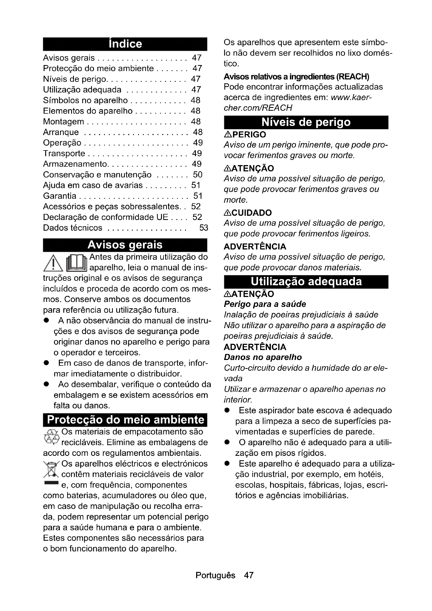 - H05VV-F 2x1,0 H05VV-F 2x1,0 Referencia (EU/GB) 6.650-913.0 6.650-913.0 Longitud del cable m 0,1 0,1Português 47 Índice Avisos gerais Antes da primeira utilização do aparelho, leia o manual de ins- truções original e os avisos de segurança incluídos e proceda de acordo com os mes- mos. Conserve ambos os documentos para referência ou utilização futura. A não observância do manual de instru- ções e dos avisos de segurança pode originar danos no aparelho e perigo para o operador e terceiros. Em caso de danos de transporte, infor- mar imediatamente o distribuidor. Ao desembalar, verifique o conteúdo da embalagem e se existem acessórios em falta ou danos. Protecção do meio ambiente Os materiais de empacotamento são recicláveis. Elimine as embalagens de acordo com os regulamentos ambientais. Os aparelhos eléctricos e electrónicos contêm materiais recicláveis de valor e, com frequência, componentes como baterias, acumuladores ou óleo que, em caso de manipulação ou recolha erra- da, podem representar um potencial perigo para a saúde humana e para o ambiente. Estes componentes são necessários para o bom funcionamento do aparelho. Os aparelhos que apresentem este símbo- lo não devem ser recolhidos no lixo domés- tico. Avisos relativos a ingredientes (REACH) Pode encontrar informações actualizadas acerca de ingredientes em: www.kaer- cher.com/REACH Níveis de perigo PERIGO Aviso de um perigo iminente, que pode pro- vocar ferimentos graves ou morte. 몇 ATENÇÃO Aviso de uma possível situação de perigo, que pode provocar ferimentos graves ou morte. 몇 CUIDADO Aviso de uma possível situação de perigo, que pode provocar ferimentos ligeiros. ADVERTÊNCIA Aviso de uma possível situação de perigo, que pode provocar danos materiais. Utilização adequada 몇 ATENÇÃO Perigo para a saúde Inalação de poeiras prejudiciais à saúde Não utilizar o aparelho para a aspiração de poeiras prejudiciais à saúde. ADVERTÊNCIA Danos no aparelho Curto-circuito devido a humidade do ar ele- vada Utilizar e armazenar o aparelho apenas no interior. Este aspirador bate escova é adequado para a limpeza a seco de superfícies pa- vimentadas e superfícies de parede. O aparelho não é adequado para a utili- zação em pisos rígidos. Este aparelho é adequado para a utiliza- ção industrial, por exemplo, em hotéis, escolas, hospitais, fábricas, lojas, escri- tórios e agências imobiliárias. Avisos gerais p. 47